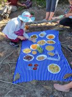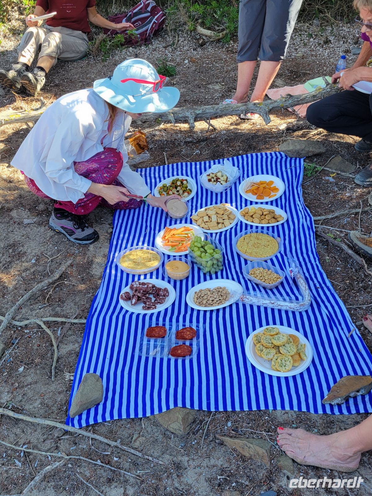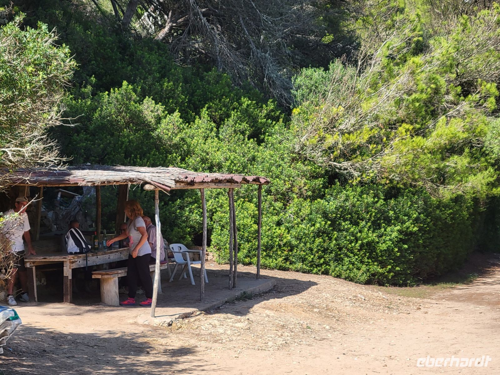 Gegen Mittag erreichen wir eine schattige Stelle in einer hübschen Bucht kurz vor Es Grau. Dort bereiten Isabel und ich das Picknick vor und decken den „Tisch“ mit verschiedenen menorquinischen Köstlichkeiten. Nachdem wir zünftig gespeist haben, folgen wir dem Camí etwa weitere zwei Kilometer bis Es Grau.