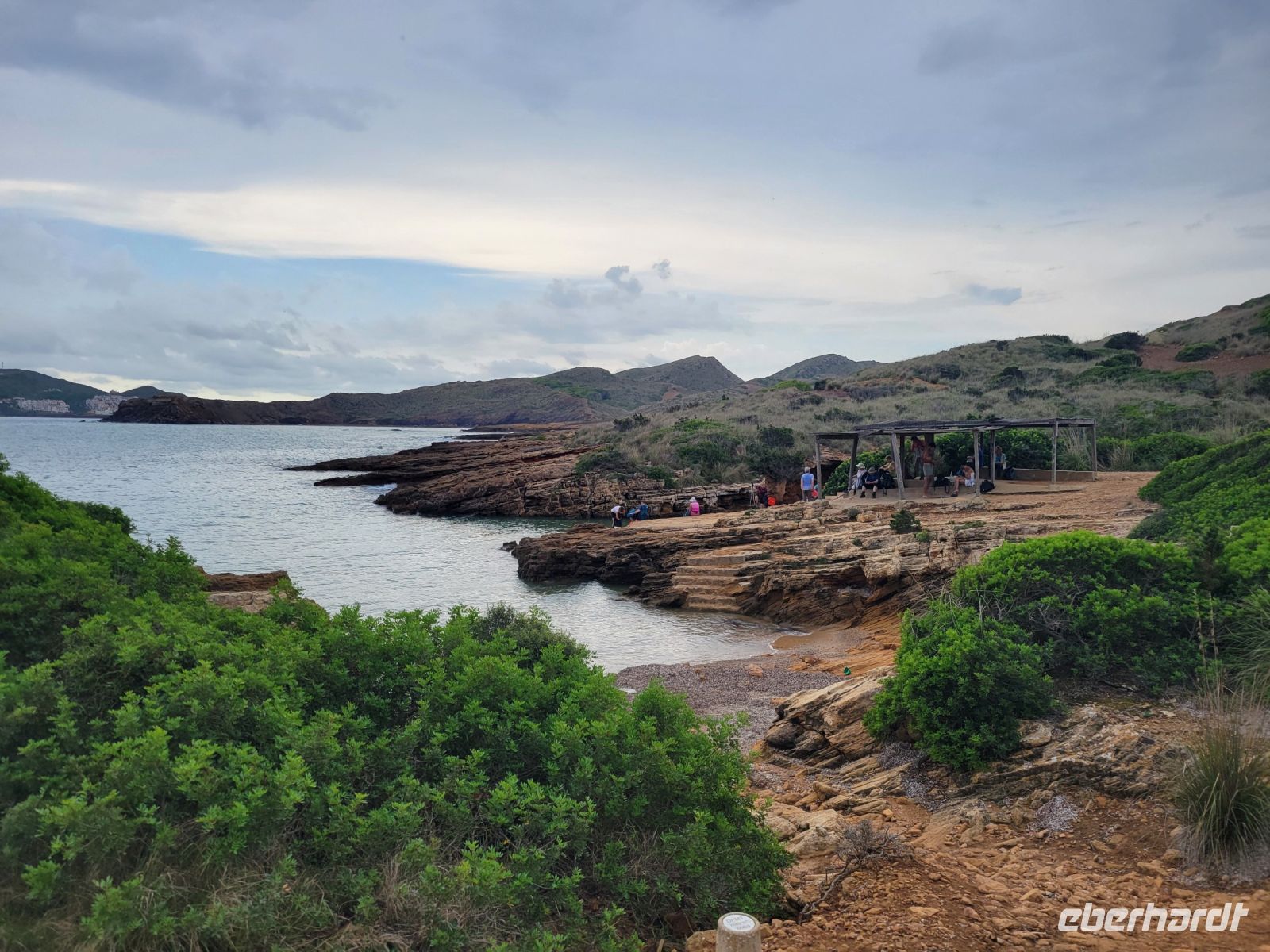 Zur Mittagszeit erreichen wir die naturbelassene Playa de Binigaus. Wir rasten an einem von einem Dach beschatteten Tisch mit Bänken und manche lassen sich zu einem Bad im türkisfarbenen Meer verlocken.