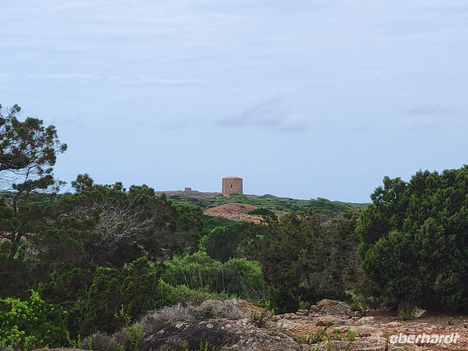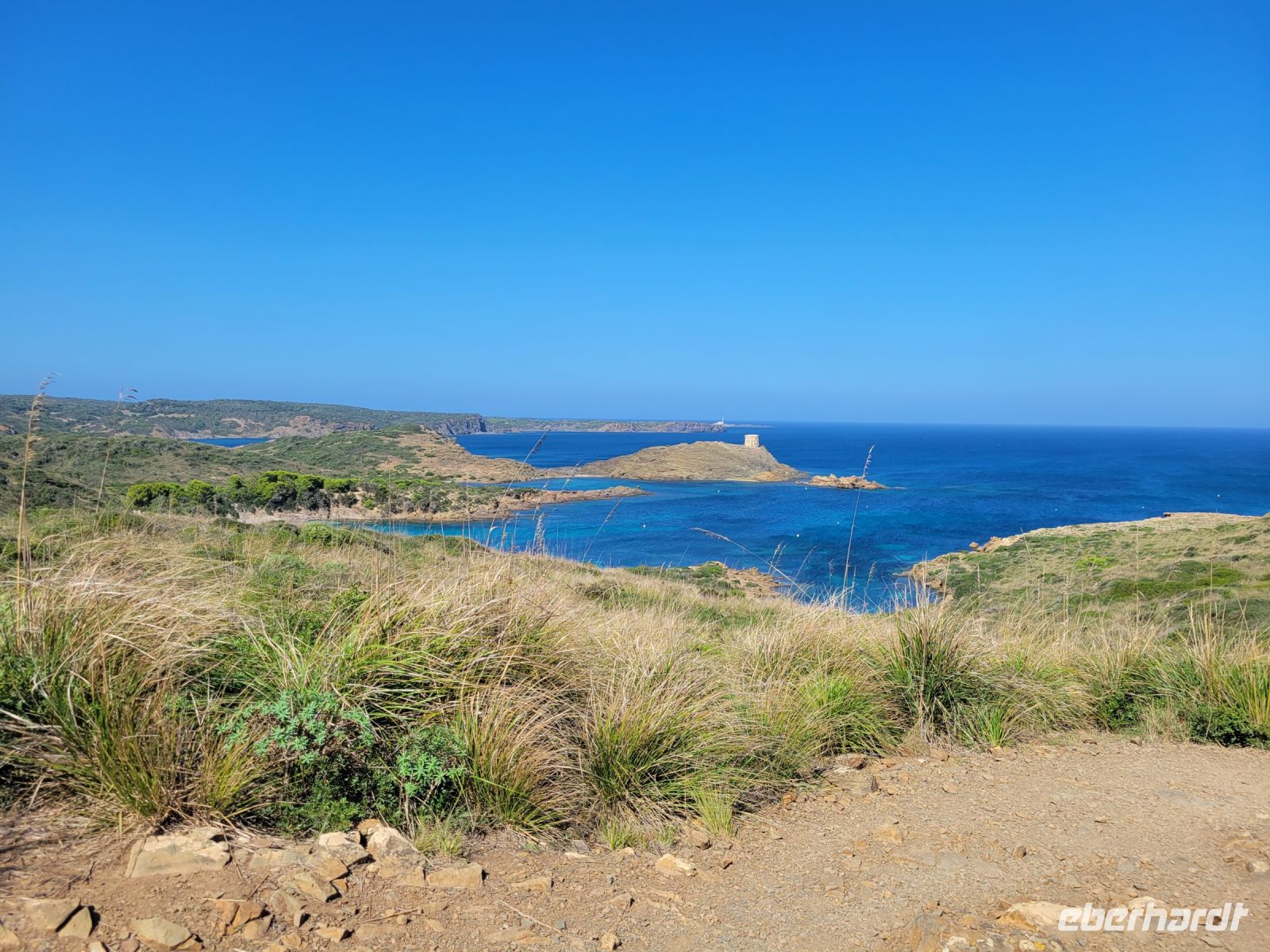 Bei herrlichem Wetter mit blauem Himmel und Sonnenschein genießen wir unsere Wanderung, die uns erneut entlang hübscher Buchten und der Küste führt. Unterwegs sehen wir einen trutzigen Wehrturm und den Fährhafen von Ciutadella.