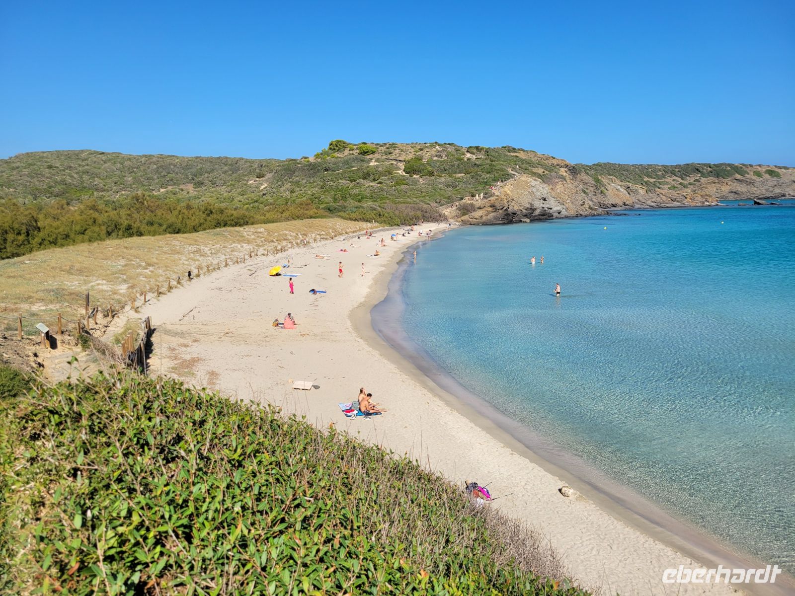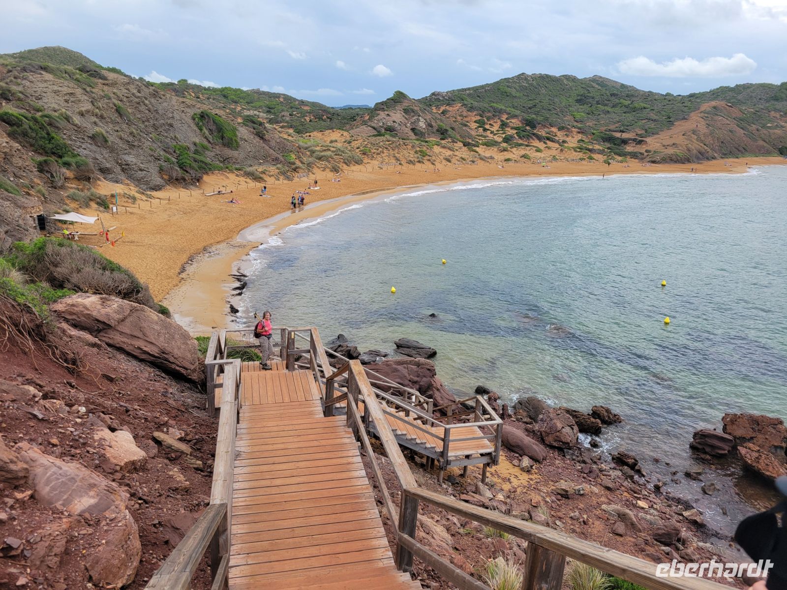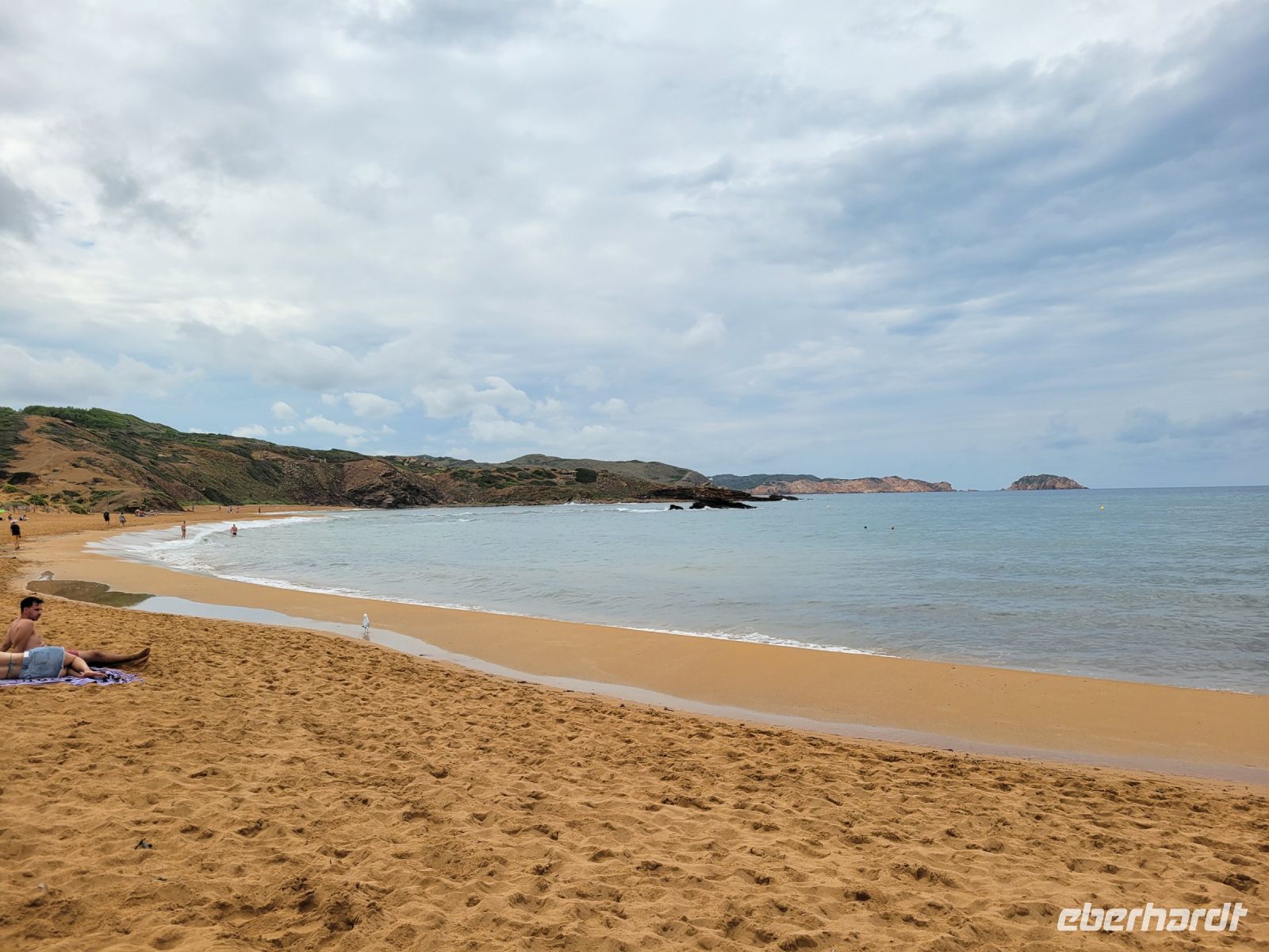 Am weitläufigen, rötlichen Sandstrand der Cala de Cavalleria legen wir unsere Mittagsrast ein und schauen uns das Strandleben an. Dann setzen wir unsere Wanderung fort.