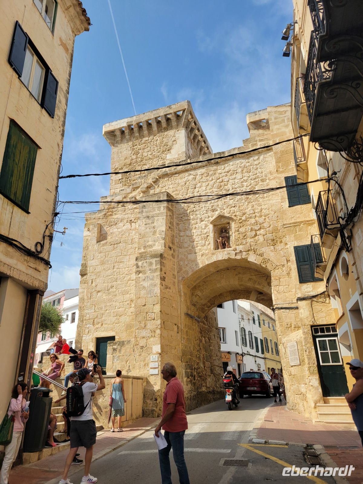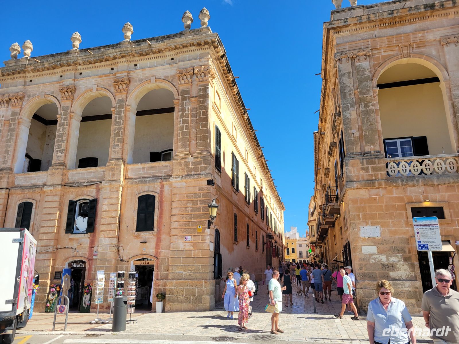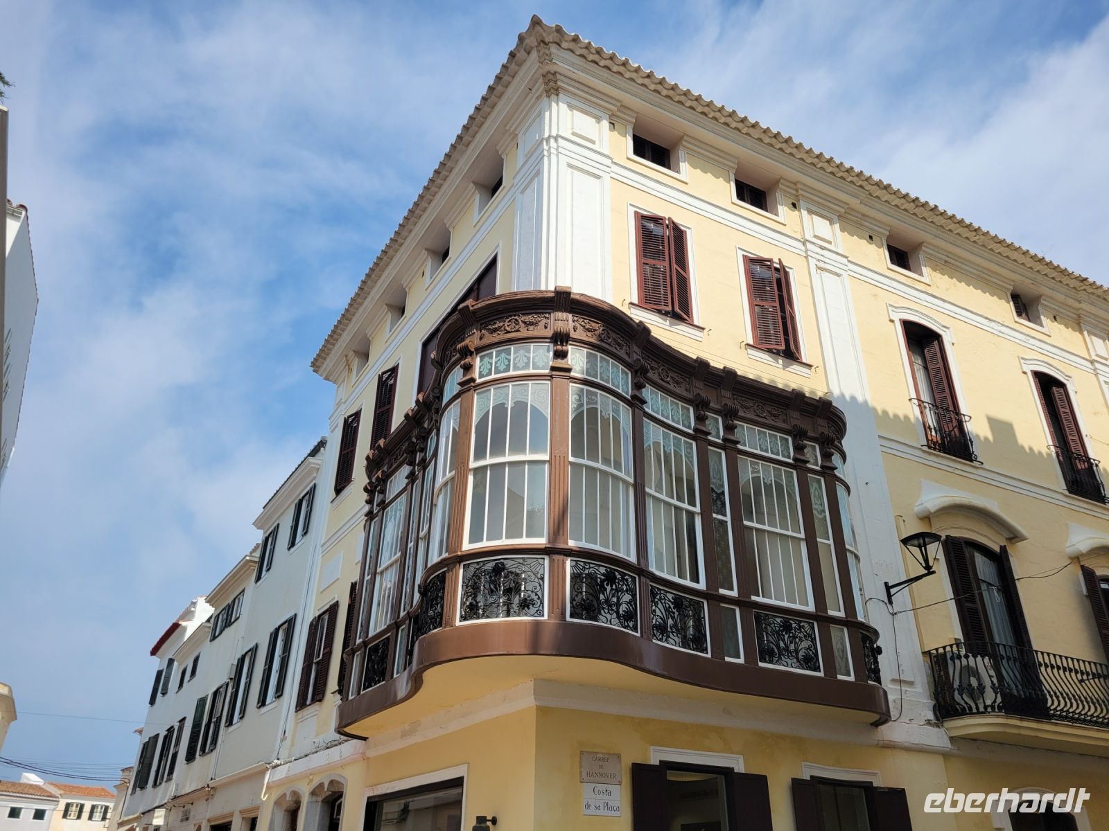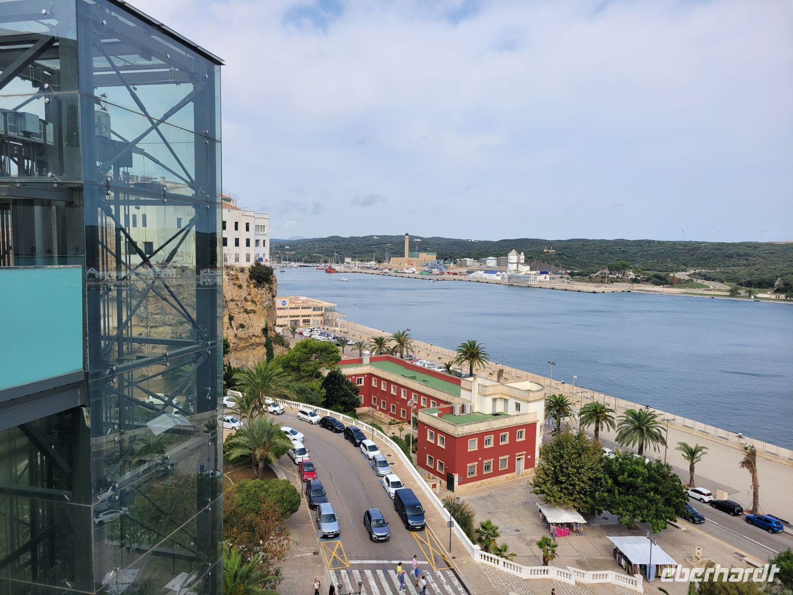 Vom Parkplatz nahe der „Estacio Maritima“ gehen wir ein Stück am Hafenbecken entlang, die andere Straßenseite ist von Bars, Restaurants, Geschäften gesäumt. Oberhalb thront die Altstadt von Mahon. Diese erreichen wir ganz bequem über einen Glasaufzug. Oben angekommen genießen wir zunächst den Ausblick auf einen Teil des Hafenbeckens. Dann starten wir mit Isabel zu unserem Rundgang, der uns unter anderem an der Markthalle, am Theater, einem Stück der alten Stadtmauer und einem ehemaligen Eingangstor zur Stadt – erbaut um 1500 –, dem Rathaus von Mahon und einem schönen Aussichtspunkt, dem „Mirador de Ses Monges“ vorbeiführt. Wir spazieren über imposante Plätze, durch malerische Gassen mit Geschäften, Cafés und lebhaftem Treiben. Isabel macht uns darauf aufmerksam, dass die Architektur der Gebäude, beispielsweise Erker, Fenster und Haustüren, von den Briten beeinflusst wurde.