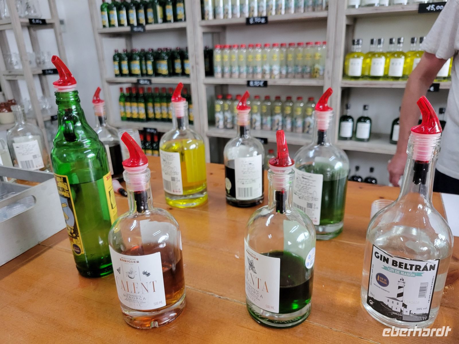 Von unserem Treffpunkt aus geht es dann zum Besuch der „Gin Factory Destilerías Xoriguer“. Die unterschiedlichen Sorten von Gin und Ginlikör stehen auf den Tischen zur Verkostung.