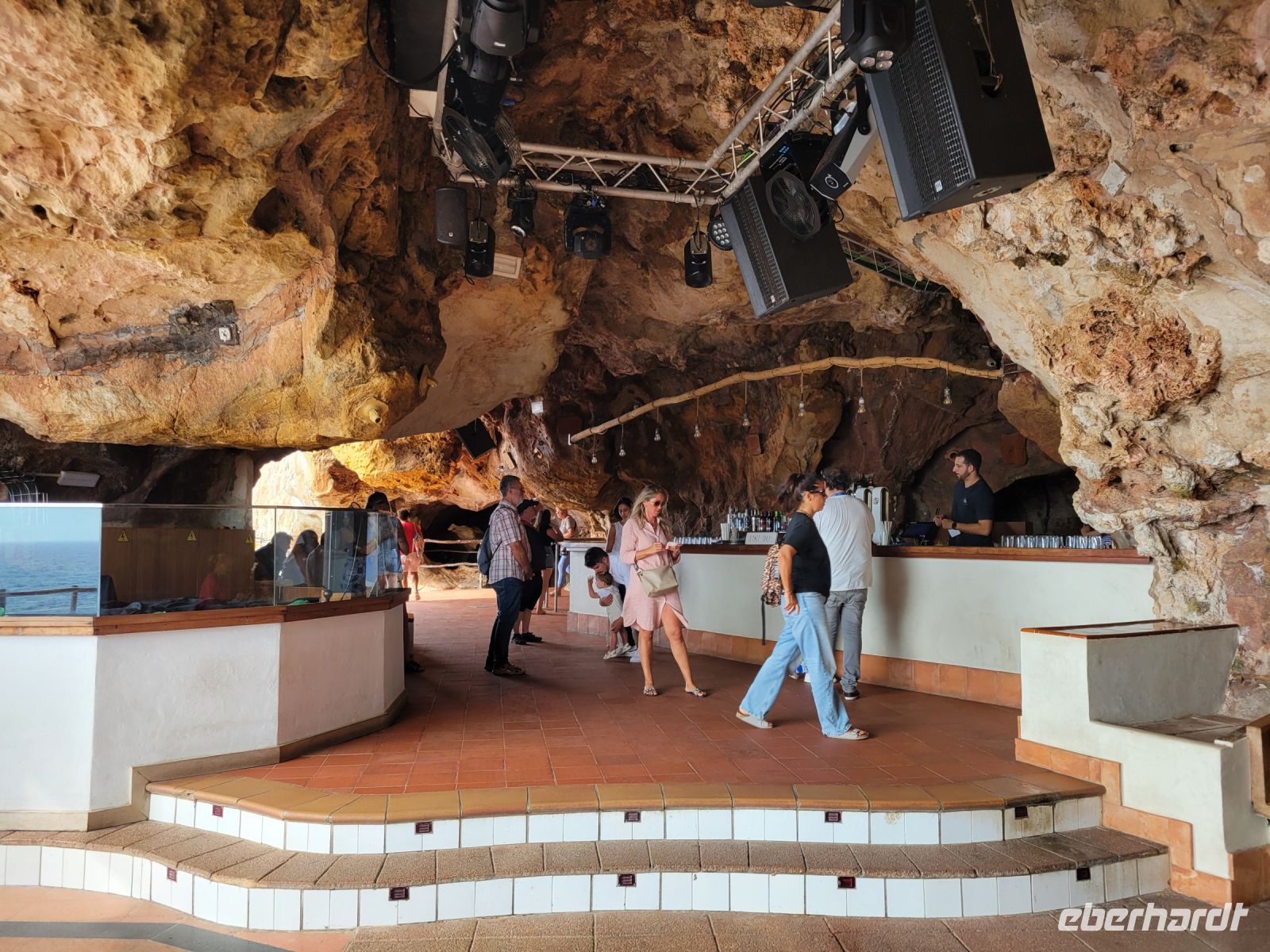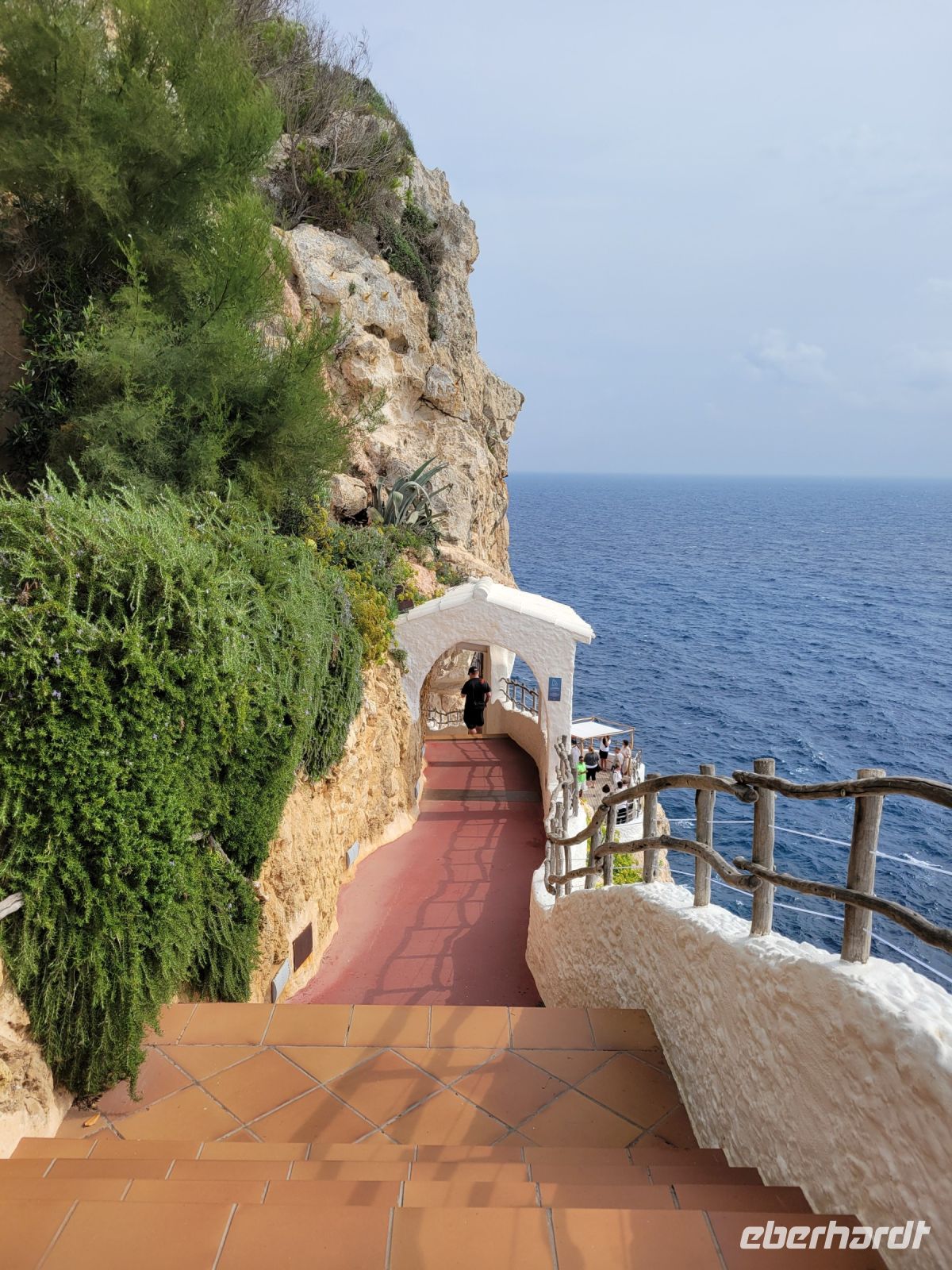 Guter Dinge und erwartungsvoll geht es jetzt zur Cova d'en Xoroi in Cala’n Porter, eine kleine Naturhöhle in der steilen Felswand hoch über dem Meer, in die man über einen in den Fels gehauenen Weg hoch über dem Meer gelangt. Es bieten sich grandiose Ausblicke über das glitzernde Meer.