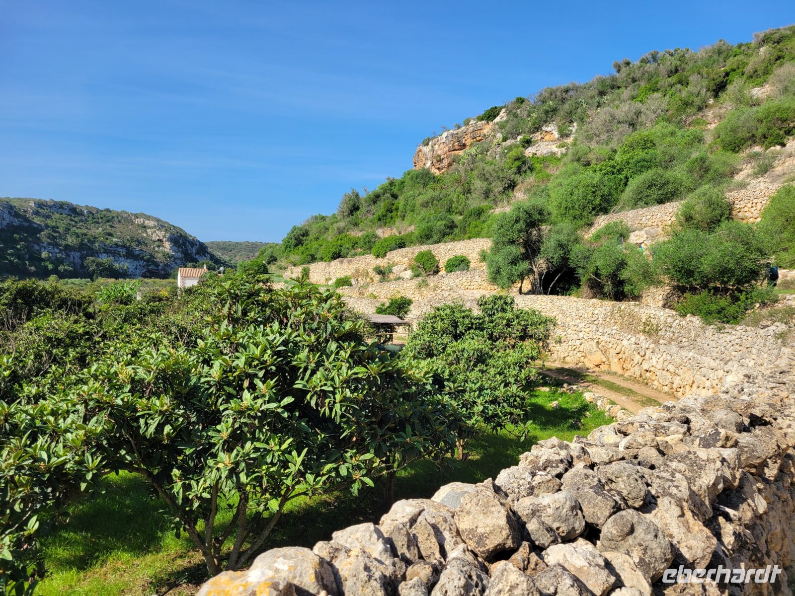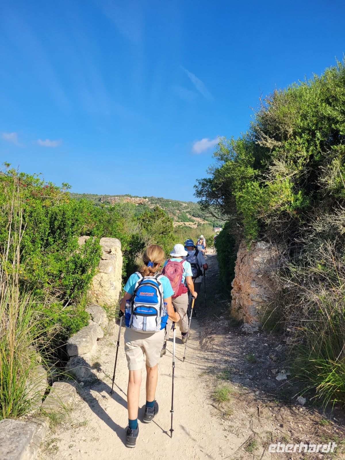 Weiter geht es über Wege, die immer wieder entlang der für Menorca typischen Bruchsteinmauern führen, die in der Landschaft kunstvoll und ganz ohne Mörtel als Begrenzung, aber auch als Schutz vor Erosion aufgeschichtet wurden,