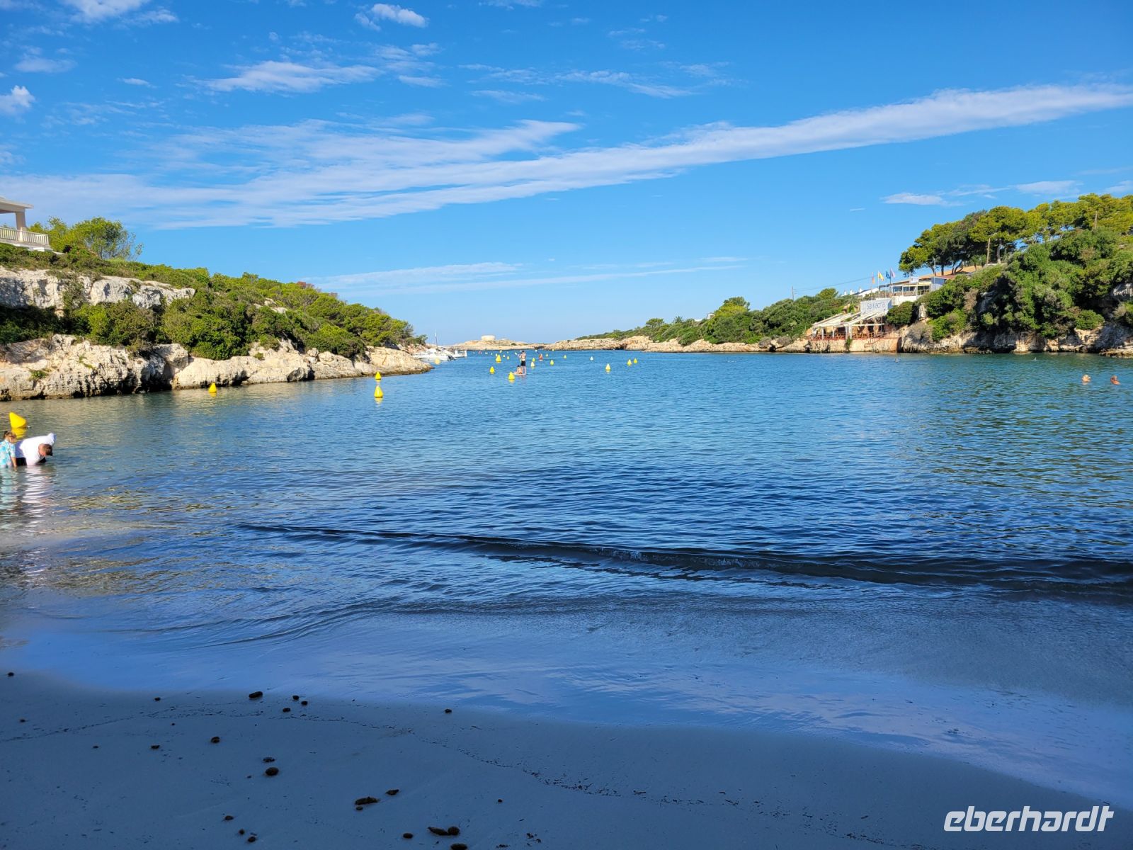 Nach der Rückkehr zum Hotel am späteren Nachmittag nutzen manche die Zeit zu einem Spaziergang durch den Ort und zur Cala Blanca – auf deutsch „Weiße Bucht“. Die kleine Sandbucht mit dem feinen, hellen Sand, malerisch von Klippen umrahmt, liegt etwa 200 Meter von unserem Hotel entfernt und macht ihrem Namen alle Ehre. Das Meer leuchtet türkisfarben blau und lädt zum Abkühlen ein. Mediterrane Pflanzen und zahlreiche Kiefern bestimmen die Vegetation.