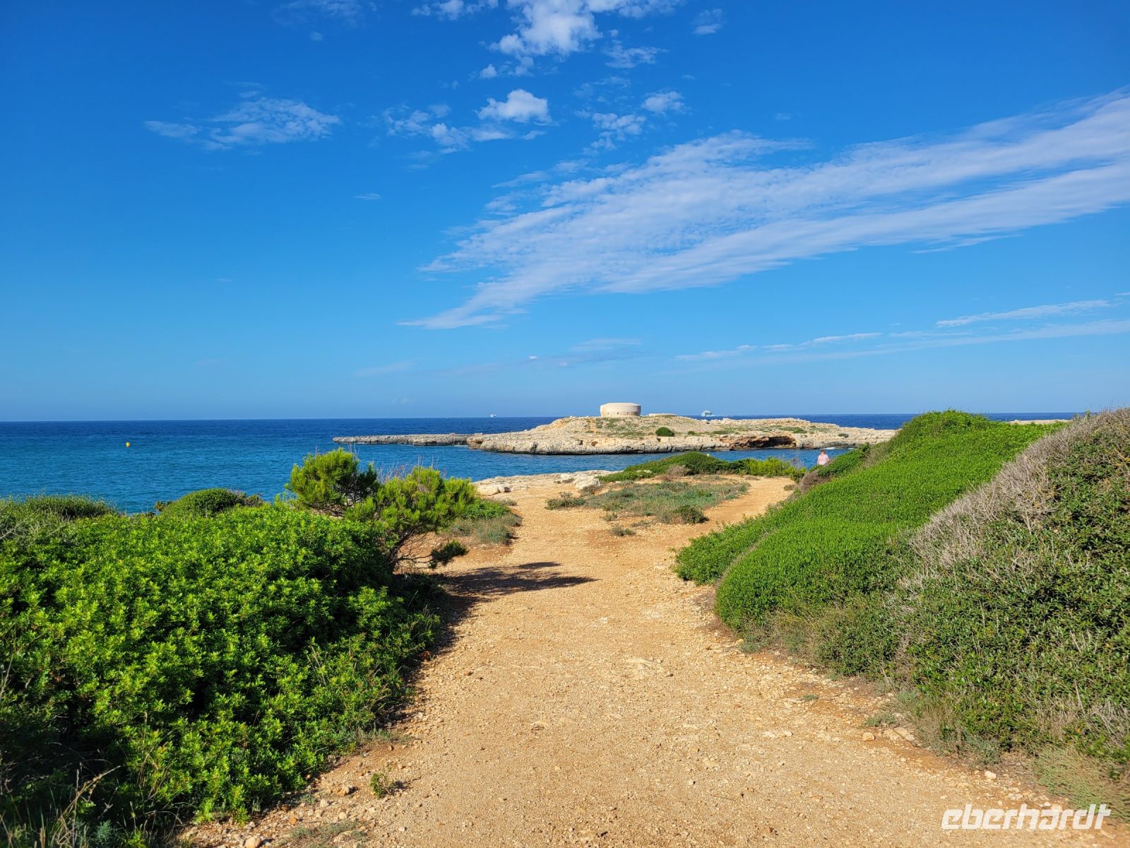 Je weiter wir gelangen, desto grüner wird die Umgebung. Nach etwa 30 bis 40 Minuten passieren wir die Cala Tortuga, die abgelegen und nicht leicht zugänglich ist und sich daher als idealer Rückzugsort für Naturliebhaber und Ruhesuchende anbietet. Dann sehen wir die einsamen Buchten von Cala Morella Nou und der Cala de sa Torreta mit dem beinahe unberührten Strand. Ihren Namen verdankt sie dem britischen Wehrturm. Von unterwegs bietet sich der Ausblick auf die der Küste etwa 200 Meter entfernt vorgelagerte Insel Illa d’en Colom, die auch zum Gebiet des Naturparks S’Albufera des Grau gehört.