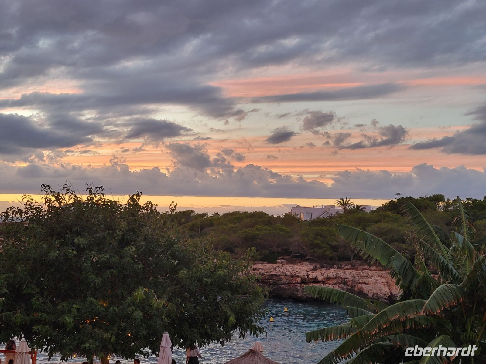 Nachdem wir uns im Vorfeld abgestimmt hatten, den heutigen Sonnenuntergang an einem anderen Ort zu genießen, treffen wir uns alle am frühen Abend zum gemeinsamen Spaziergang dorthin. Unser Ziel ist das Marea Beach House, oberhalb der Cala Blanca gelegen. Die Aussichtsterrasse ist exklusiv für uns reserviert und bietet einen wunderbaren Ausblick auf die Bucht, über das Meer bis nach Mallorca und zum Horizont.