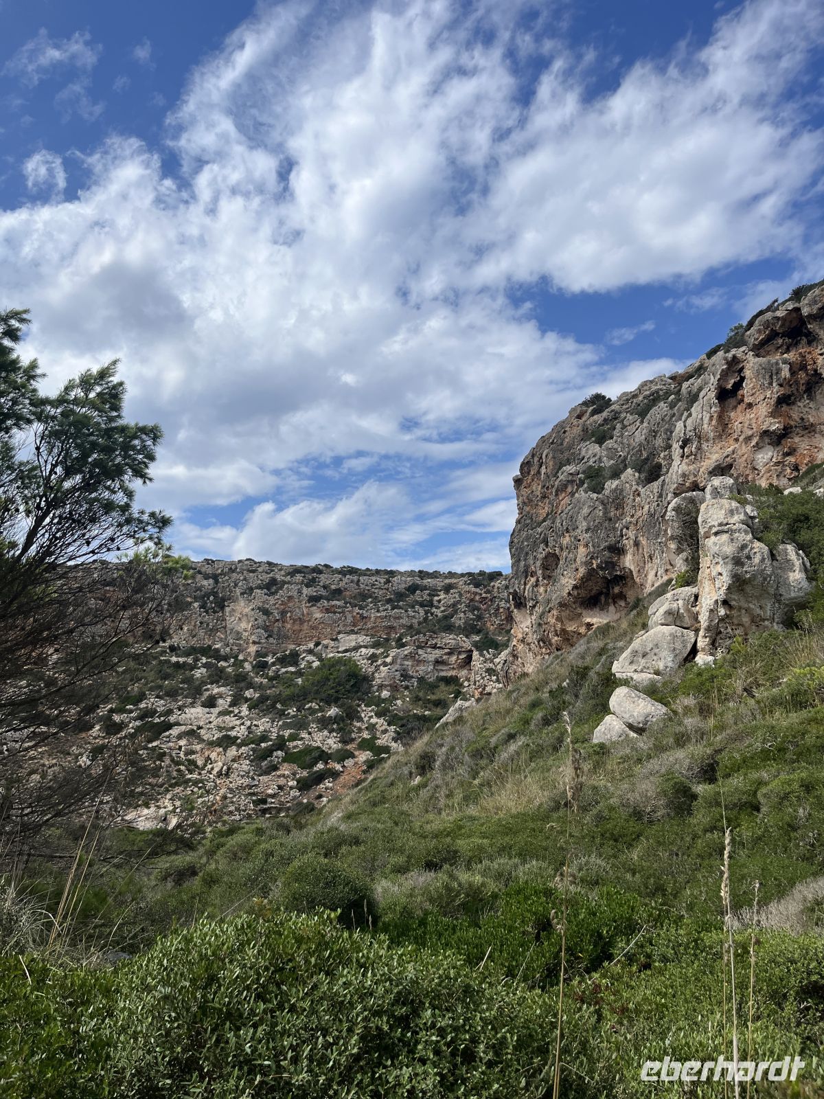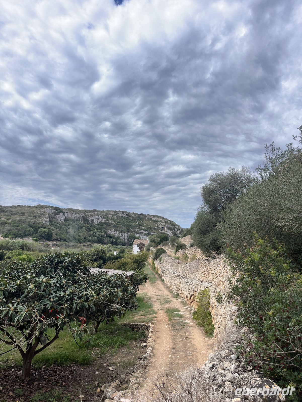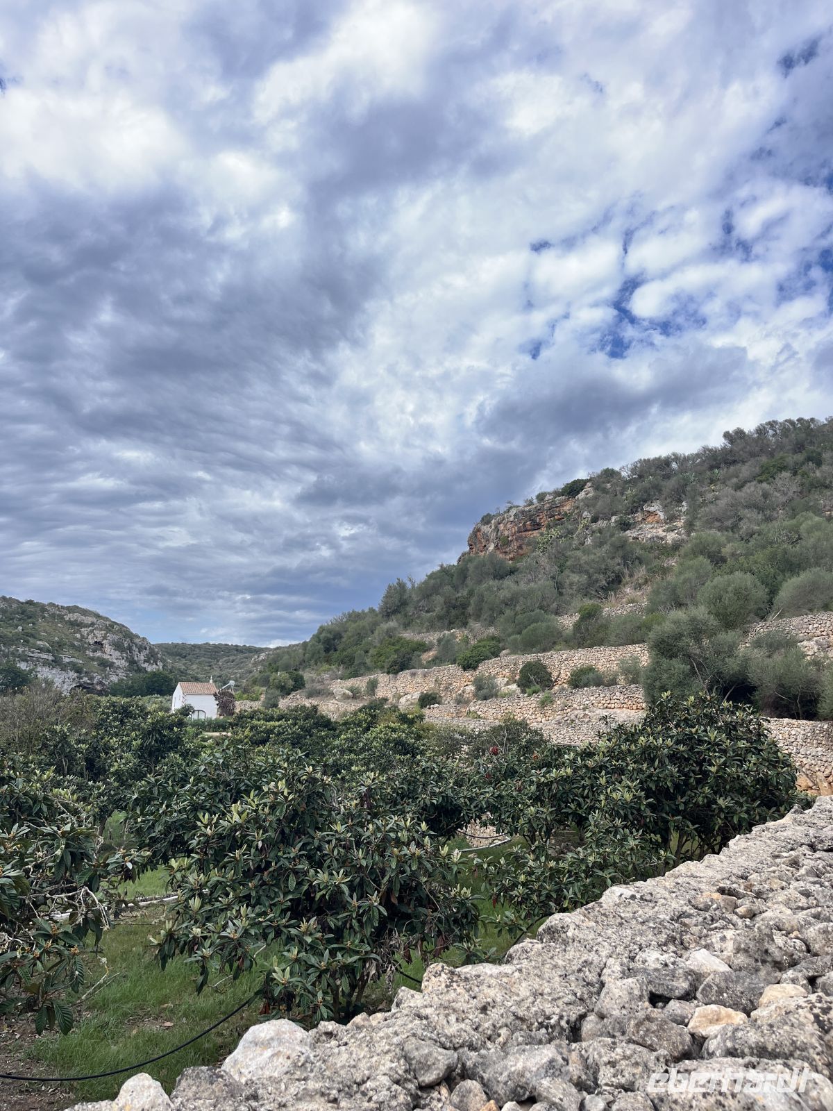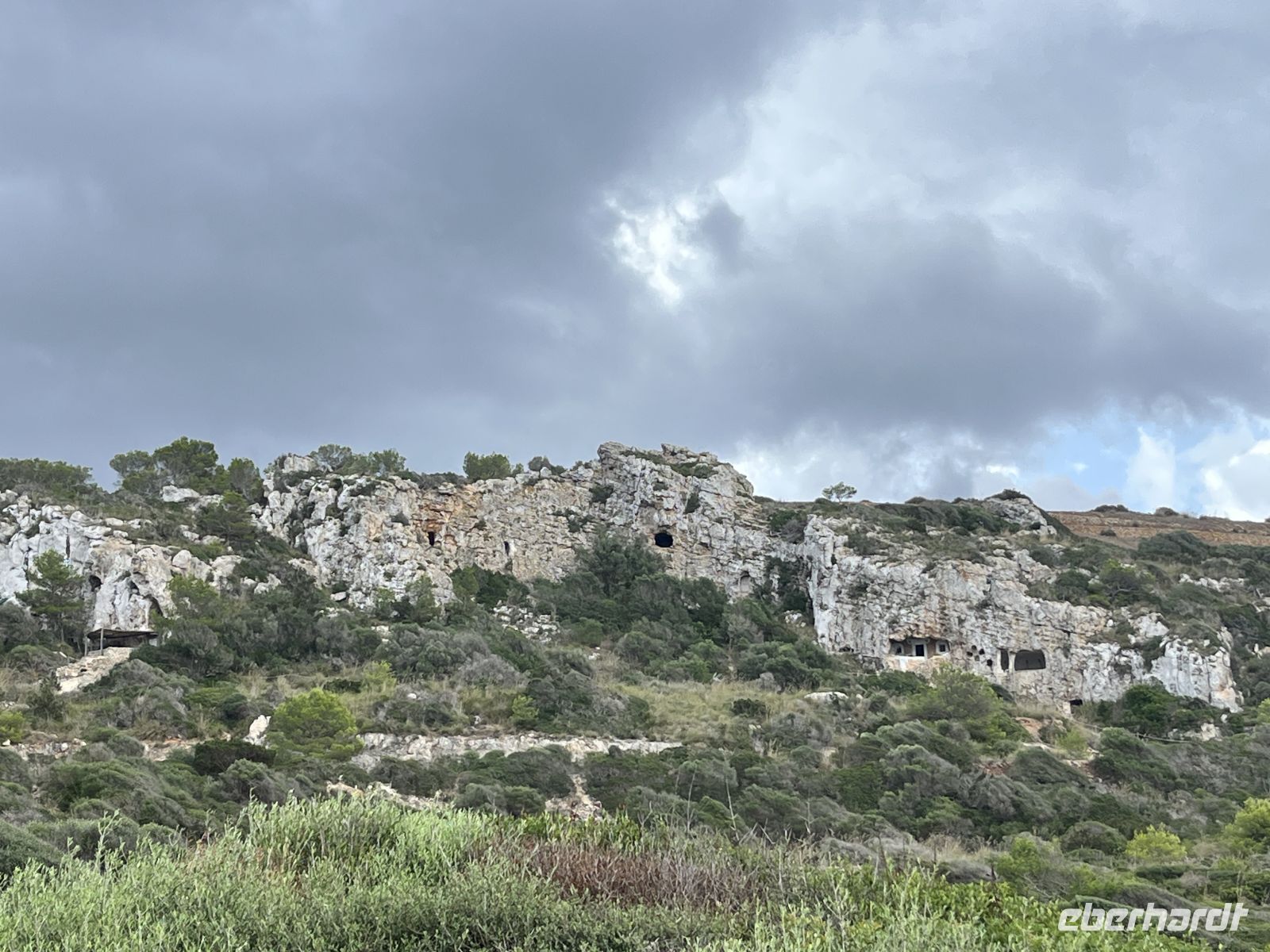 Der Weg führte zunächst durch ein fruchtbares Feuchtgebiet, wo Landwirte zwischen alten Steinmauern Obst und Gemüse anbauen. Sanfte An- und Abstiege wechselten sich ab. Ein Höhepunkt war die malerische Cala Llucalari, eine kleine Bucht, deren Felswände von Höhlen durchzogen sind. Hier legten wir unsere Mittagspause im Schatten ein – ein idyllischer Ort, den man am liebsten noch länger genießen möchte.