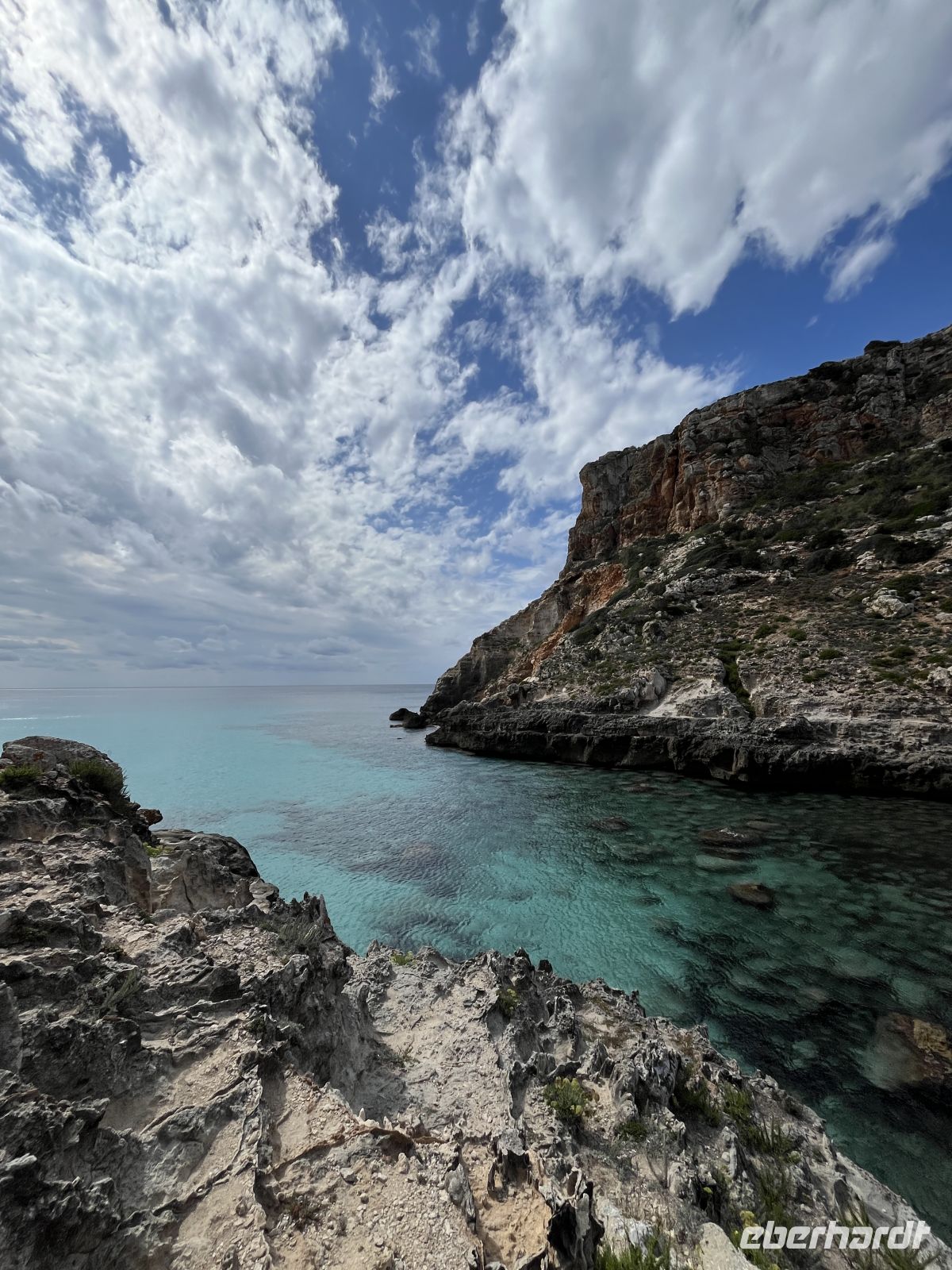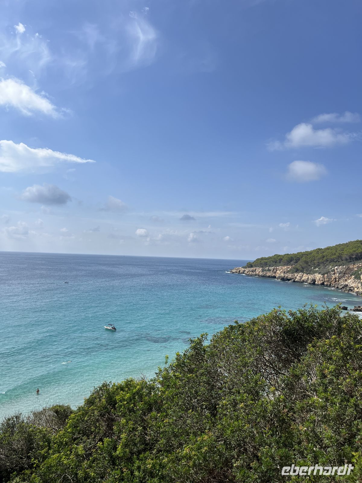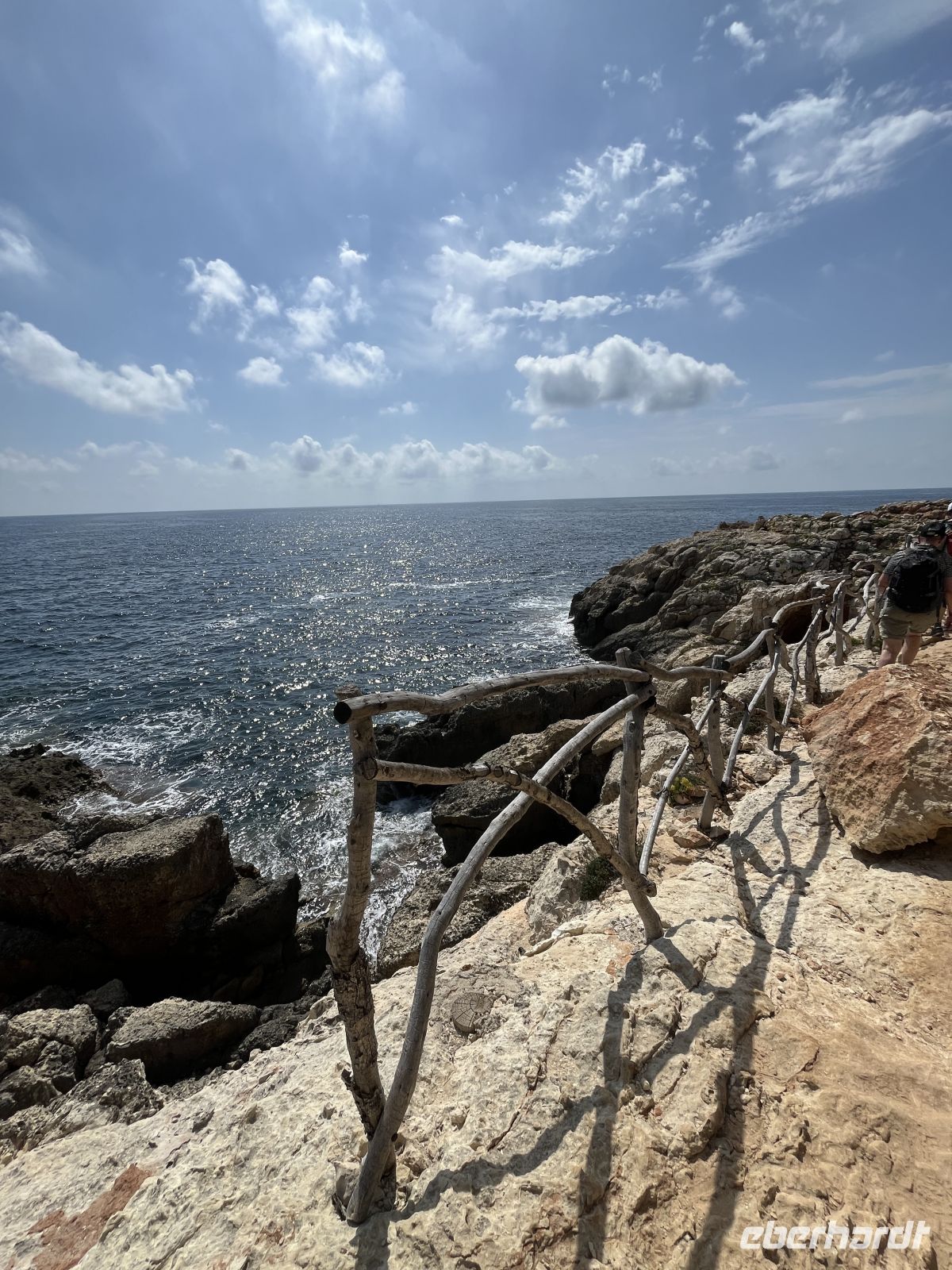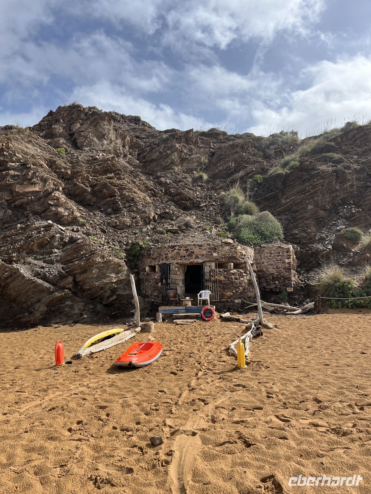 Der Weg führte zunächst durch ein fruchtbares Feuchtgebiet, wo Landwirte zwischen alten Steinmauern Obst und Gemüse anbauen. Sanfte An- und Abstiege wechselten sich ab. Ein Höhepunkt war die malerische Cala Llucalari, eine kleine Bucht, deren Felswände von Höhlen durchzogen sind. Hier legten wir unsere Mittagspause im Schatten ein – ein idyllischer Ort, den man am liebsten noch länger genießen möchte.