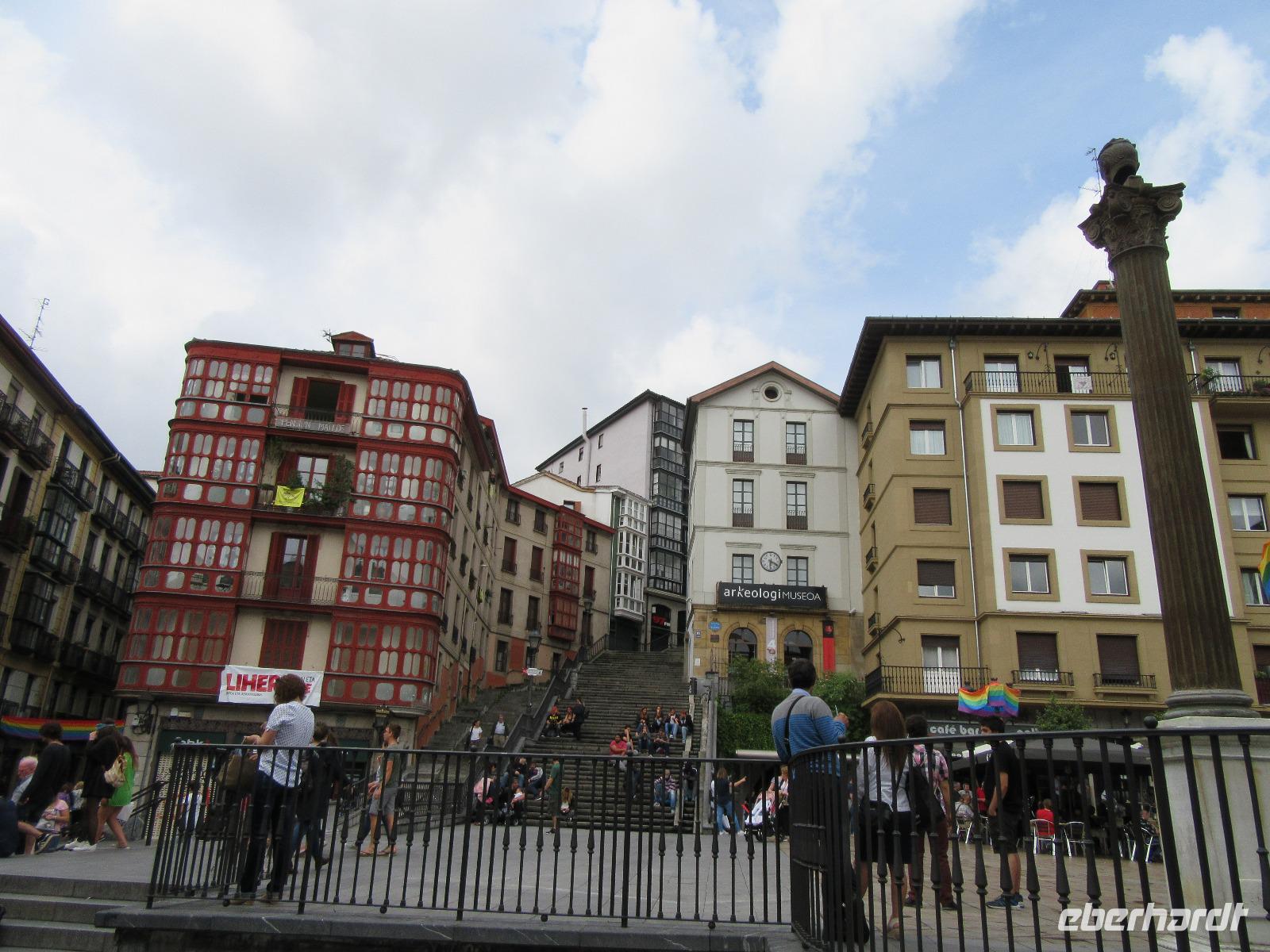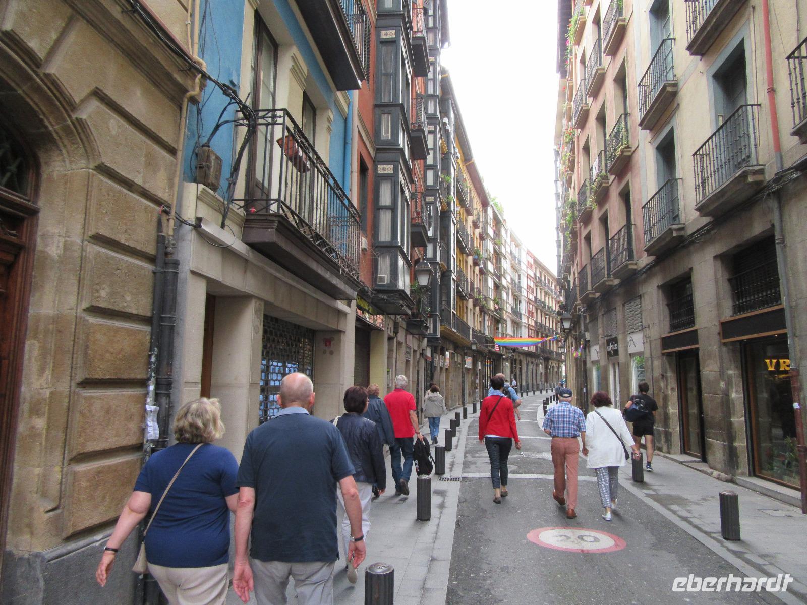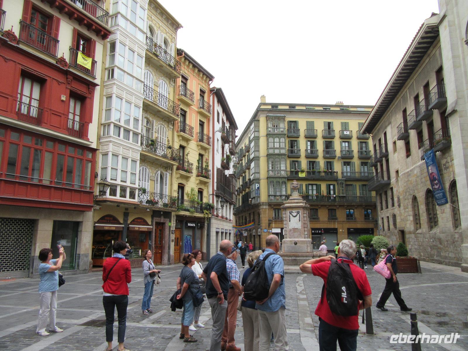 Dann fuhren wir entlang des Ufers bis El Arenal. Auf unserem Weg am Nervión-Fluss entlang sahen wir unter anderem die Eisen- und Industriegelände, das San-Mamés-Fußball-Stadion, das Kongress-Zentrum und das Guggenheim-Museum. Schon in dem alten Fischerviertel „El Arenal" begann unser Bummel durch die Altstadt. Bei dieser Führung haben wir die San-Nicolas-Kirche, die Bank, die typischen Holz-Balkone oder „Miradores", sowie die berühmten „Sieben Straßen" und die Jakobs-Kathedrale gesehen.