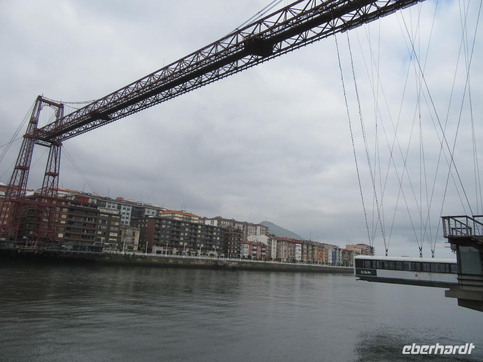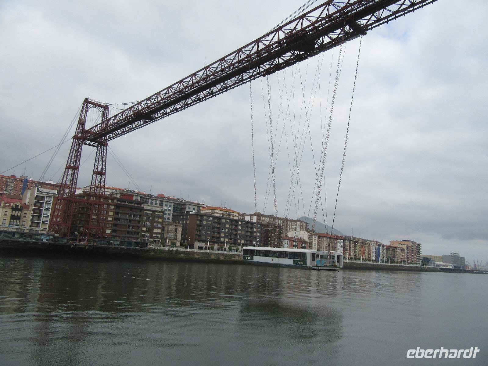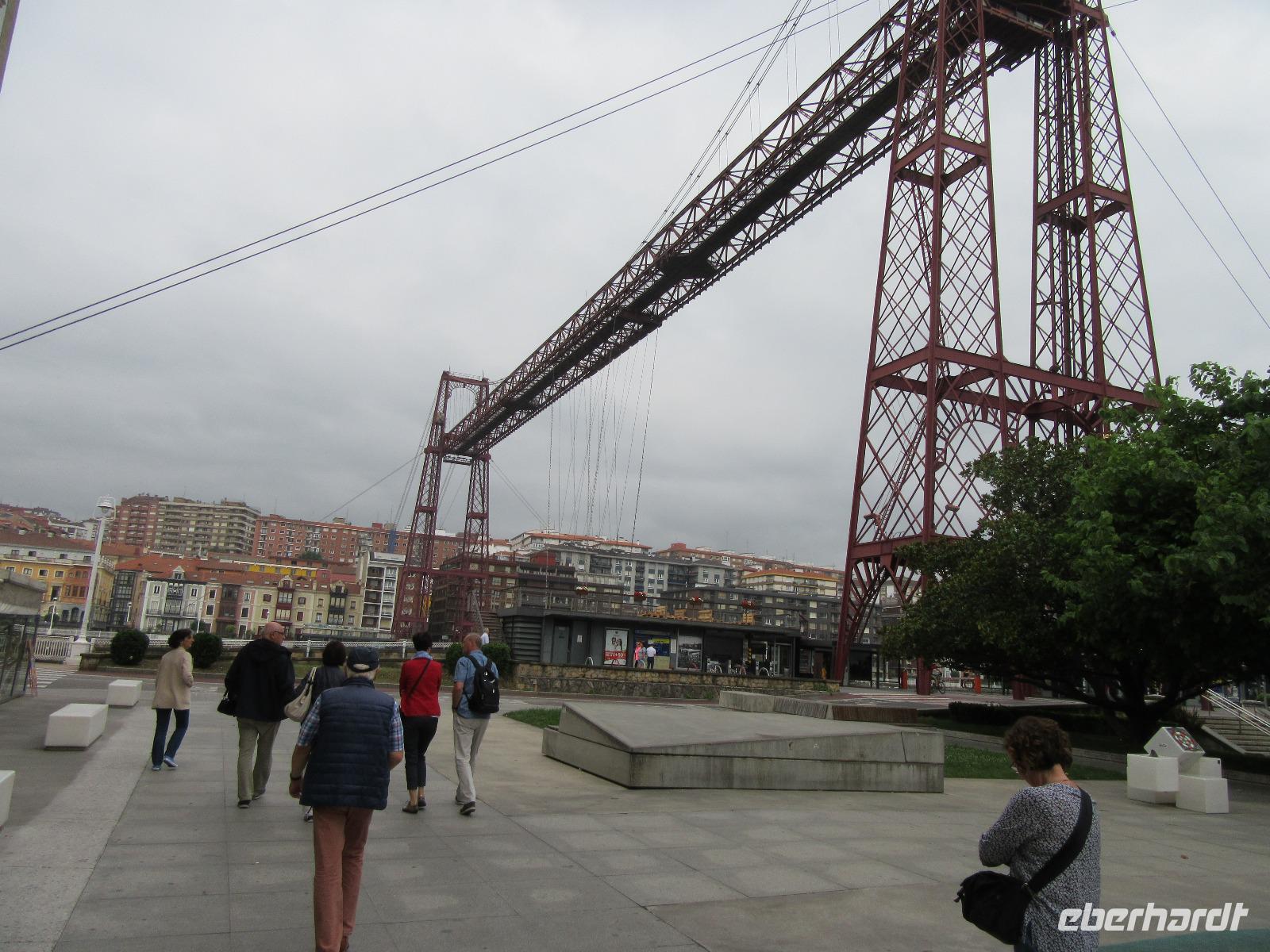 Erst fuhren wir zum Hafen, wo die reichsten Familien Spaniens wohnten. Obwohl dort heutzutage nicht mehr alle wohnen, sind die Paläste im englischen Stil und schönen Häuser immer noch geblieben an der rechten Seite des Ufers sowie des Jacht-Hafens. Auf der anderen Seite des Ufers befindet sich das Industriegebiet Steins und Gewerbegebiete. Als Verbindung zwischen beiden Seiten haben wir die bekannte Hängende Brücke gesehen, die zum Weltkulturerbe der UNESCO erklärt wurde. Die Hängende Brücke wurde 1983 von Alberto de Palacio gebaut und da sie die erste von dieser Sorte ist, hatte sie damals keinen Namen und wurde als „Puente de Bilbao" bezeichnet. Die Brücke hat diesen Namen bis heute behalten, obwohl „Puente de Vizcaya" ihr offizieller Name ist. Es war nicht so einfach diese Brücke zu bauen, weil es eine Neuheit war und deswegen Alberto de Palacio die Hilfe von verschiedenen französischen Ingenieuren brauchte.