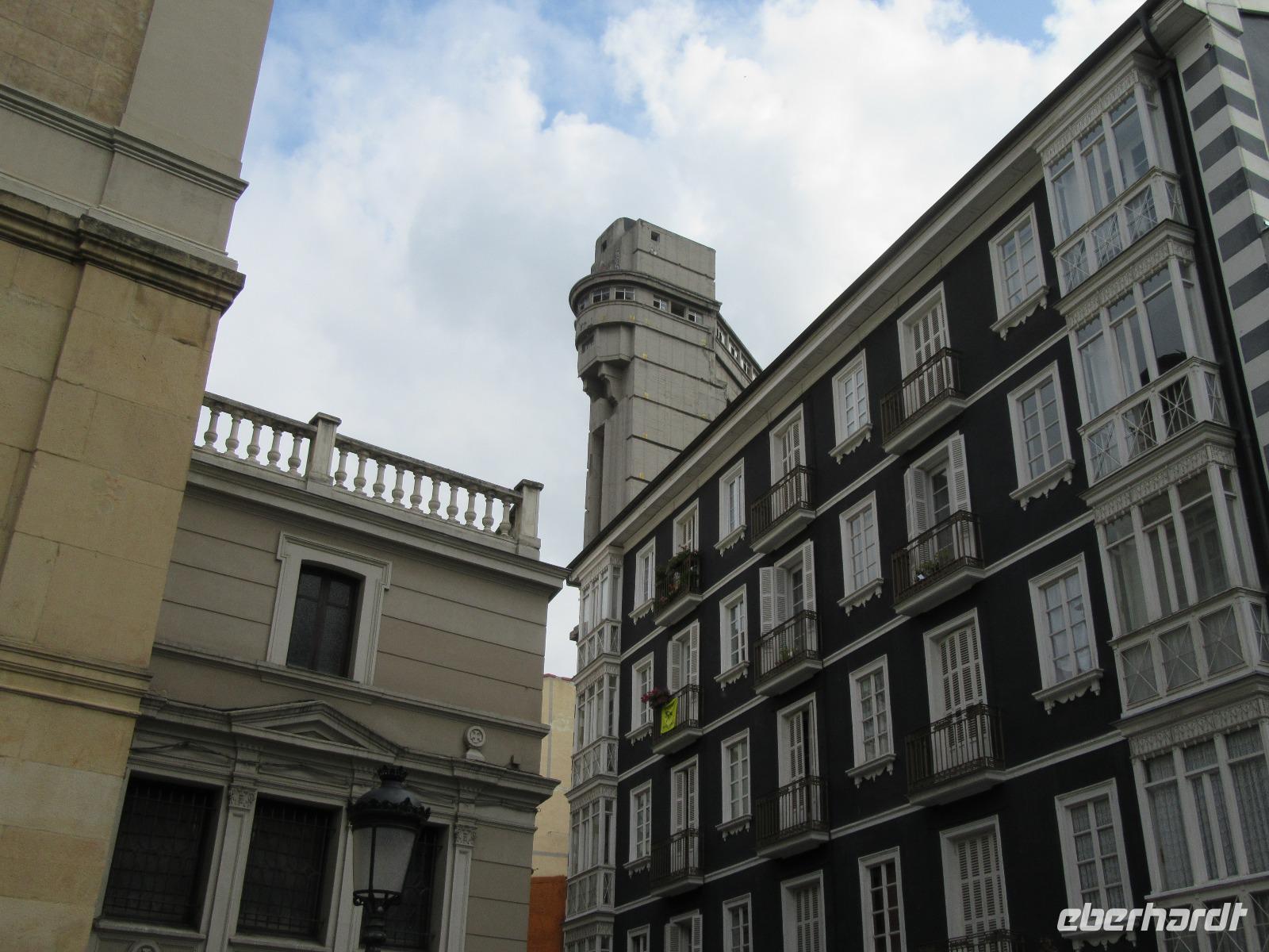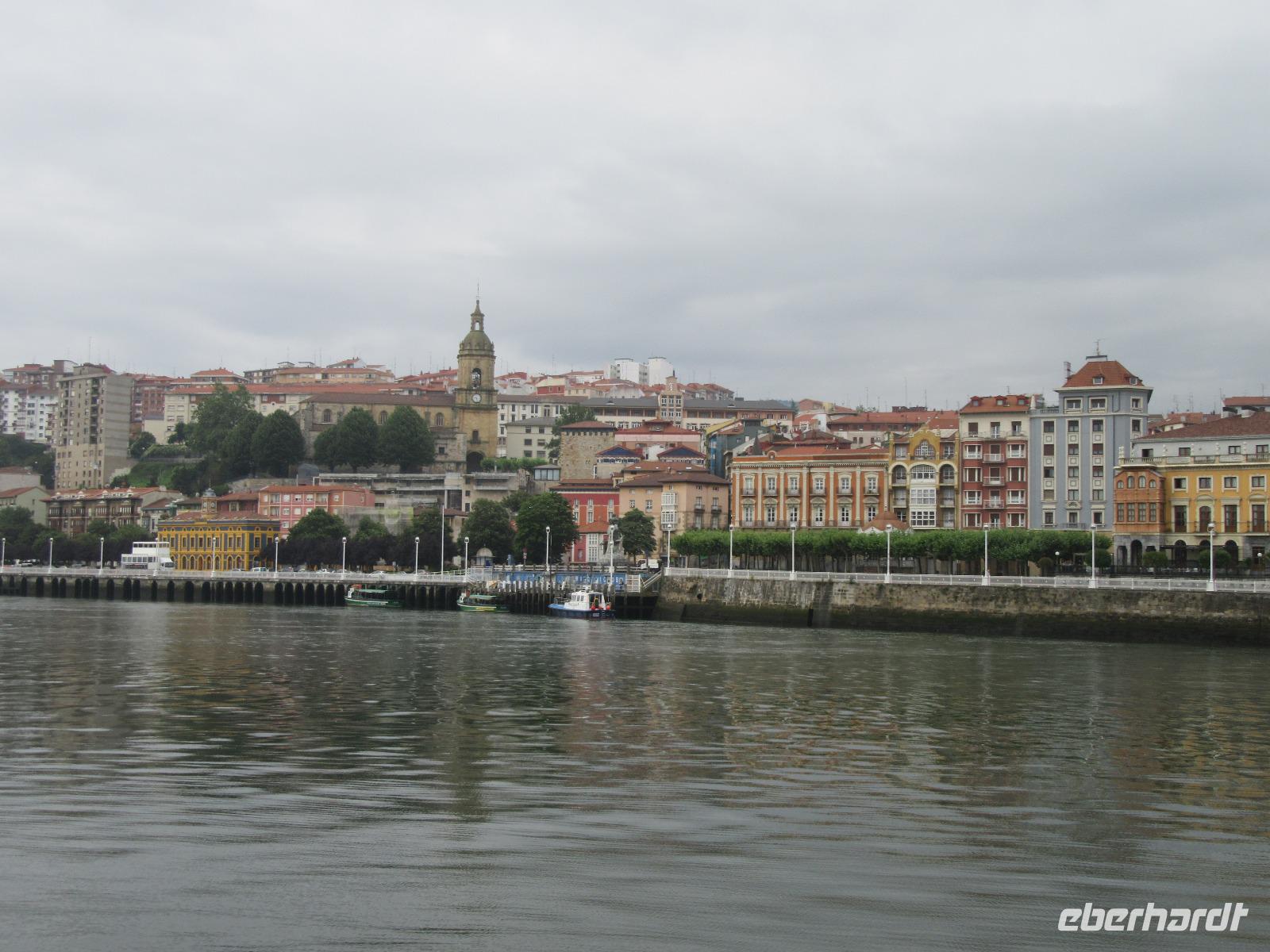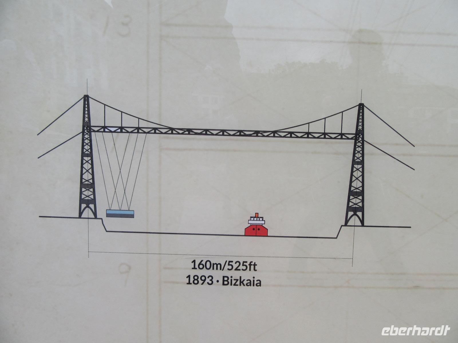 Erst fuhren wir zum Hafen, wo die reichsten Familien Spaniens wohnten. Obwohl dort heutzutage nicht mehr alle wohnen, sind die Paläste im englischen Stil und schönen Häuser immer noch geblieben an der rechten Seite des Ufers sowie des Jacht-Hafens. Auf der anderen Seite des Ufers befindet sich das Industriegebiet Steins und Gewerbegebiete. Als Verbindung zwischen beiden Seiten haben wir die bekannte Hängende Brücke gesehen, die zum Weltkulturerbe der UNESCO erklärt wurde. Die Hängende Brücke wurde 1983 von Alberto de Palacio gebaut und da sie die erste von dieser Sorte ist, hatte sie damals keinen Namen und wurde als „Puente de Bilbao" bezeichnet. Die Brücke hat diesen Namen bis heute behalten, obwohl „Puente de Vizcaya" ihr offizieller Name ist. Es war nicht so einfach diese Brücke zu bauen, weil es eine Neuheit war und deswegen Alberto de Palacio die Hilfe von verschiedenen französischen Ingenieuren brauchte.
