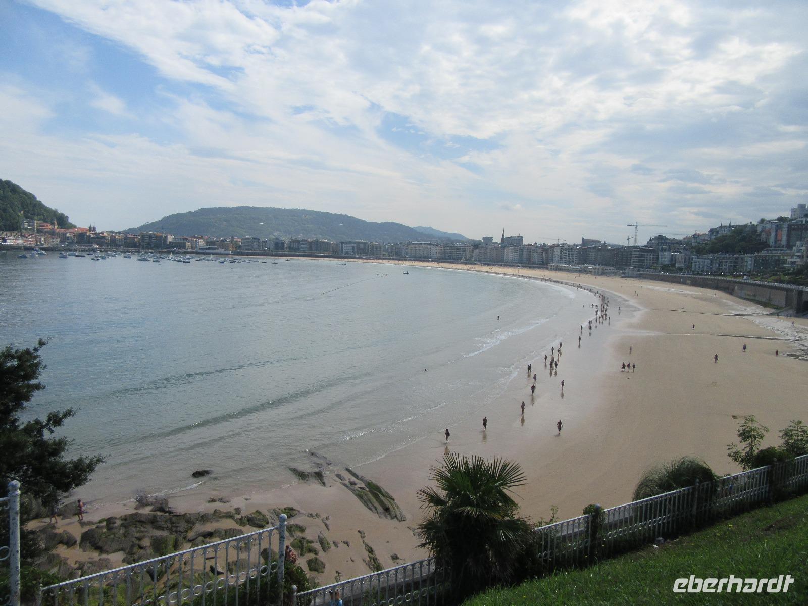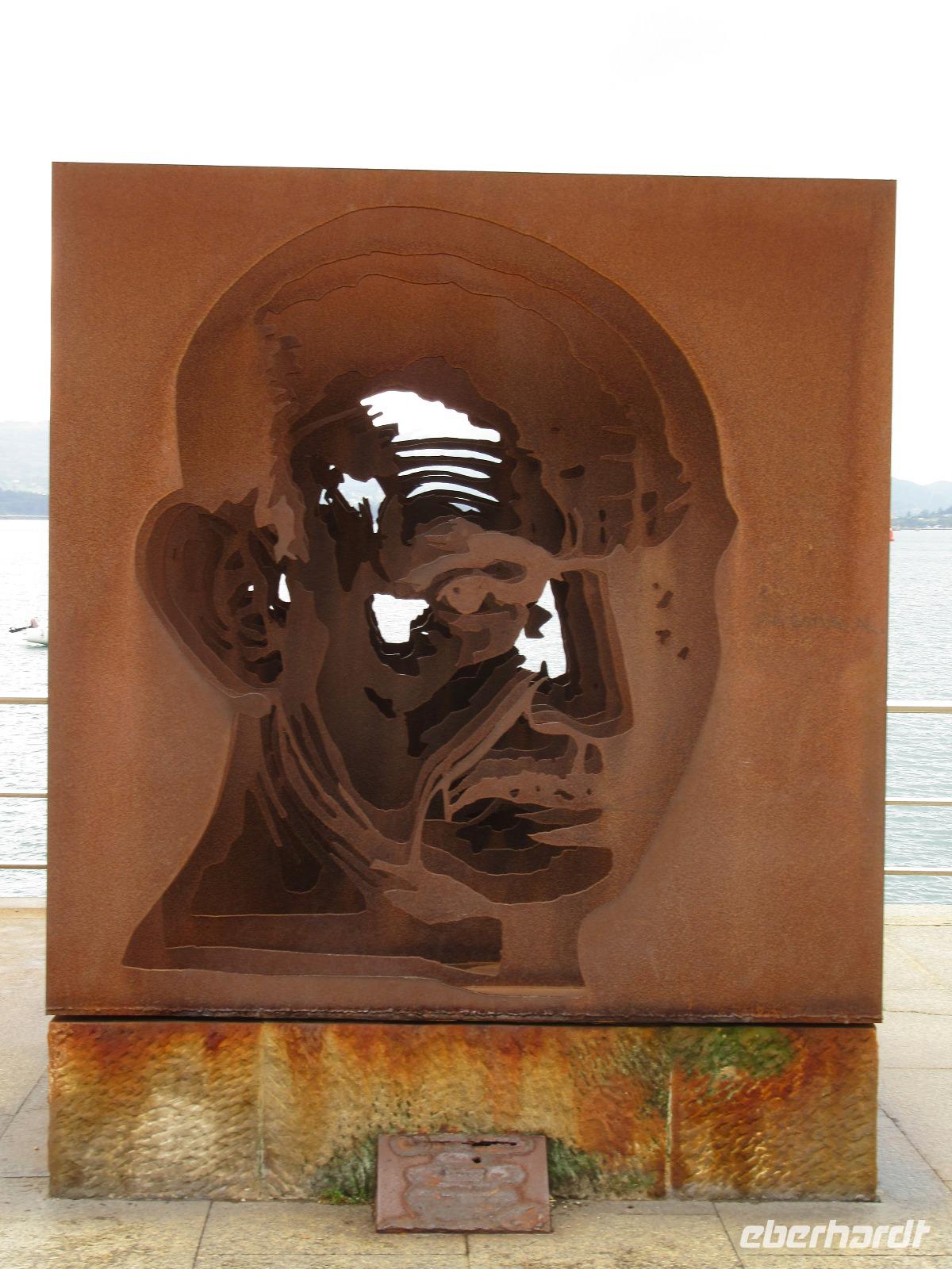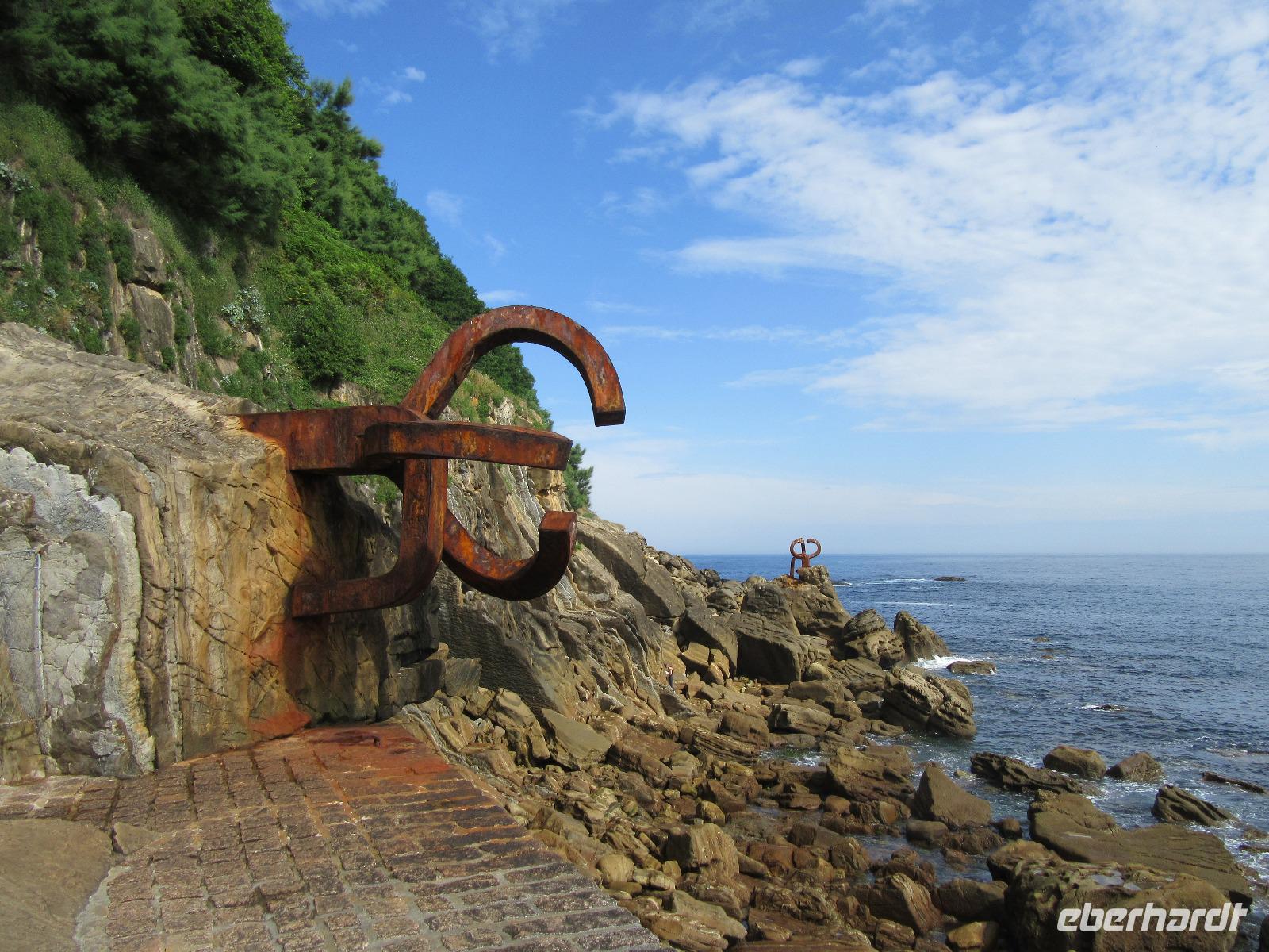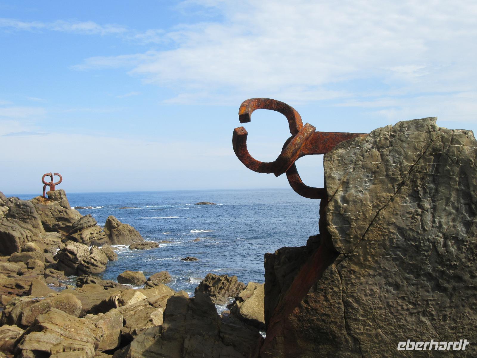 Angekommen in San Sebastián, haben wir uns vom Concha-Strand überraschen lassen. Dieser Strand heißt „La Concha", weil er die Form einer Muschel hat. Wir sind am westlichen Teil des Strandes ausgestiegen und bis zum Wind-Kamm gelaufen. Diese Stahl-Elemente wurden 1976 in den Stein bei Eduardo Chillida gezogen und wurden Pablo Picasso, Salvador Allende und Pablo Neruda gewidmet.