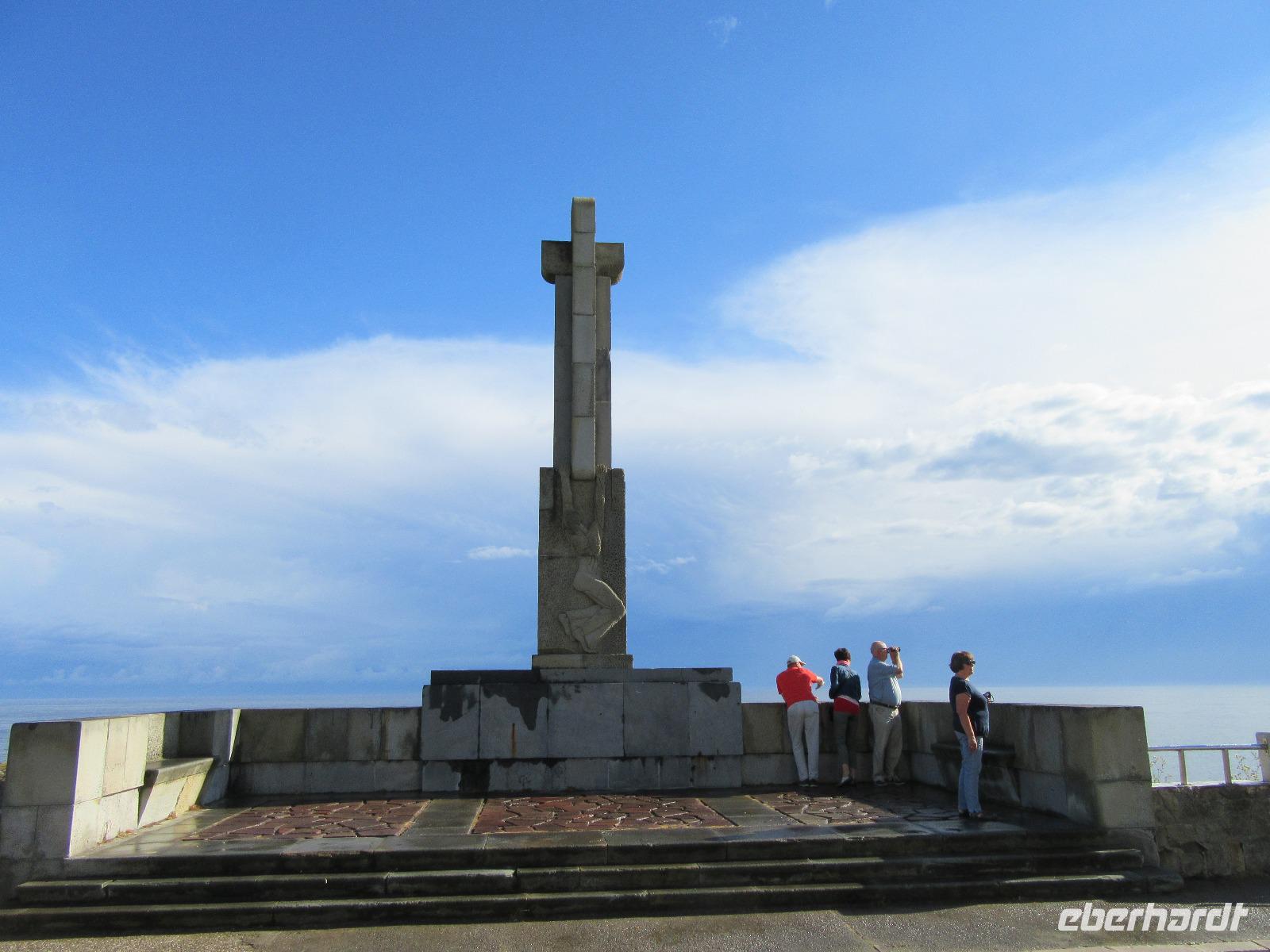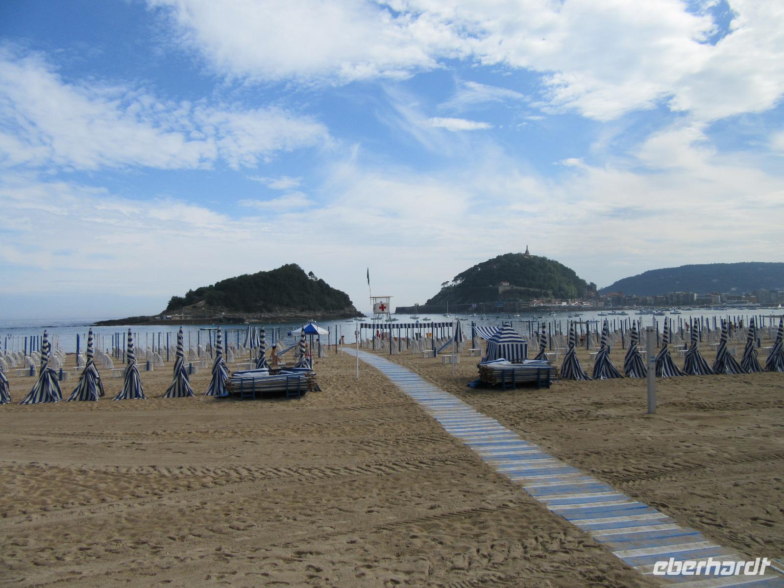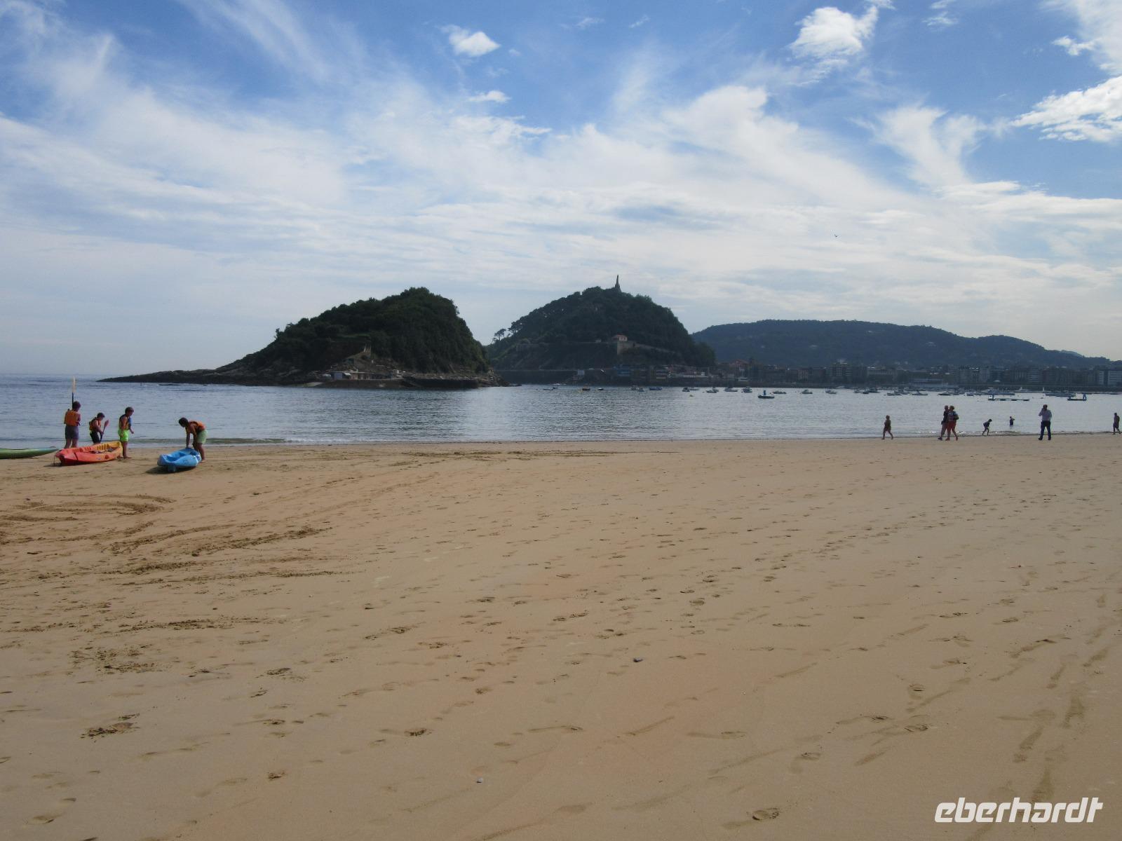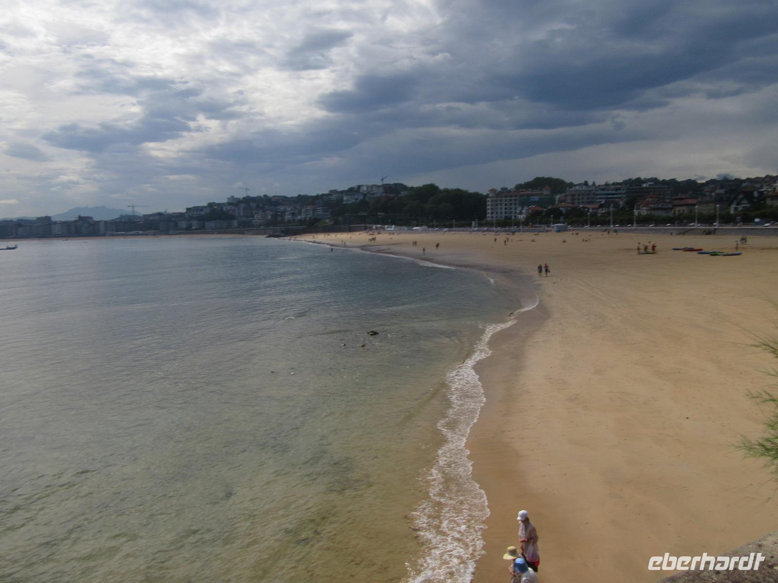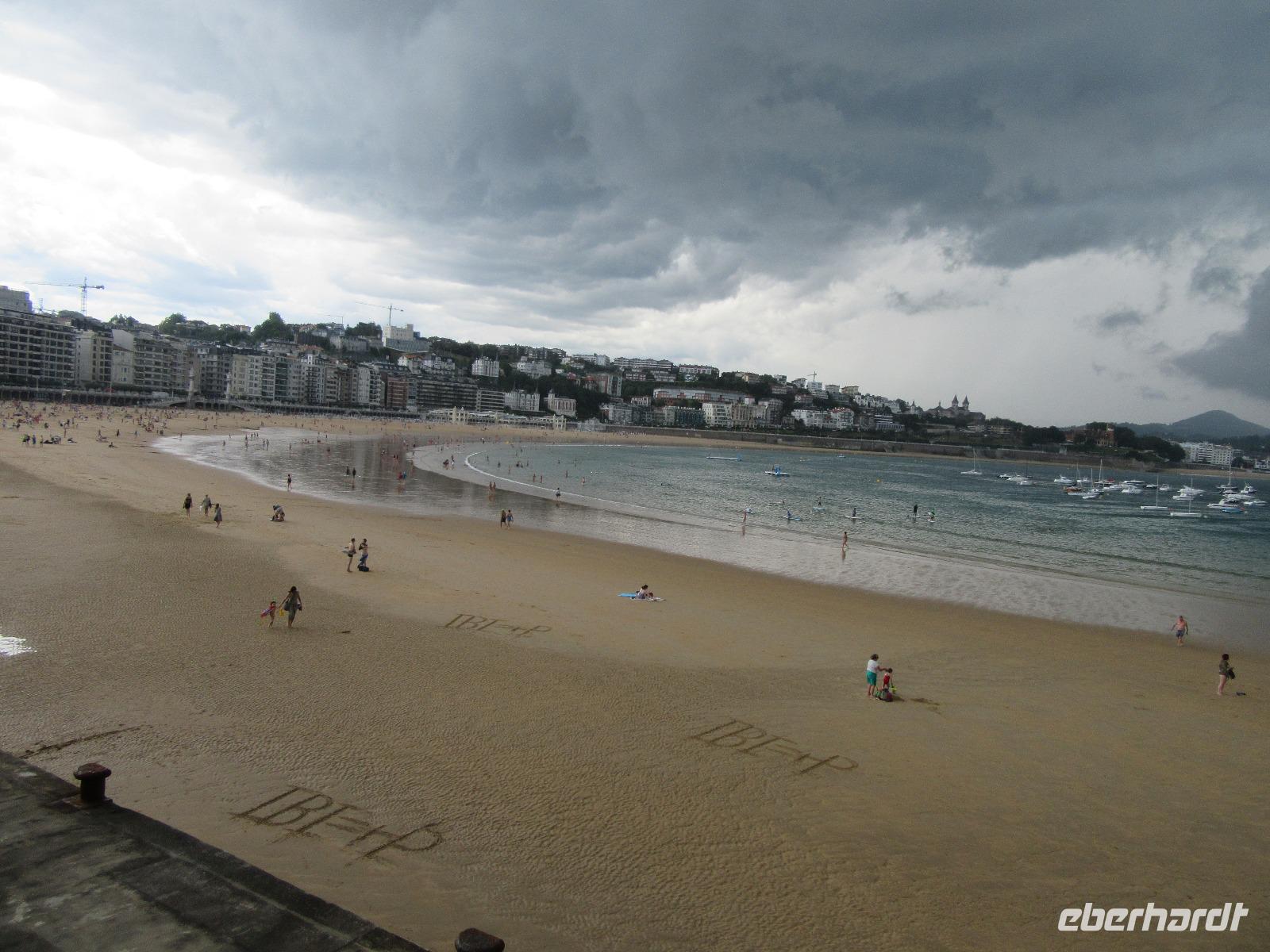 Angekommen in San Sebastián, haben wir uns vom Concha-Strand überraschen lassen. Dieser Strand heißt „La Concha", weil er die Form einer Muschel hat. Wir sind am westlichen Teil des Strandes ausgestiegen und bis zum Wind-Kamm gelaufen. Diese Stahl-Elemente wurden 1976 in den Stein bei Eduardo Chillida gezogen und wurden Pablo Picasso, Salvador Allende und Pablo Neruda gewidmet.