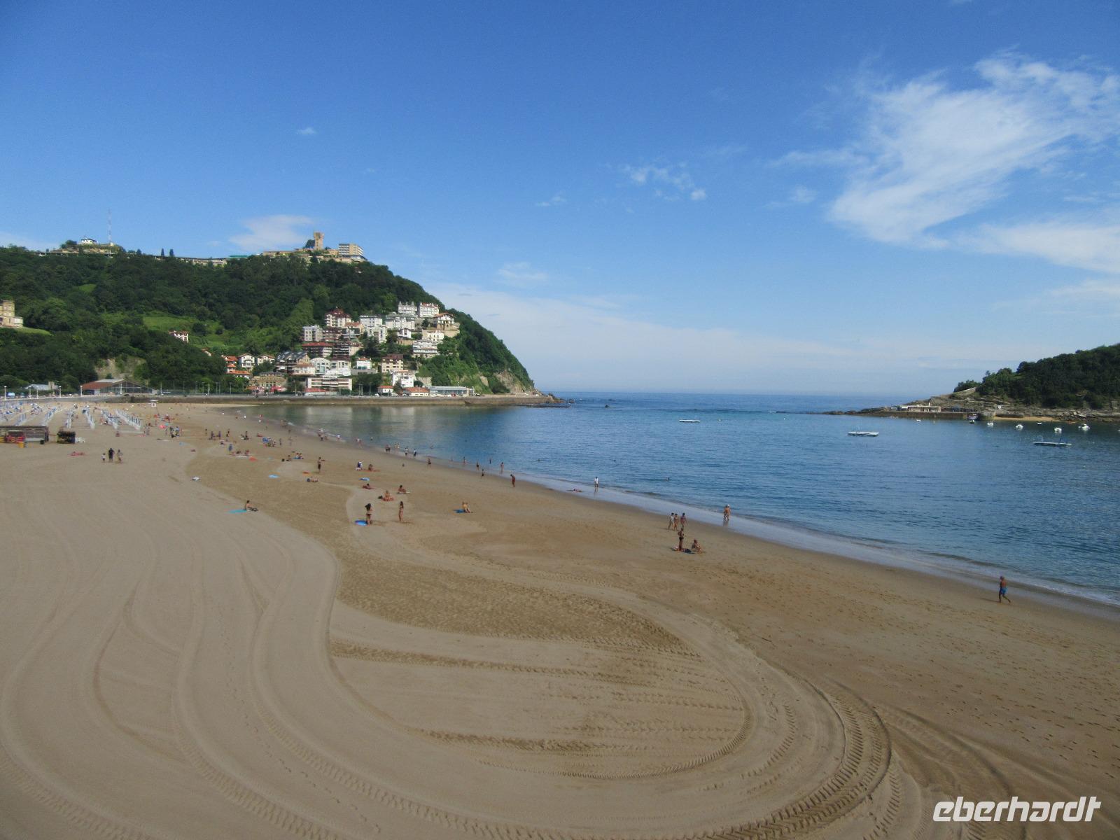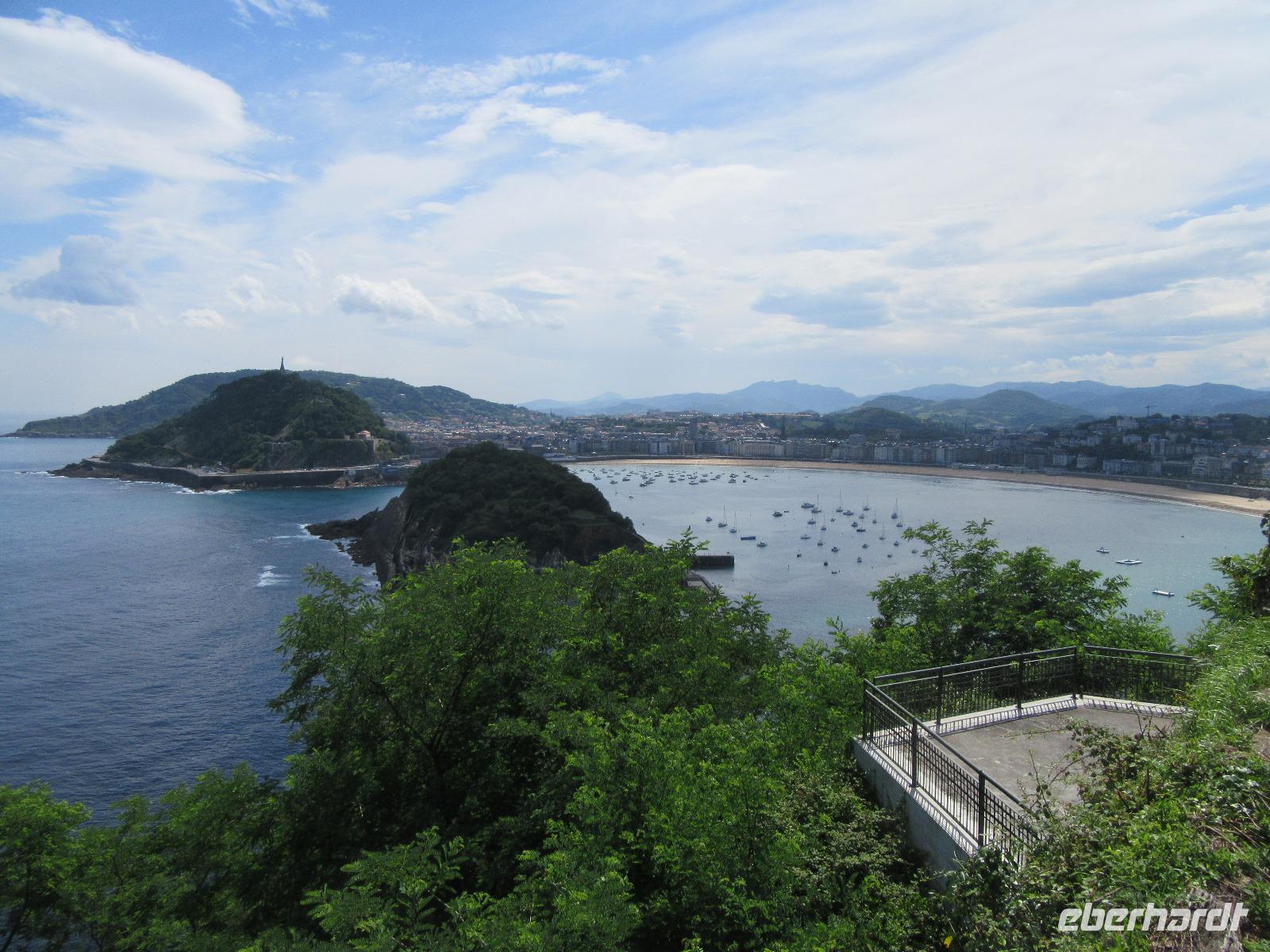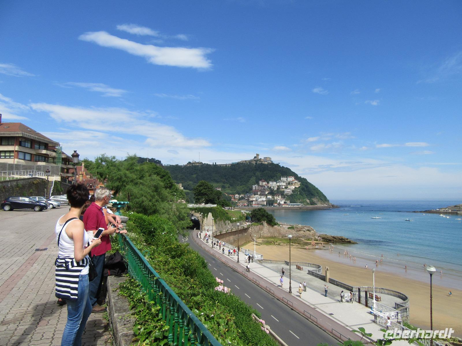 Auf unserer linken Seite sahen wir den Berg Igueldo mit Seilbahn und Leuchtturm, wo wir einen Foto-Stopp gemacht haben. Auf unserer rechten Seite lag der Berg Urgull mit der Bastion „La Mota" und dem Monument „Heiliges Herz Christus", der uns an die Christus-Statue auf dem Corcovado in Río de Janeiro erinnerte.