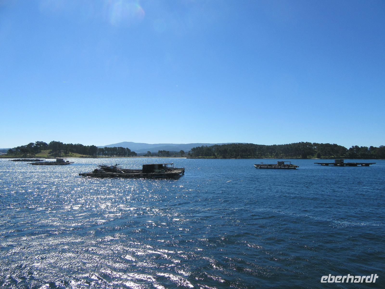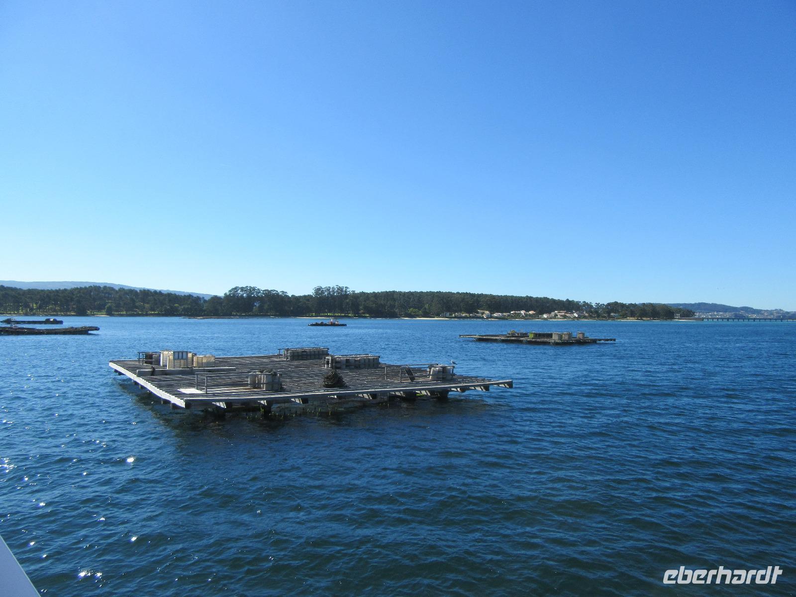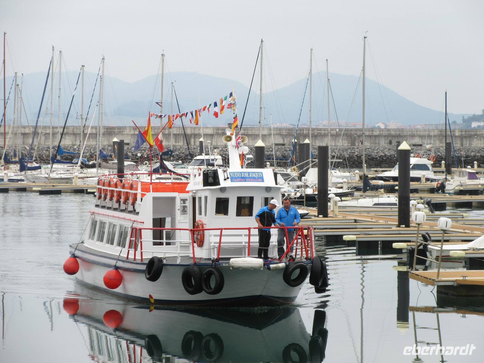 Die Sonne scheint über der Stadt Santiago de Compostela und wir fuhren Richtung Süden zur Halbinsel O'Grove. Dort sind wir in unser Boot gestiegen und begannen unsere angenehme Fahrt in die „Ria de Arosa". Wir haben die Muschelzucht „Bateas" besucht und gezeigt bekommen, wie sie die Jakobsmuscheln (Vieiras), Miesmuscheln (Mejillones) und die Austernmuscheln (Ostras) züchten. Danach besuchten wir noch die berühmte Isabel Fabrik. Nicht nur von oben sondern auch von unten, haben wir diese Muschelzucht gesehen und natürlich, die Miesmuscheln mit ins Boot bekommen und sie mit einem großartigen Albariño-Wein verkostet. Außerdem hatten wir die Möglichkeit, die leckeren Ostras zu probieren. Auf der Rückfahrt hatten wir den besten Show-Mann der Umgebung zum Tanzen und konnten unsere Bootsfahrt genießen.