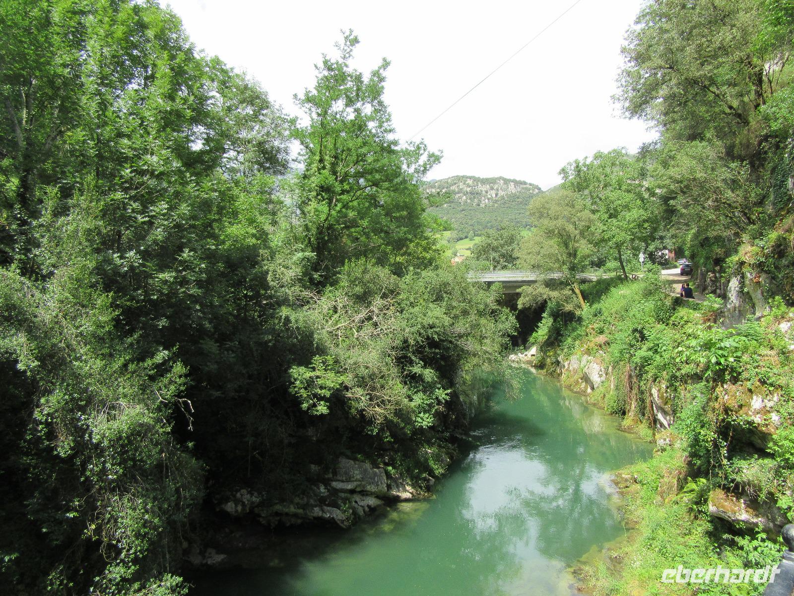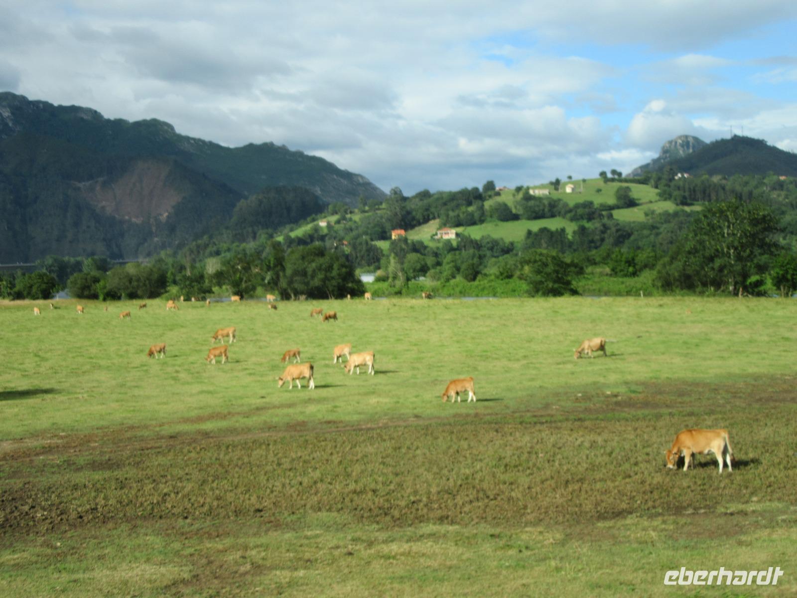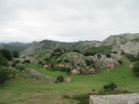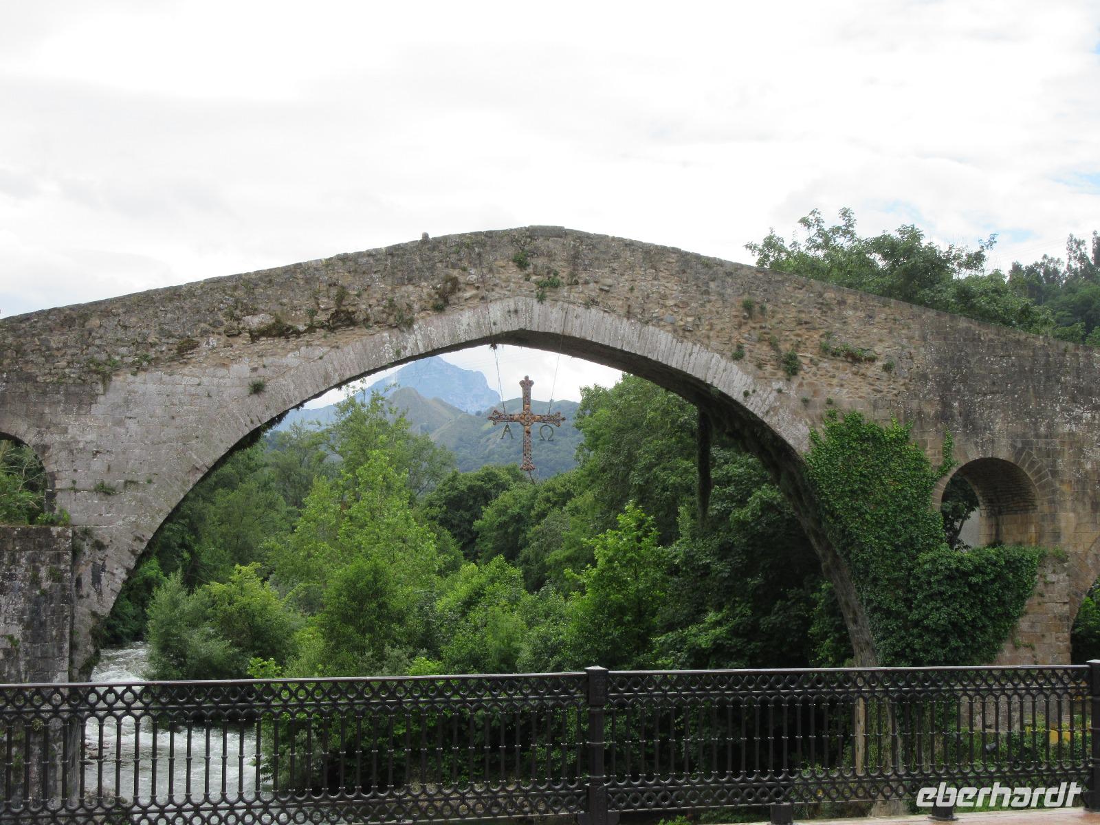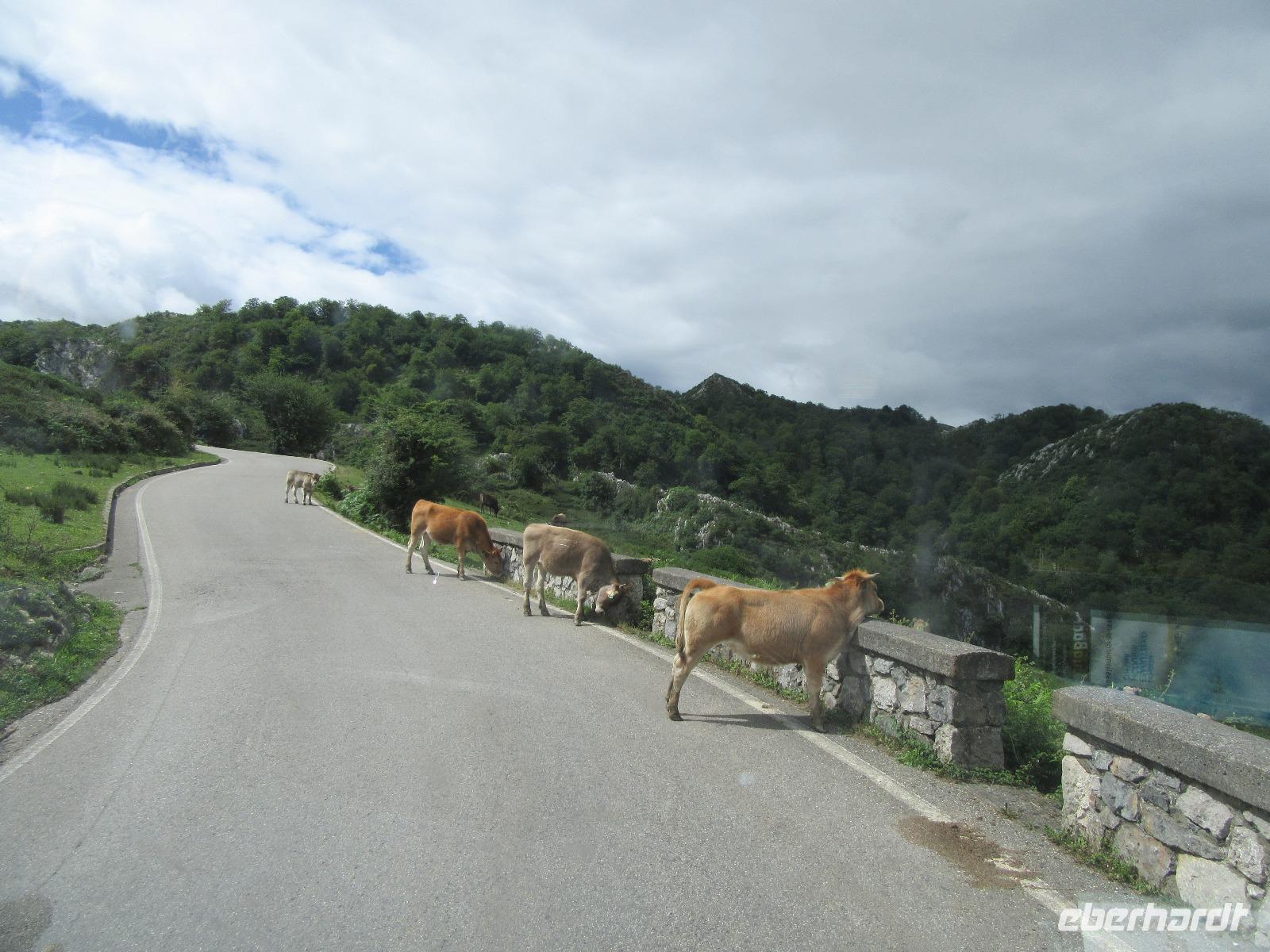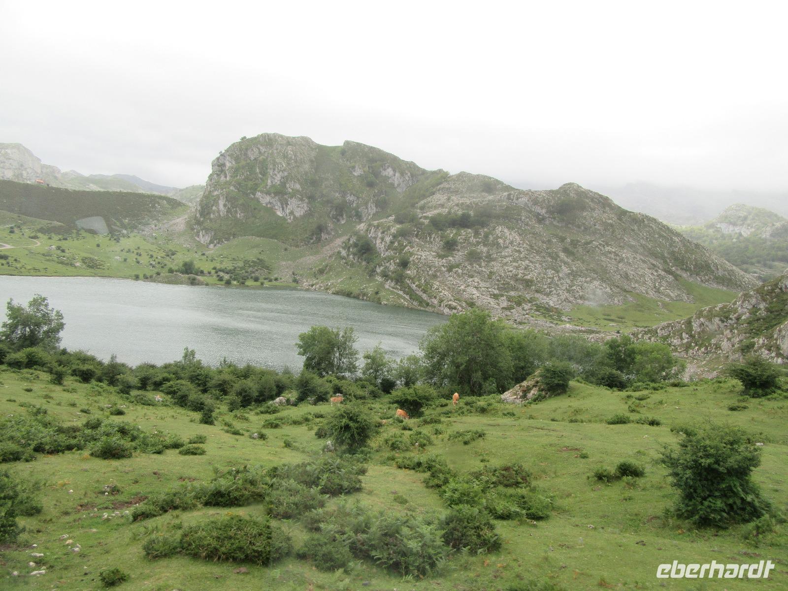 Dann fuhren wir bergauf und besuchten die Covadonga-Seen. Auf unserem Weg sahen wir sehr nette Kühe an der Straße, die uns begrüßen wollten. Nicht nur Kühe, sondern auch Schafe und Ziegen. Fast auf der Spitze, über 1200 Meter Höhe, haben wir einen Foto-Stopp am Aussichtspunkt „Mirador de la Reina" gemacht. Dort konnten wir über das ganze Gebirge „Picos de Europa" schauen und das kalte Klima dieser Lage fühlen. Kurz darauf erreichten wir den Enol-See. Dort hatten wir unseren Foto-Stopp gemacht und fuhren bergab nach Cangas de Onís für unsere Mittagspause. In Cangas de Onís befindet sich die berühmte Jakobsweg-Brücke, wo das Sieg-Kreuz Asturiens hängt.