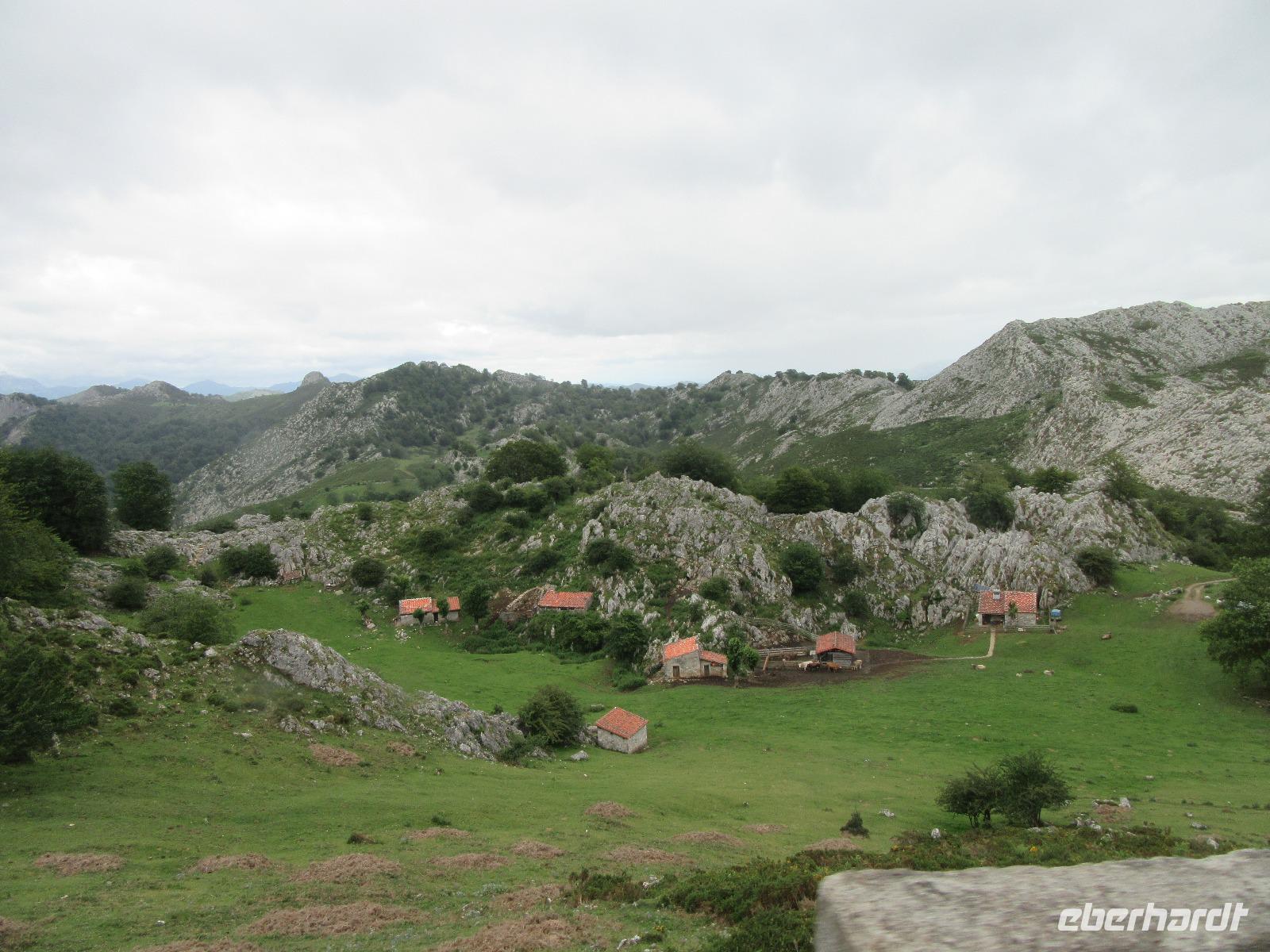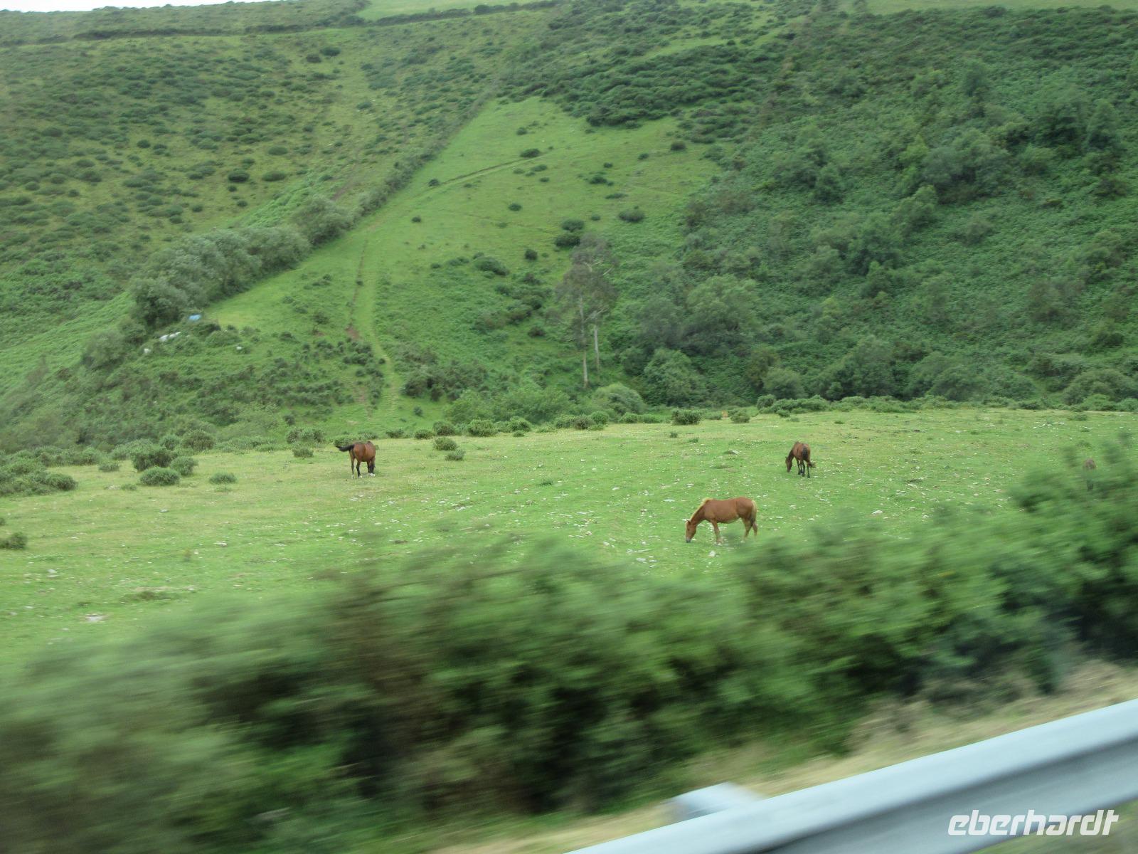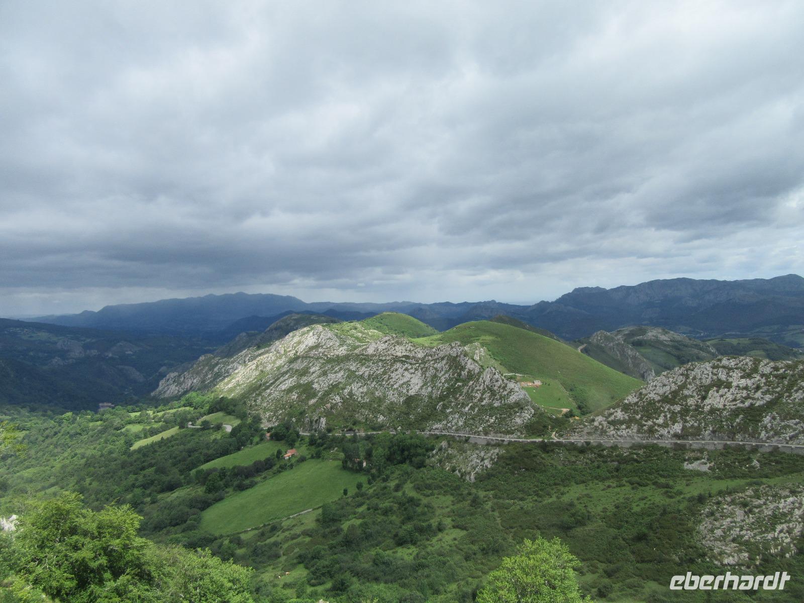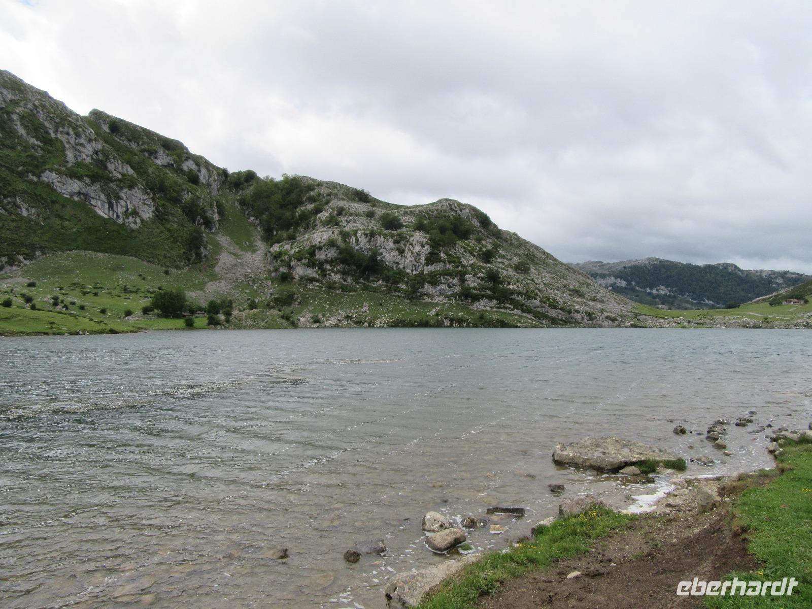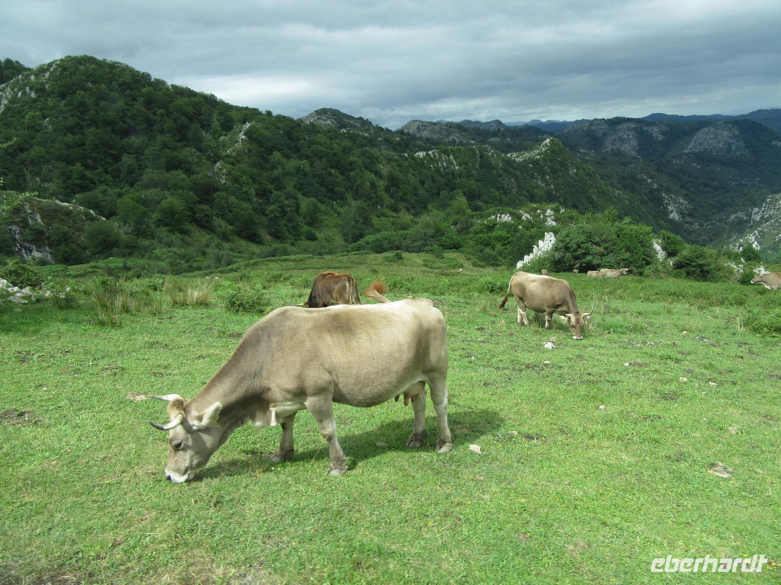 Dann fuhren wir bergauf und besuchten die Covadonga-Seen. Auf unserem Weg sahen wir sehr nette Kühe an der Straße, die uns begrüßen wollten. Nicht nur Kühe, sondern auch Schafe und Ziegen. Fast auf der Spitze, über 1200 Meter Höhe, haben wir einen Foto-Stopp am Aussichtspunkt „Mirador de la Reina" gemacht. Dort konnten wir über das ganze Gebirge „Picos de Europa" schauen und das kalte Klima dieser Lage fühlen. Kurz darauf erreichten wir den Enol-See. Dort hatten wir unseren Foto-Stopp gemacht und fuhren bergab nach Cangas de Onís für unsere Mittagspause. In Cangas de Onís befindet sich die berühmte Jakobsweg-Brücke, wo das Sieg-Kreuz Asturiens hängt.