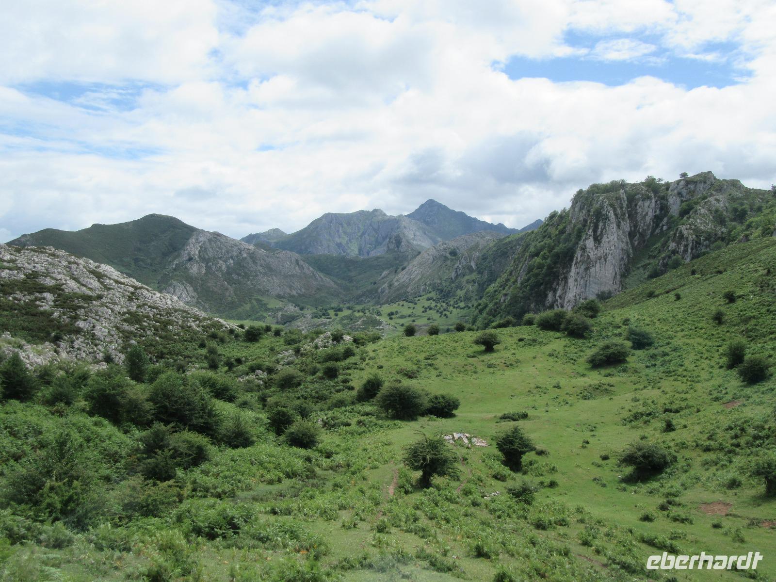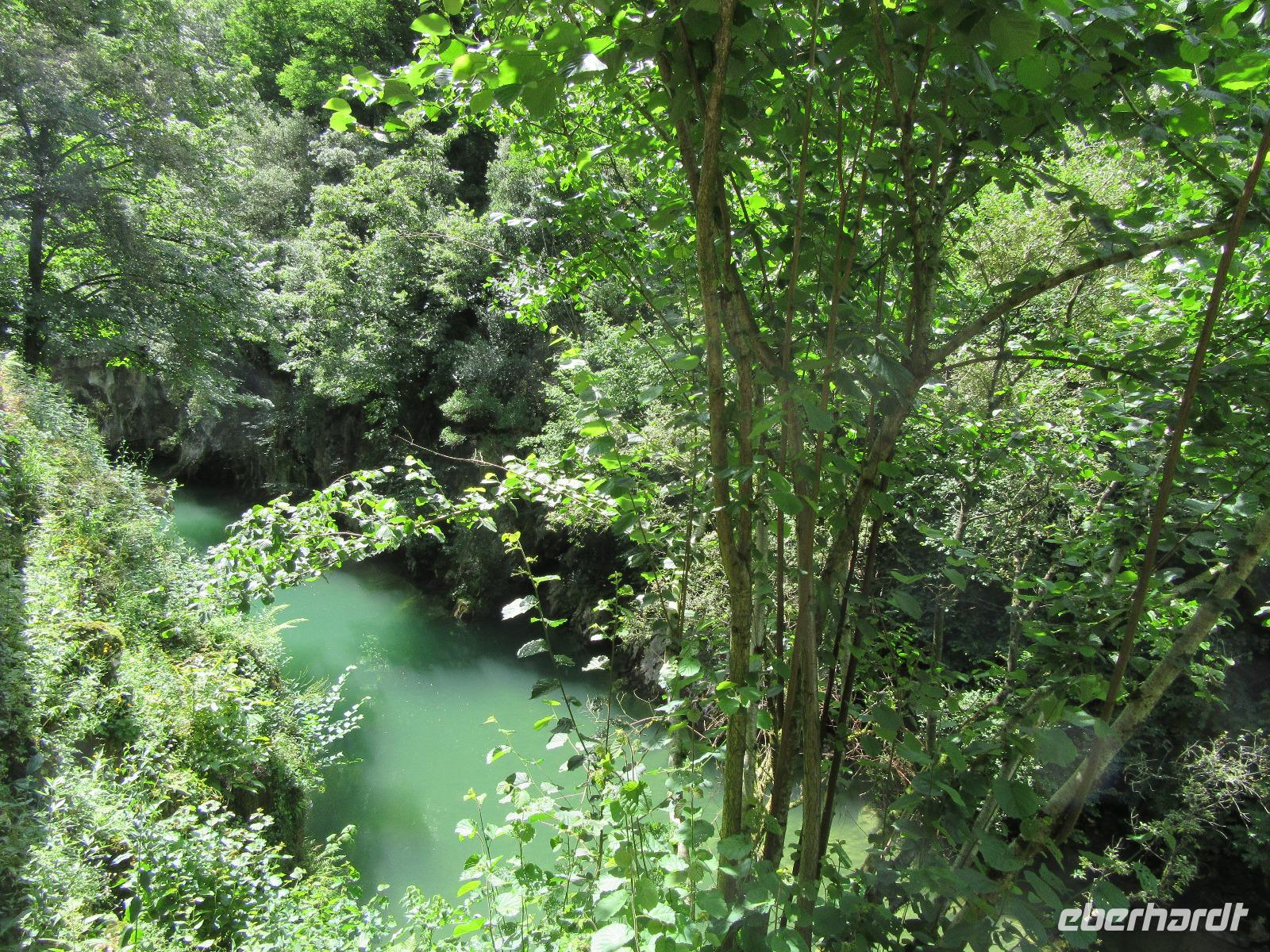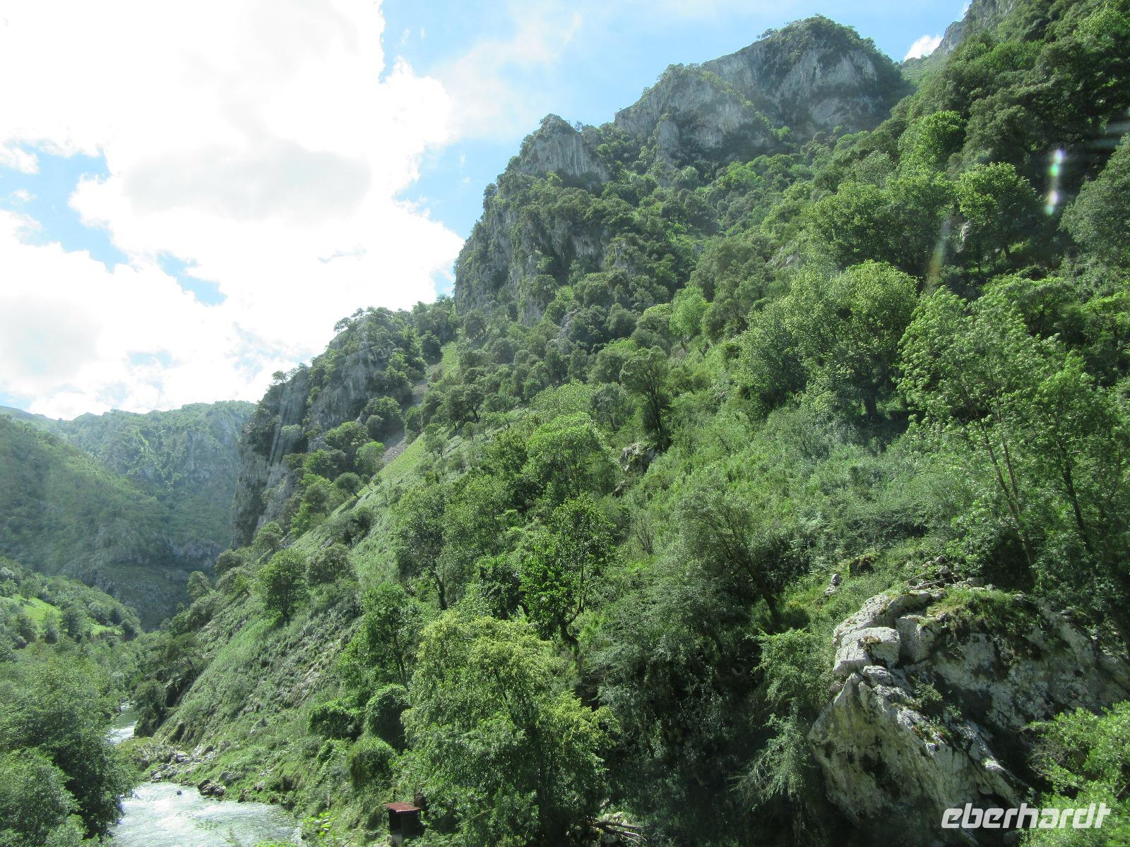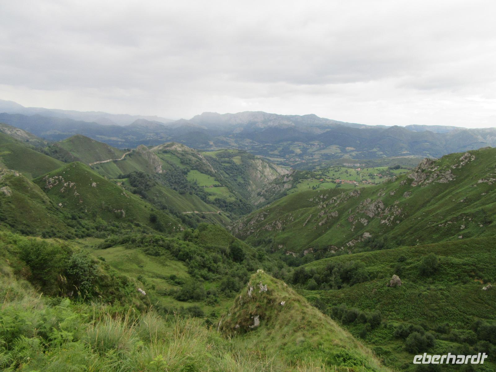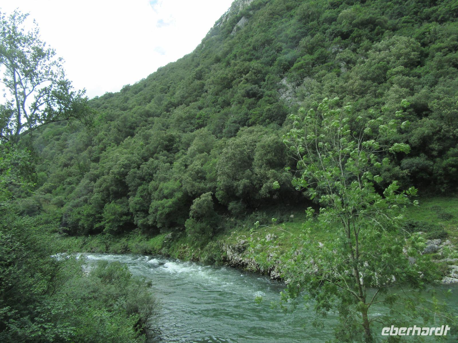 Dann fuhren wir bergauf und besuchten die Covadonga-Seen. Auf unserem Weg sahen wir sehr nette Kühe an der Straße, die uns begrüßen wollten. Nicht nur Kühe, sondern auch Schafe und Ziegen. Fast auf der Spitze, über 1200 Meter Höhe, haben wir einen Foto-Stopp am Aussichtspunkt „Mirador de la Reina" gemacht. Dort konnten wir über das ganze Gebirge „Picos de Europa" schauen und das kalte Klima dieser Lage fühlen. Kurz darauf erreichten wir den Enol-See. Dort hatten wir unseren Foto-Stopp gemacht und fuhren bergab nach Cangas de Onís für unsere Mittagspause. In Cangas de Onís befindet sich die berühmte Jakobsweg-Brücke, wo das Sieg-Kreuz Asturiens hängt.
