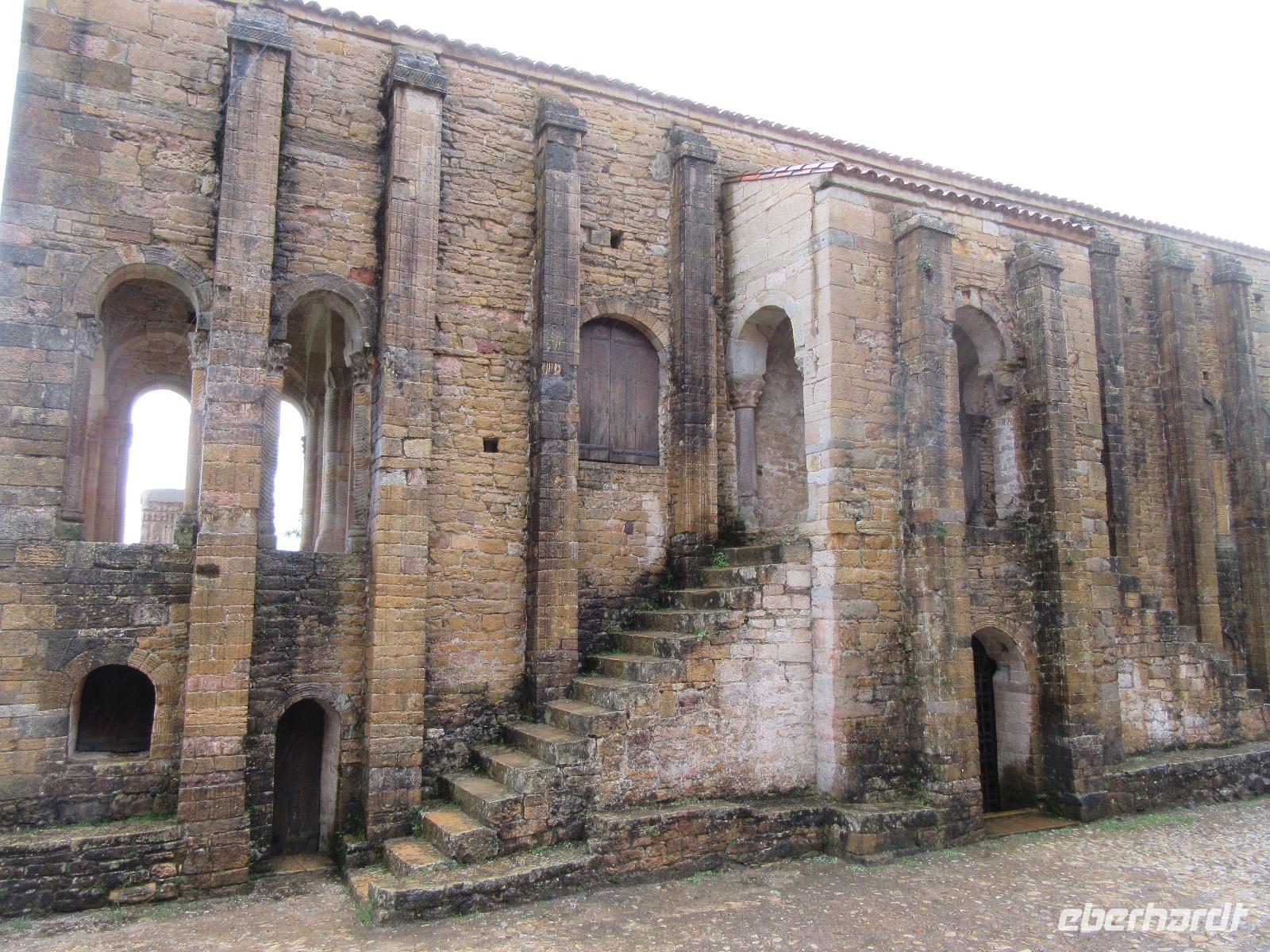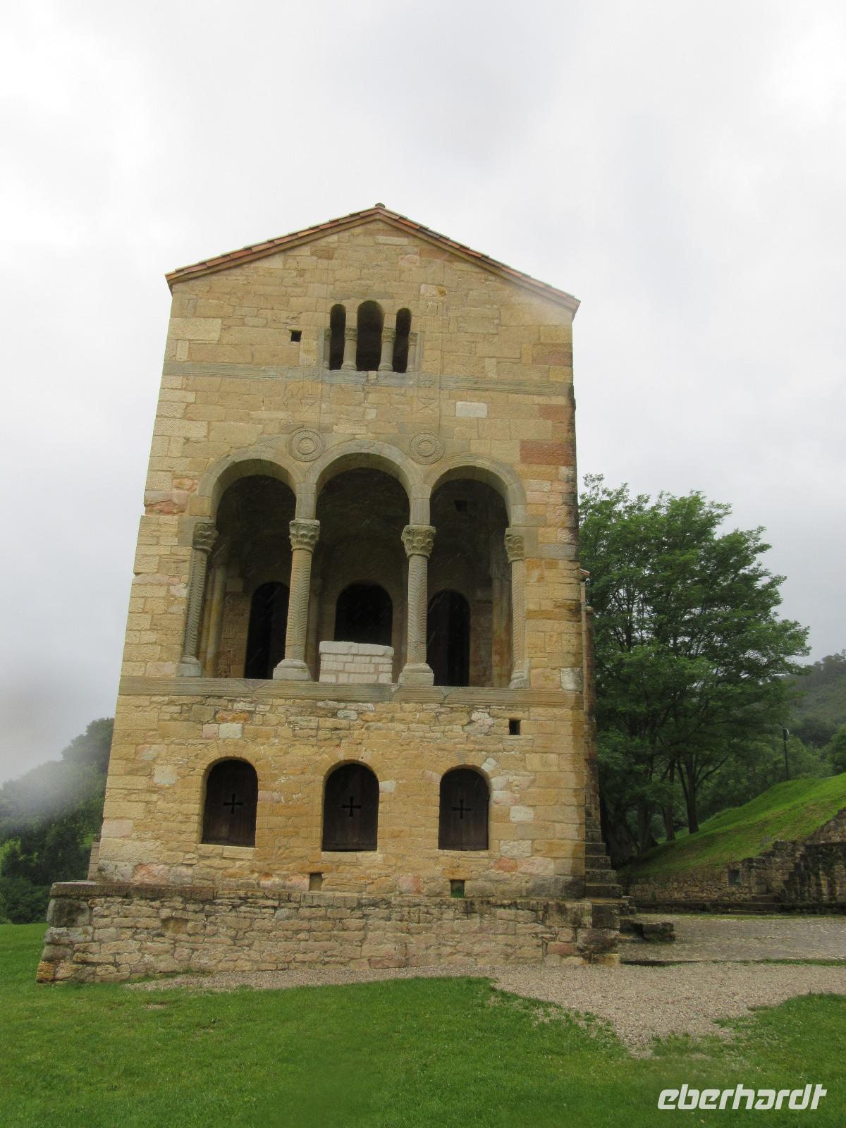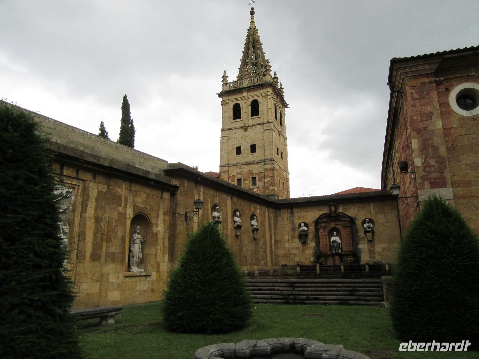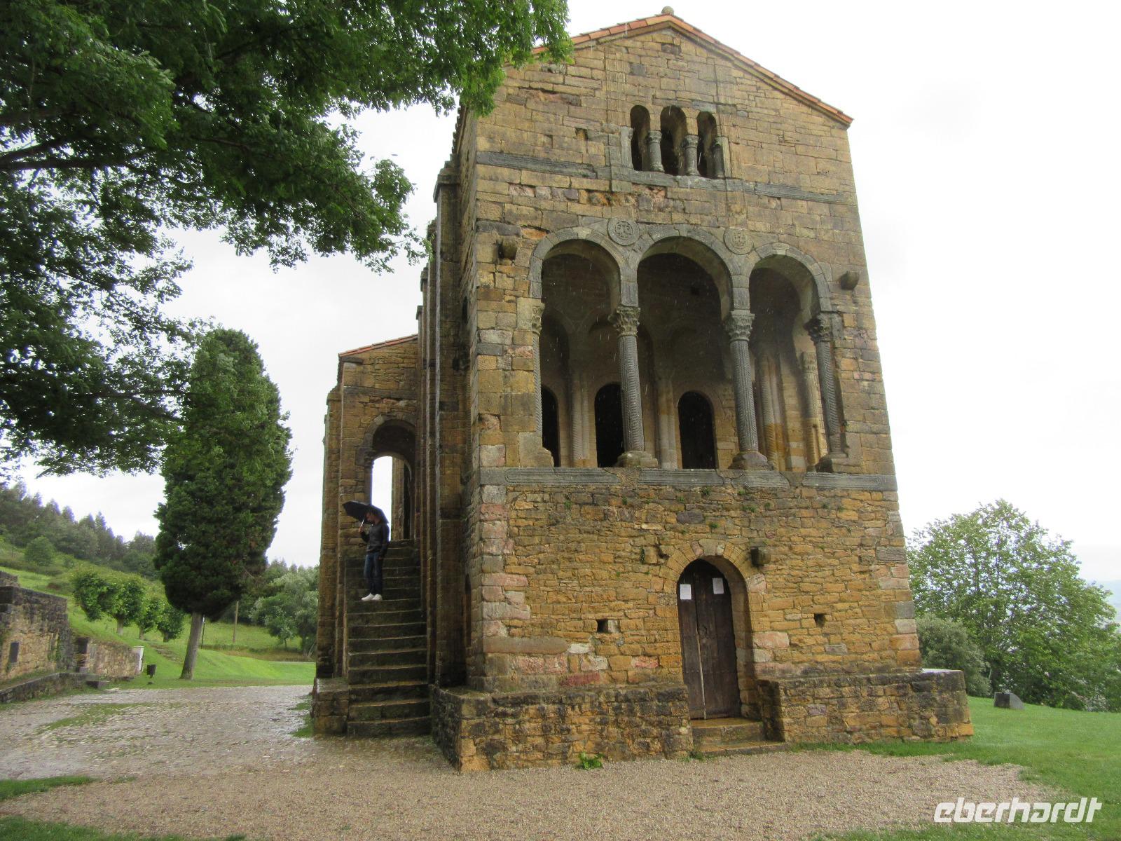 Danach fuhren wir weiter in die Hauptstadt Asturiens: Oviedo. In Oviedo haben wir unsere örtliche Reiseleiterin Marian kennengelernt und mit unserer Führung begonnen. Erst besuchten wir die Monumente des Naranco-Berges. Da haben wir die Reste der präromanischen Geschichte Asturiens gesehen, die bei der UNESCO als Weltkulturerbe erklärt wurden. Die Kirche „San Miguel de Lillo" war unser Ausgangspunkt. Da sahen wir verschiedene Elemente besonders von diesem Stil, obwohl nur zwei der drei Teile des Gebäudes immer noch erhalten sind. Dann besuchten wir den Palast „Santa Maria del Naranco". Es ist das einzige Gebäude in diesem Stil in der ganzen Welt und deswegen ist der Verwendungszweck nicht gänzlich klar. Sicher ist, dass König Ramiro I beide Gebäude baute und benutzte.