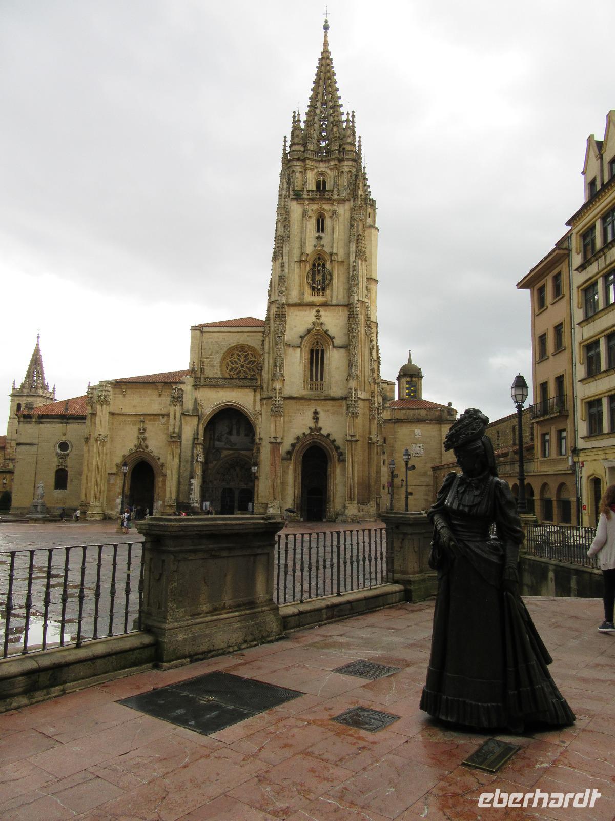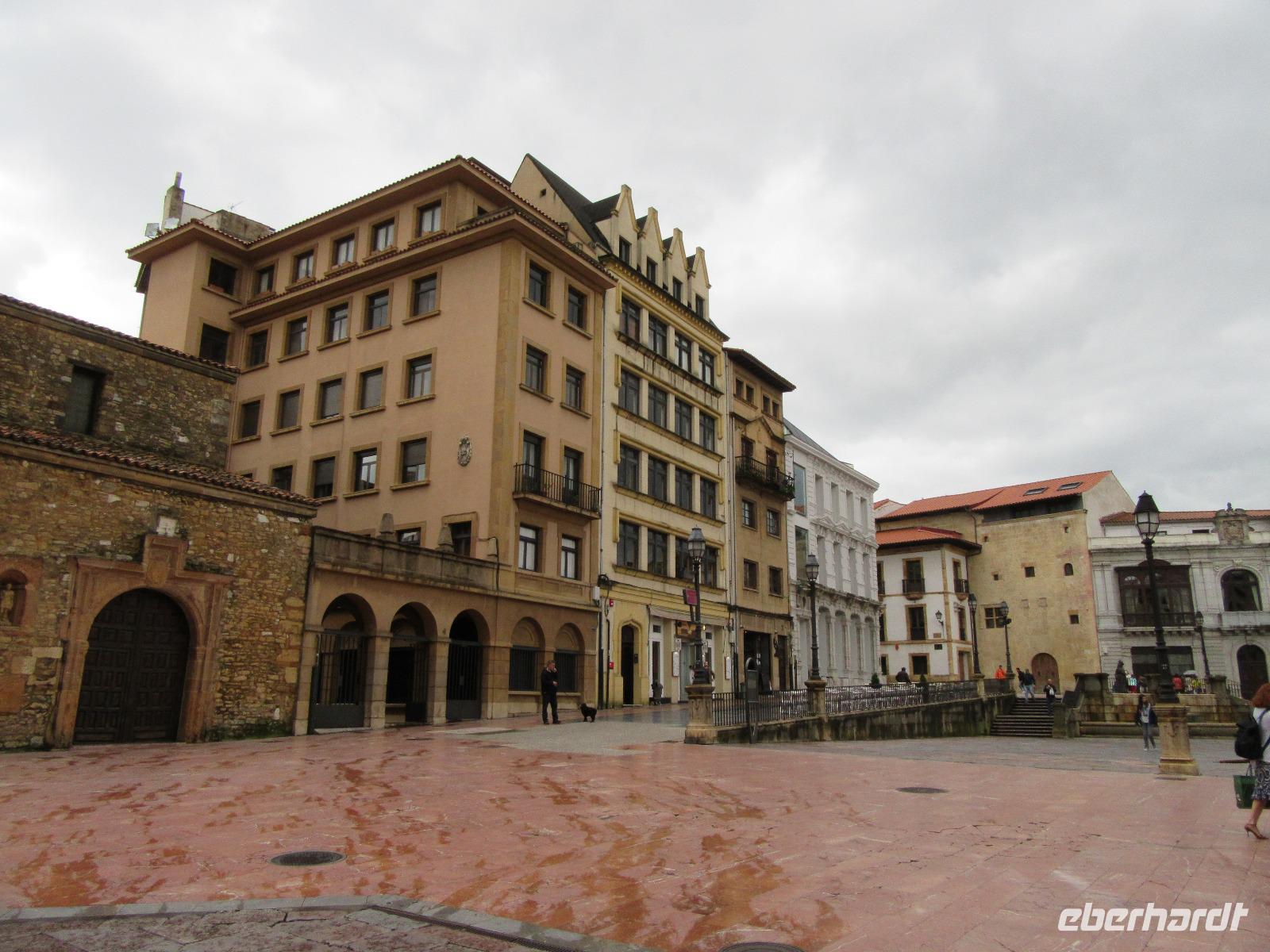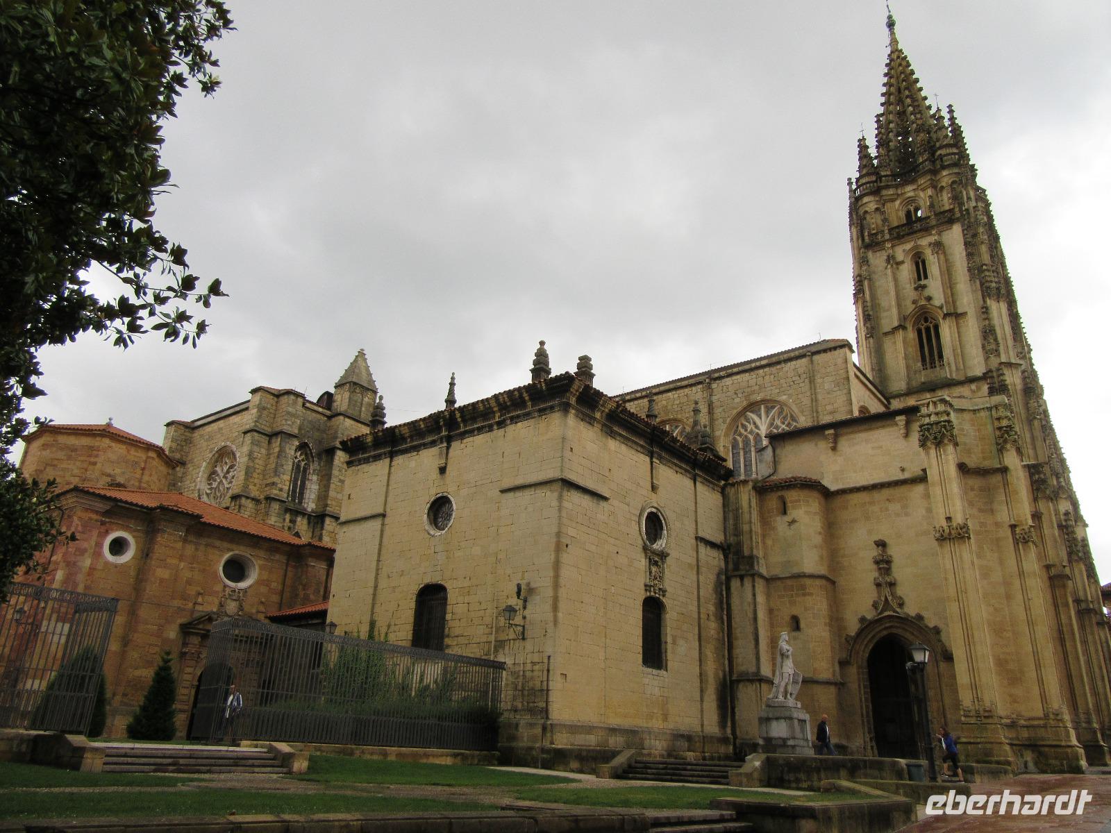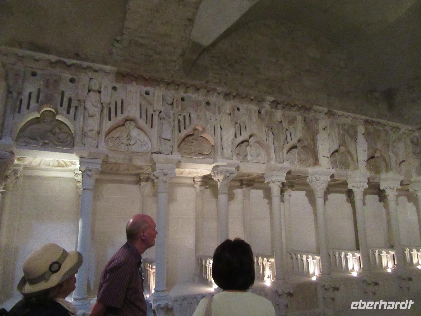 Danach fuhren wir weiter in die Hauptstadt Asturiens: Oviedo. In Oviedo haben wir unsere örtliche Reiseleiterin Marian kennengelernt und mit unserer Führung begonnen. Erst besuchten wir die Monumente des Naranco-Berges. Da haben wir die Reste der präromanischen Geschichte Asturiens gesehen, die bei der UNESCO als Weltkulturerbe erklärt wurden. Die Kirche „San Miguel de Lillo" war unser Ausgangspunkt. Da sahen wir verschiedene Elemente besonders von diesem Stil, obwohl nur zwei der drei Teile des Gebäudes immer noch erhalten sind. Dann besuchten wir den Palast „Santa Maria del Naranco". Es ist das einzige Gebäude in diesem Stil in der ganzen Welt und deswegen ist der Verwendungszweck nicht gänzlich klar. Sicher ist, dass König Ramiro I beide Gebäude baute und benutzte.