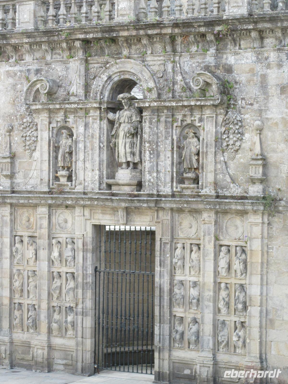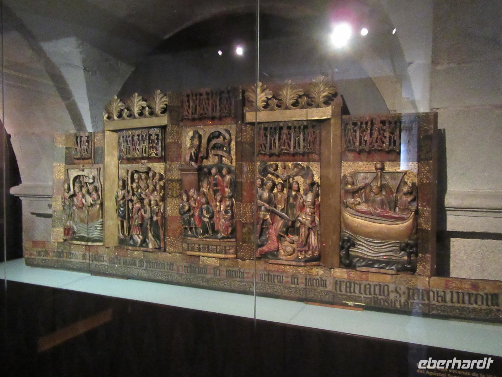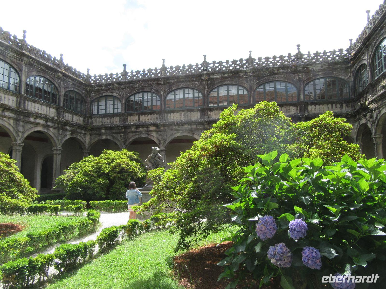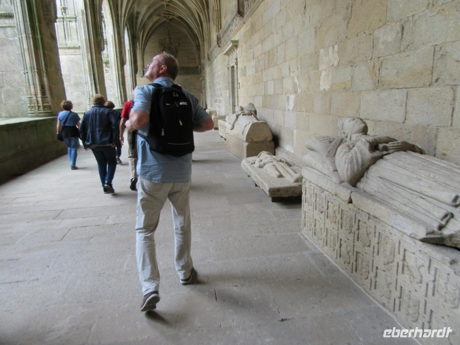 Danach kam unser drittes Muss des Tages: die Kathedrale in Santiago de Compostela besuchen. Wir fuhren ein Stück weiter entlang der Küste und weiter über eine komplizierte Straße bergauf, über die Nationalstraßen und bis nach Santiago de Compostela. Als wir in der Stadt ankamen, hatten wir etwas Freizeit für die ersten Eindrücke bekommen und um etwas Kulinarisches zu probieren. Typische Spezialitäten haben wir probiert, wie: Empanadas, den Wein „Albariño" oder den Tintenfisch „Pulpo a la Gallega". Unsere Mittagspause war vorbei und wir trafen unseren örtlichen Reiseleiter Bartug, der uns die Altstadt erklärte. Bei einem Bummel bestaunten wir die traditionellen Häuser für die reichen Familien mit Steinbögen im Erdgeschoss und den typischen Balkonen, sowie einige Paläste in der Stadt. Langsam erreichten wir den Platz „Prateria", wo wir die Pferde Brünne und die Fassade der Kathedrale gesehen haben. An diesem Punkt konnten wir nicht mehr warten und gingen ins Museum der Kathedrale. Es gab viele interessanten Sachen, wie den alten Stein-Kor, verschiedene Teppiche und Heilligen-Monumente und das „Codex Calixtinus", der auf der Route im Mittelalter geschrieben wurde. Außerdem waren wir auf dem Balkon und bekamen wunderschöne Ausblicke auf den Platz Obradorio und den Innenhof mit den Gräben. Die Kathedrale von innen haben wir auch gesehen, eine kleine Messe in einer Kapelle gefunden und den Heiligen Jakob in seinem Altar begrüßt. Anschließend besuchten wir die römische Kirche und das ganze Gebäude von außen, nicht zu vergessen das Kloster und den Obradorio-Platz.