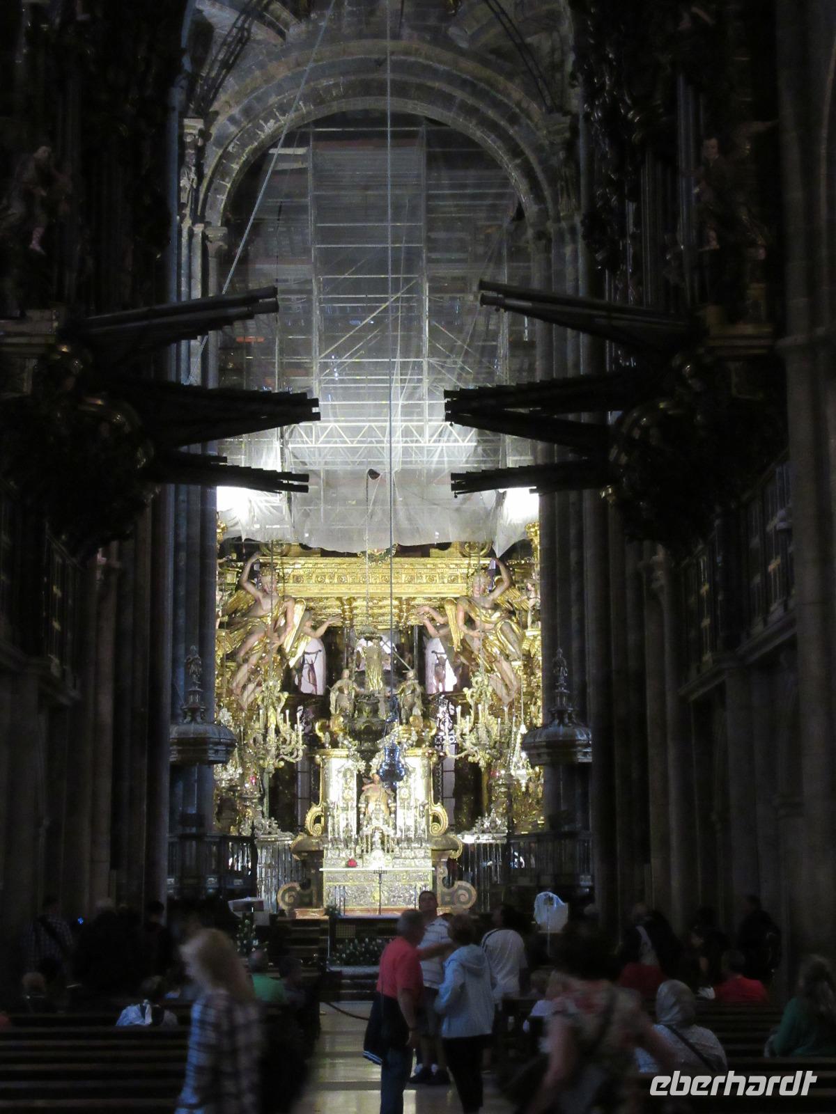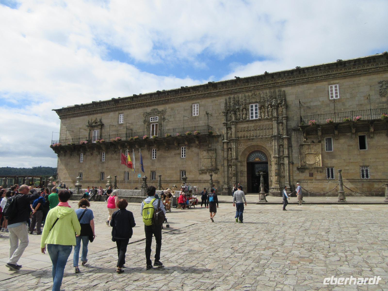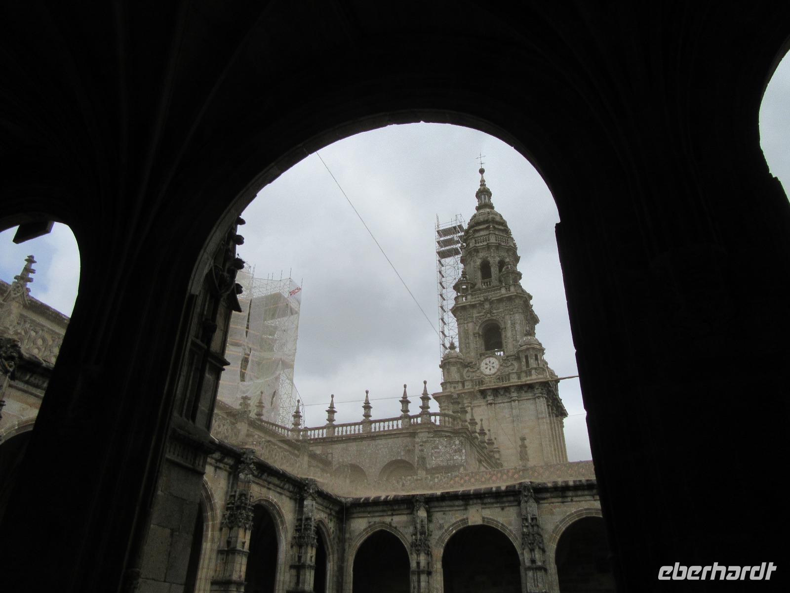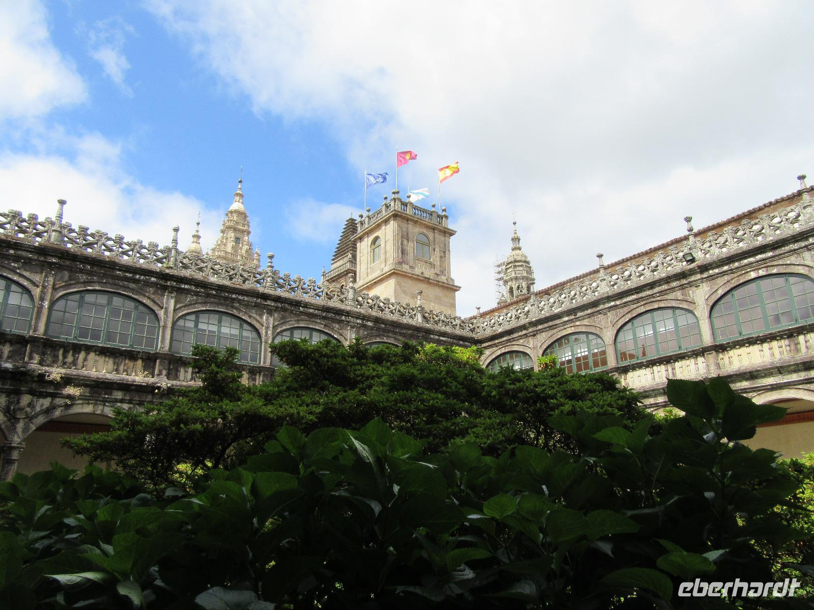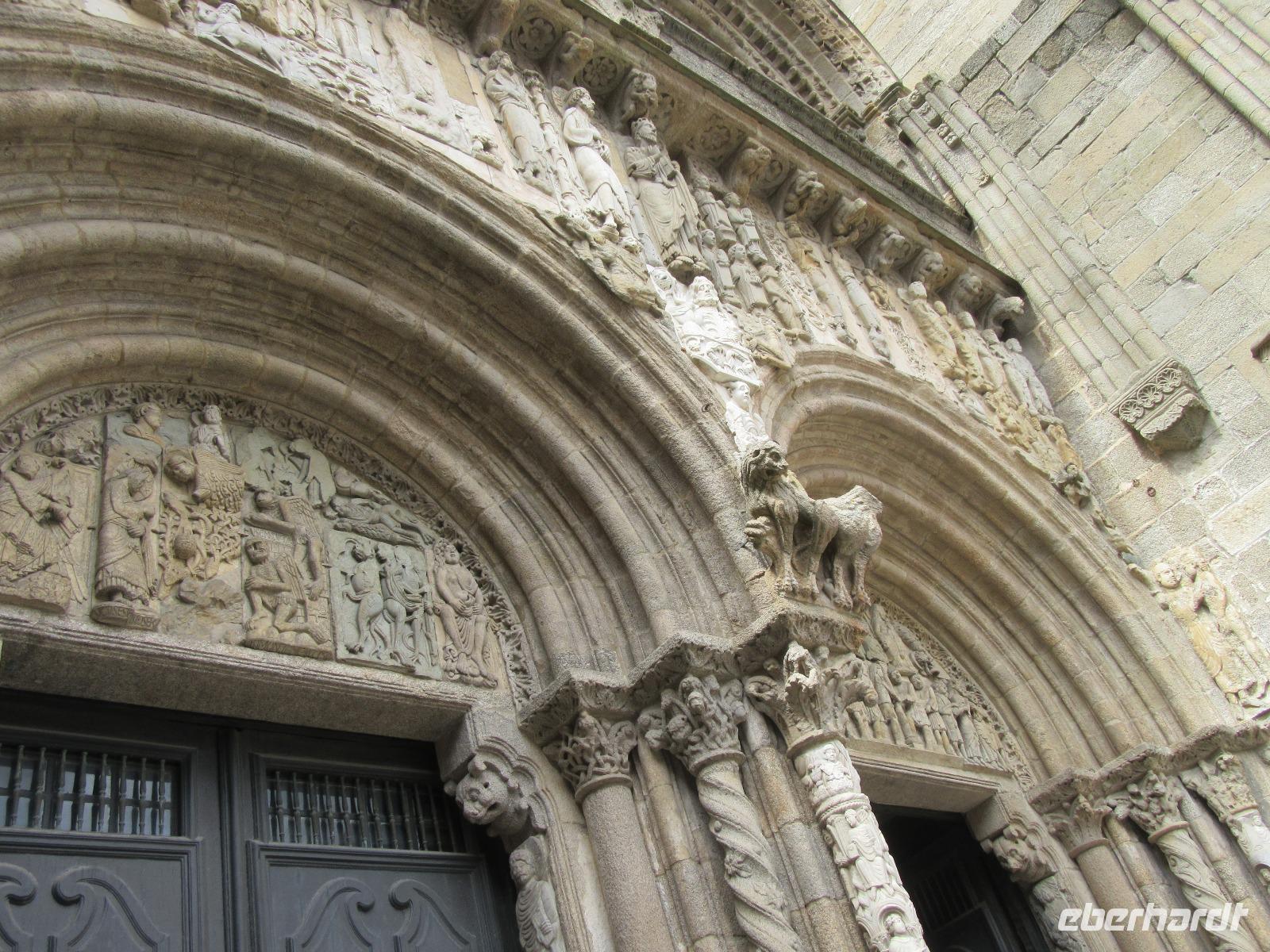 Danach kam unser drittes Muss des Tages: die Kathedrale in Santiago de Compostela besuchen. Wir fuhren ein Stück weiter entlang der Küste und weiter über eine komplizierte Straße bergauf, über die Nationalstraßen und bis nach Santiago de Compostela. Als wir in der Stadt ankamen, hatten wir etwas Freizeit für die ersten Eindrücke bekommen und um etwas Kulinarisches zu probieren. Typische Spezialitäten haben wir probiert, wie: Empanadas, den Wein „Albariño" oder den Tintenfisch „Pulpo a la Gallega". Unsere Mittagspause war vorbei und wir trafen unseren örtlichen Reiseleiter Bartug, der uns die Altstadt erklärte. Bei einem Bummel bestaunten wir die traditionellen Häuser für die reichen Familien mit Steinbögen im Erdgeschoss und den typischen Balkonen, sowie einige Paläste in der Stadt. Langsam erreichten wir den Platz „Prateria", wo wir die Pferde Brünne und die Fassade der Kathedrale gesehen haben. An diesem Punkt konnten wir nicht mehr warten und gingen ins Museum der Kathedrale. Es gab viele interessanten Sachen, wie den alten Stein-Kor, verschiedene Teppiche und Heilligen-Monumente und das „Codex Calixtinus", der auf der Route im Mittelalter geschrieben wurde. Außerdem waren wir auf dem Balkon und bekamen wunderschöne Ausblicke auf den Platz Obradorio und den Innenhof mit den Gräben. Die Kathedrale von innen haben wir auch gesehen, eine kleine Messe in einer Kapelle gefunden und den Heiligen Jakob in seinem Altar begrüßt. Anschließend besuchten wir die römische Kirche und das ganze Gebäude von außen, nicht zu vergessen das Kloster und den Obradorio-Platz.