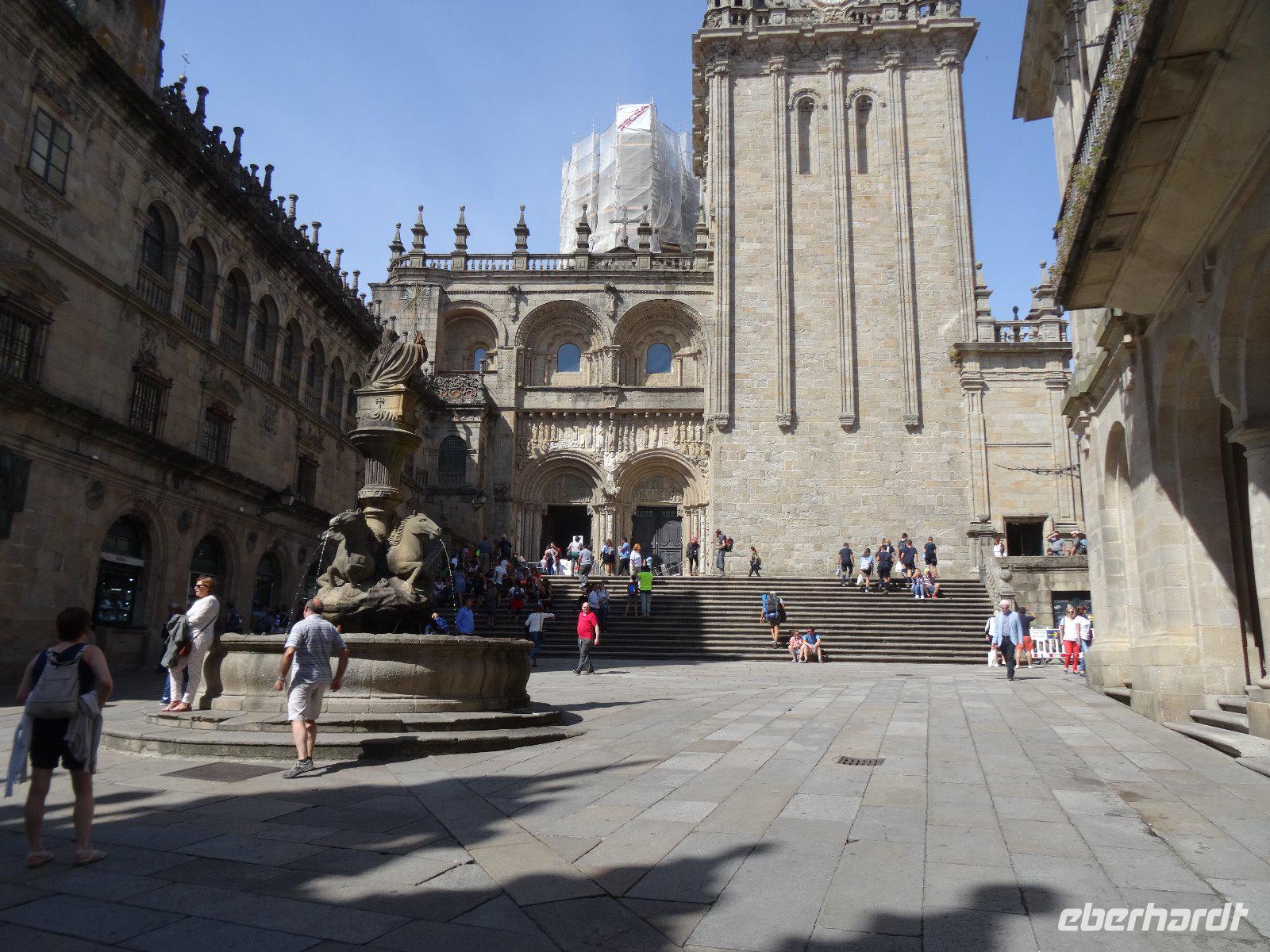 Galizien wartet mit weiteren Höhepunkten auf uns - wir fahren an das Ende der Welt. Kap Fisterra erfreut uns mit Sonnenschein und guter Sicht, viele Fotos entstehen, mal mit mal ohne Pilgerschuh. Dann geht es weiter Richtung Santiago de Compostela, aber vorher wird noch Brot und Wein gekauft , Öl und Oliven haben wir schon und so steht einem kleinen Picknick in Ezaro nichts im Wege. Der Platz ist ideal, es gibt Schatten, Tische und Bänke, Strand und sogar Toiletten. Solcherart gestärkt fällt uns der restliche Weg nicht mehr schwer und so können wir am Nachmittag eine interessante Stadtführung mit Besuch der Kathedrale unternehmen. Wir hören, wie der heilige Jakobus nach Santiago kam und dass er im Jahre 844 auf einem Schimmel erschien, um den Spaniern in ihrem Kampf gegen die Mauren beizustehen.