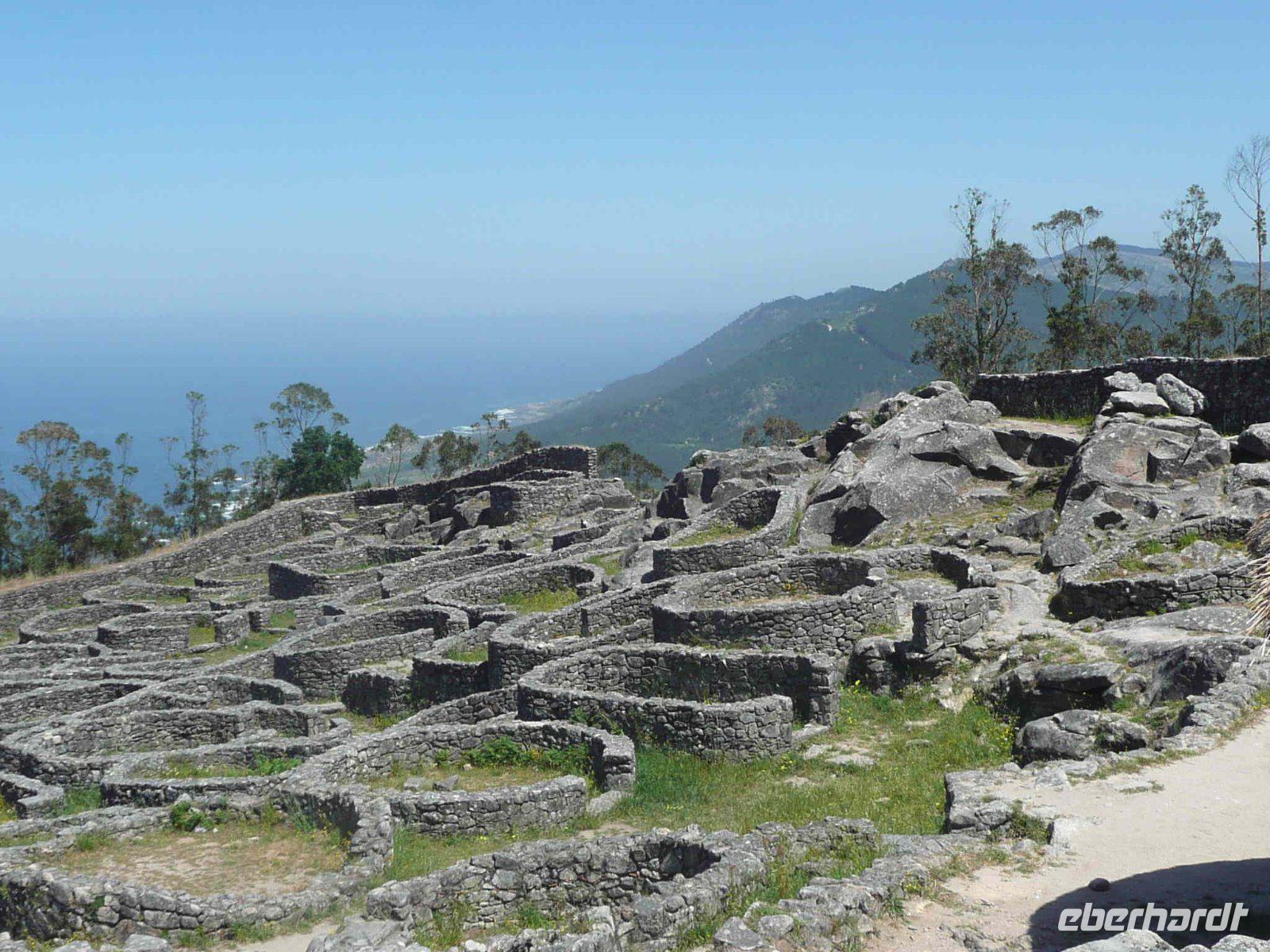 Nun steht noch ein weiterer Berg im Programm, der Monte Santa Trega mit seinem Aussichtspunkt und den Resten eines keltischen Dorfes. Der Berggipfel hat sich leider verhüllt und so hat man keine Fernsicht. Aber das Keltendorf durchwandern wir und stellen unsere eigenen Theorien zu den ehemaligen Bewohnern auf. Der Berg, strategisch günstig gelegen, war bereits in der Jungsteinzeit besiedelt und wurde von den Kelten seit dem 6. Jh.v.Chr. genutzt.