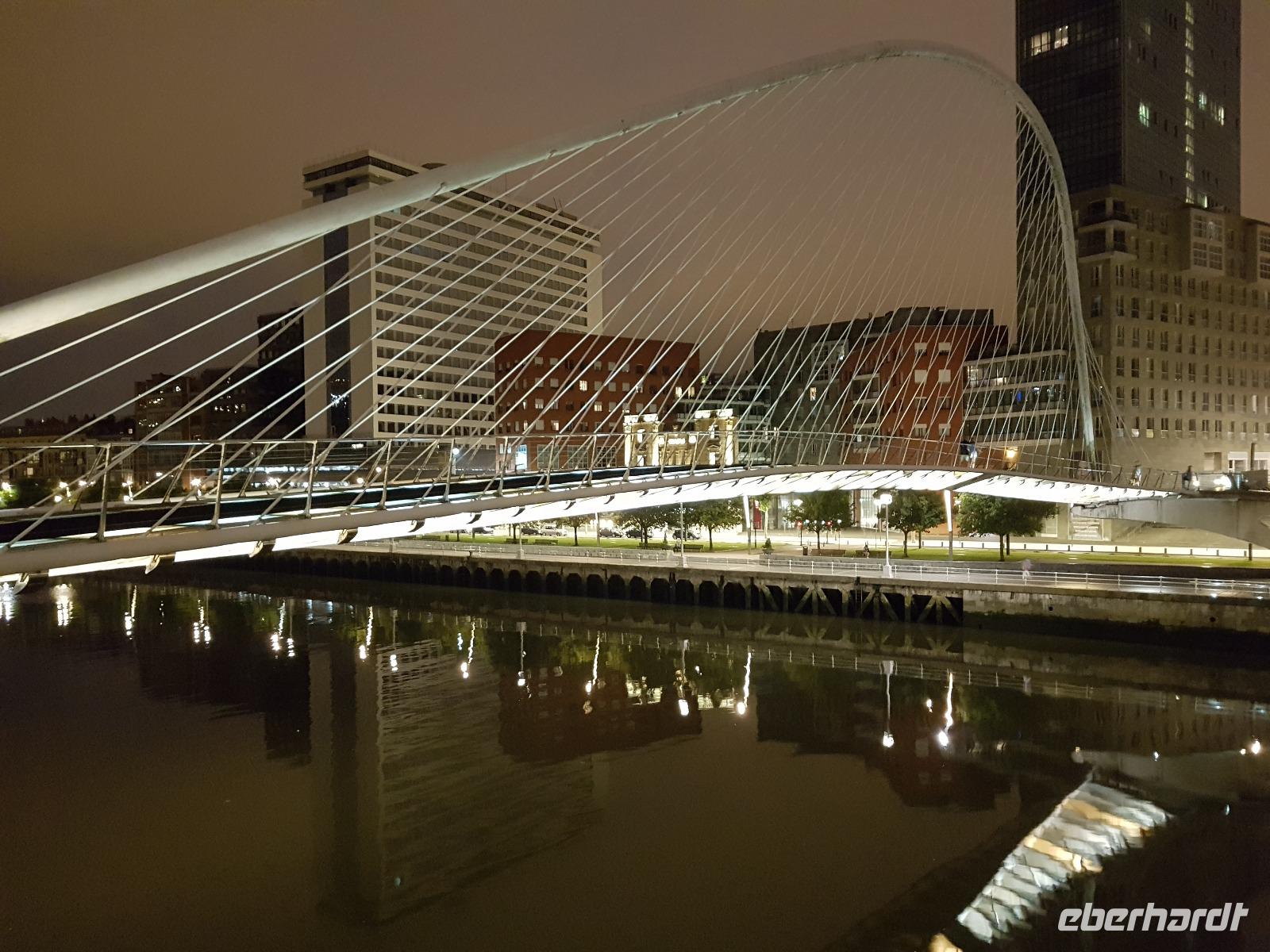 Bis 19.30 Uhr zum Abendessen gehen einige schon heute auf einen Spaziergang durch die historische Altstadt und andere schauen im Hotel Fussball wie Spanien heute bei der Weltmeisterschaft gegen Russland rausfliegt. Wir laufen ca. 25 Minuten bis zum Restaurant Farketa 54 und uns hat es dort sehr sehr gut geschmeckt: Iberico Schinken, gegrillter Spargel, gefüllte Paprika und als Hauptspeise Entrecot, Seehecht oder Scholle. Es war alles Spitze und die Krönung hausgemachter Käse-Kuchen wie von Oma. Heute stellen wir uns alle kurz vor damit wir wissen wie wir heißen, woher wir kommen oder warum man diese Reise gebucht hat. Wir freuen uns, dass das Hotel nicht um die Ecke liegt, sodas wir das gute Essen verdauen können. Gegenüber vom Hotel liegt die berühmte Zubizuri Brücke, nachts wunderschön beleuchtet.