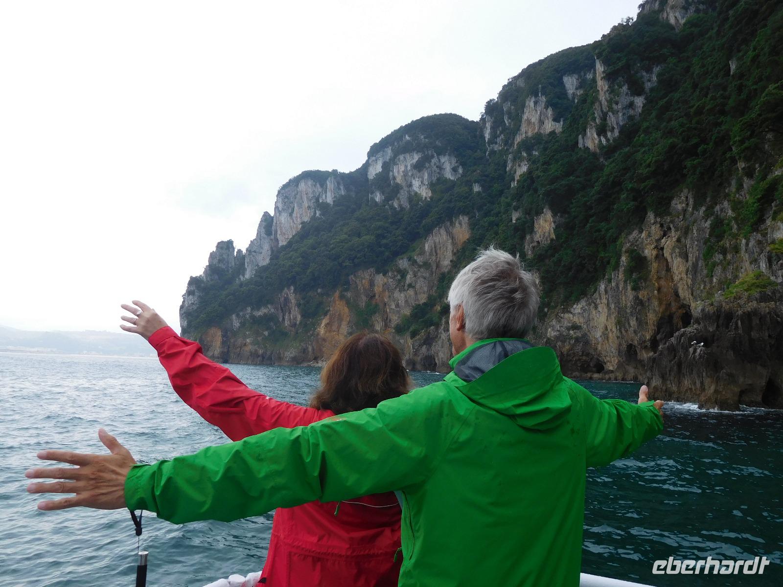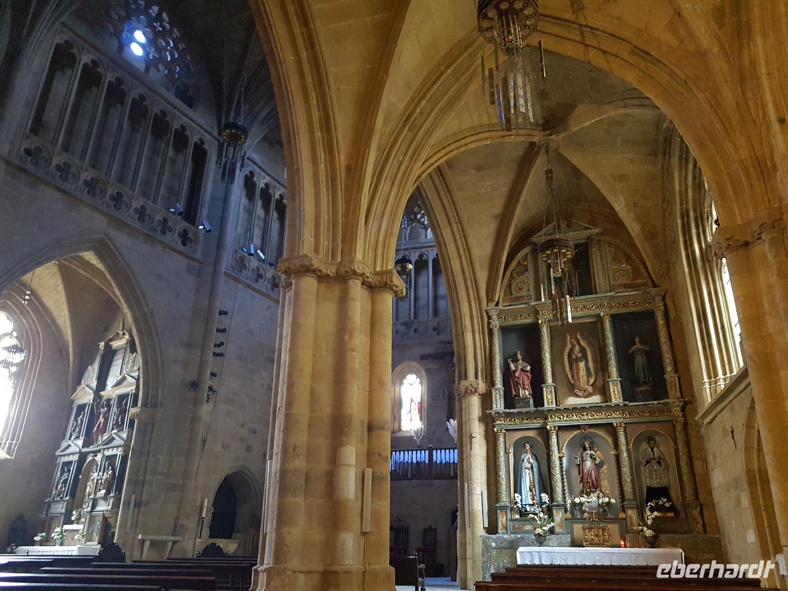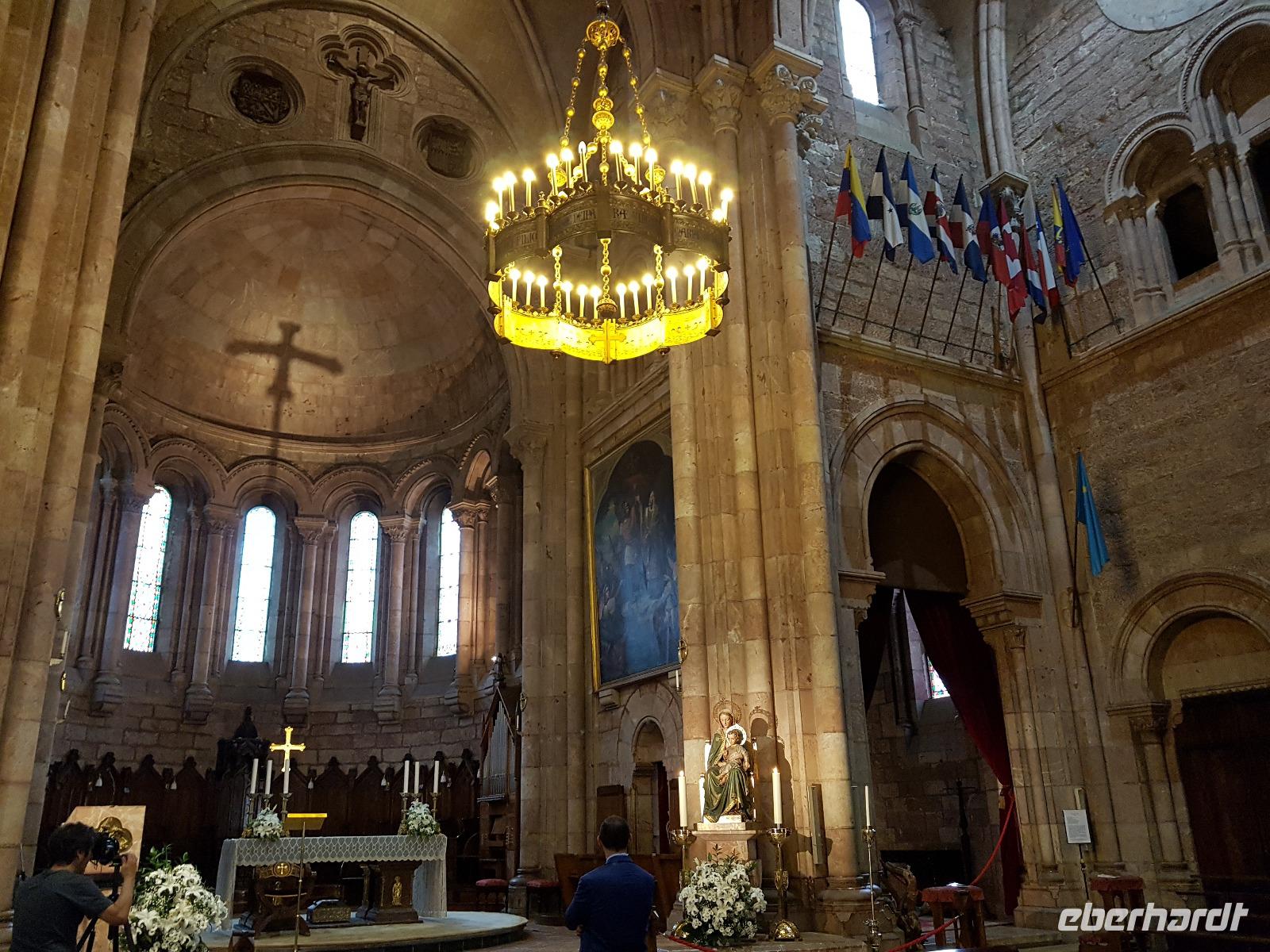 Wir spazieren erstmal durch die Pereda Allee mit seiner neuen Stiftung Botin Gebäude, eine Art Guggenheim Museum hier in Santander. Wir laufen bis zum Puerto Chico Hafen wo wir genug Zeit zum Mittagsessen haben. Wir treffen hier zufällig den Präsidenten des Bundeslandes Kantabrien, Herrn Miguel Angel Revilla, der allen Eberhardt Travel Gästen eine gute weitere Reise wünscht. Um 14.30 Uhr treffen wir uns wieder und fahren hoch auf die Halbinsel Magdalena, wo das Magdalena-Schloss steht. Heute gehört es zur Universität Menendez Pelayo. Hier werden im Sommer verschiedene internationale Kurse und Vorlesungen angeboten. Danach fahren wir bis zum Cabo Mayor-Leuchtturm, von wo wir wieder eine herrliche Aussicht auf die kantabrische Küste haben. 5 Gäste wollen schon ins Hotel, wir fahren kurz vorbei aber alle Anderen wollen hier noch nicht aussteigen. In der herrlichen Altstadt befindet sich die beeindruckende Abtei Cuerpos Santos oder Kathedrale, welche wir noch anschauen wollen. Toll.