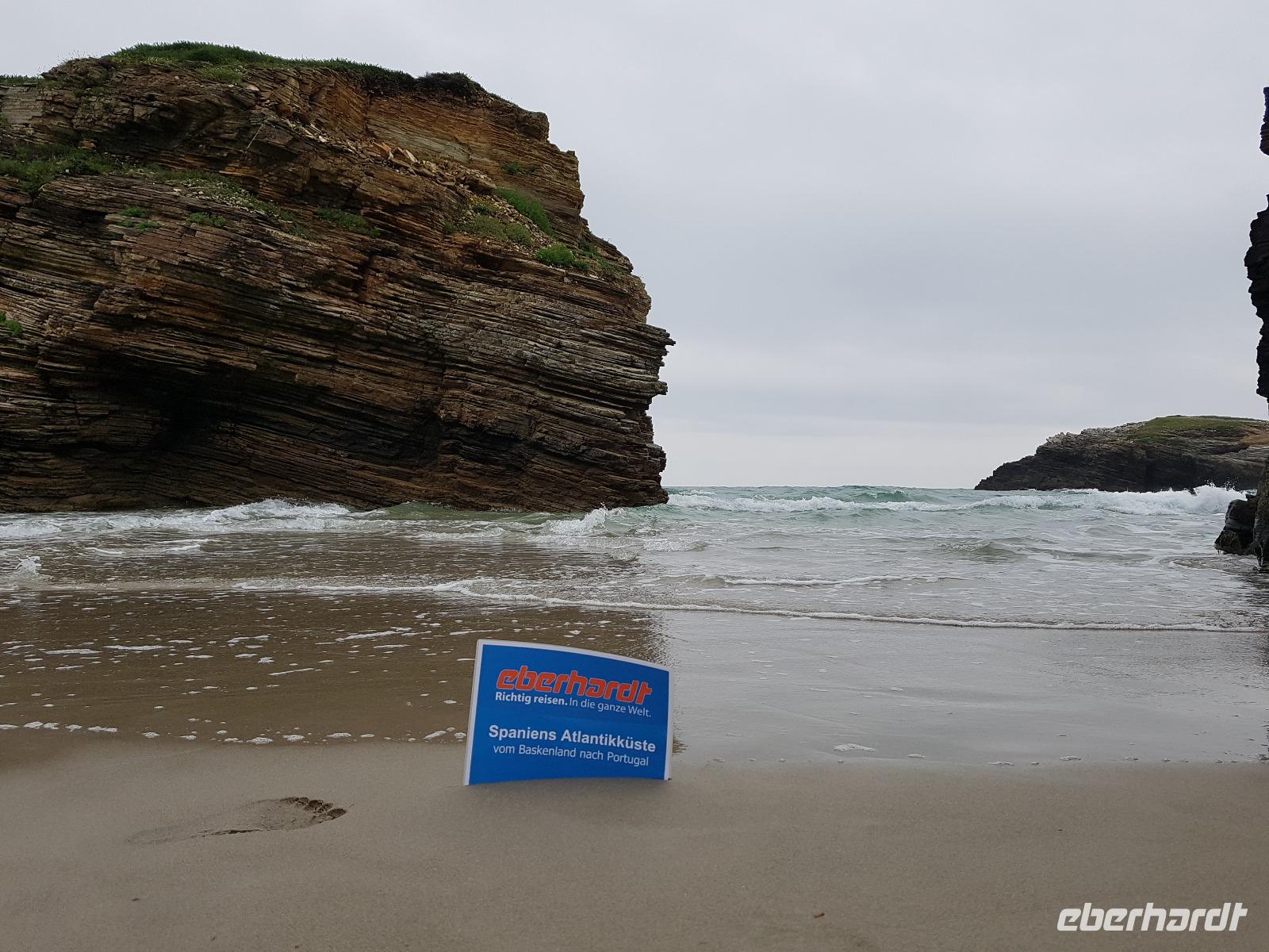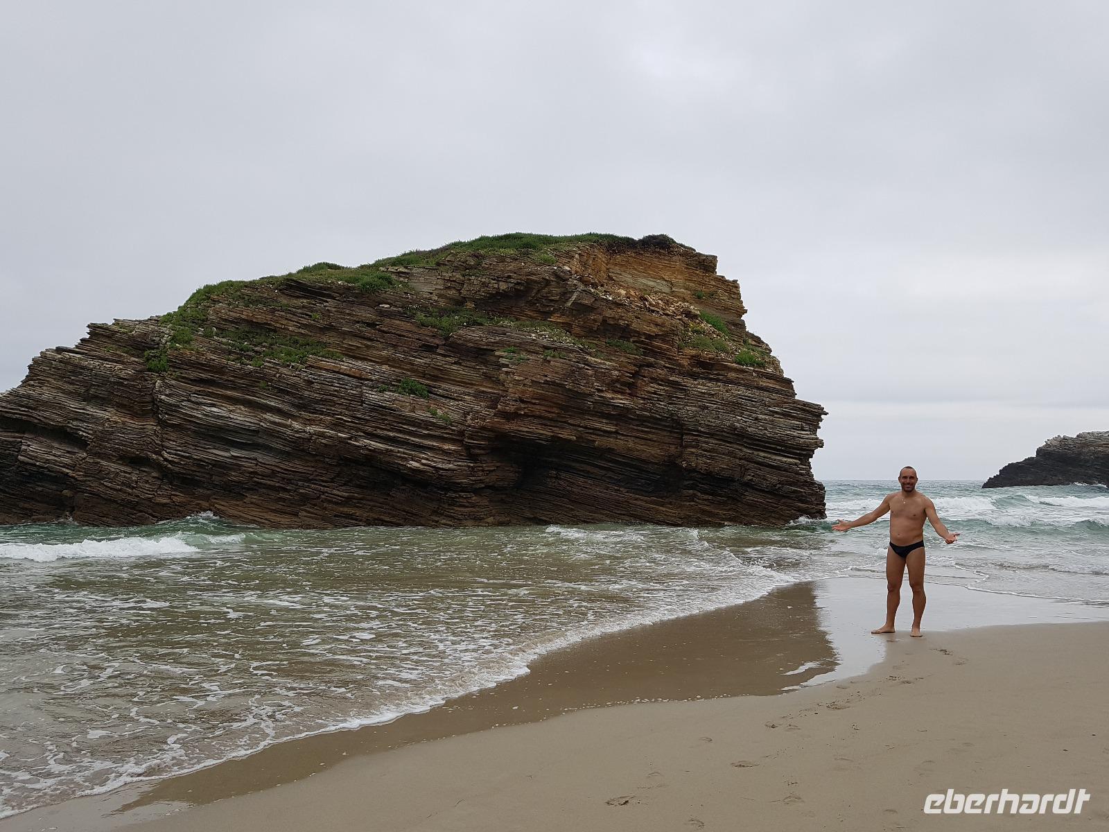 Früh am Morgen verlassen wir Oviedo und fahren ca. 2 Stunden bis zum Kathedralenstrand aucoder Praia As Catedrais, kurz nach der Grenze von Asturien, schon in Galicien. Der Name Kathedralenstrand entstand durch die bizarren, vom Meerwasser ausgewaschenen Felsformen, die besonders bei Ebbe gut zu sehen und zu erlaufen sind. Wir spazieren entlang dieses schönen Küstenabschnittes solange uns die Ebbe lässt und dabei spüren wir die gewaltige Kraft des Meeres! Zwei von uns gehen baden aber viele lassen die Schuhe bei den Treppen und laufen barfuß im Wasser. Herrlich hier.