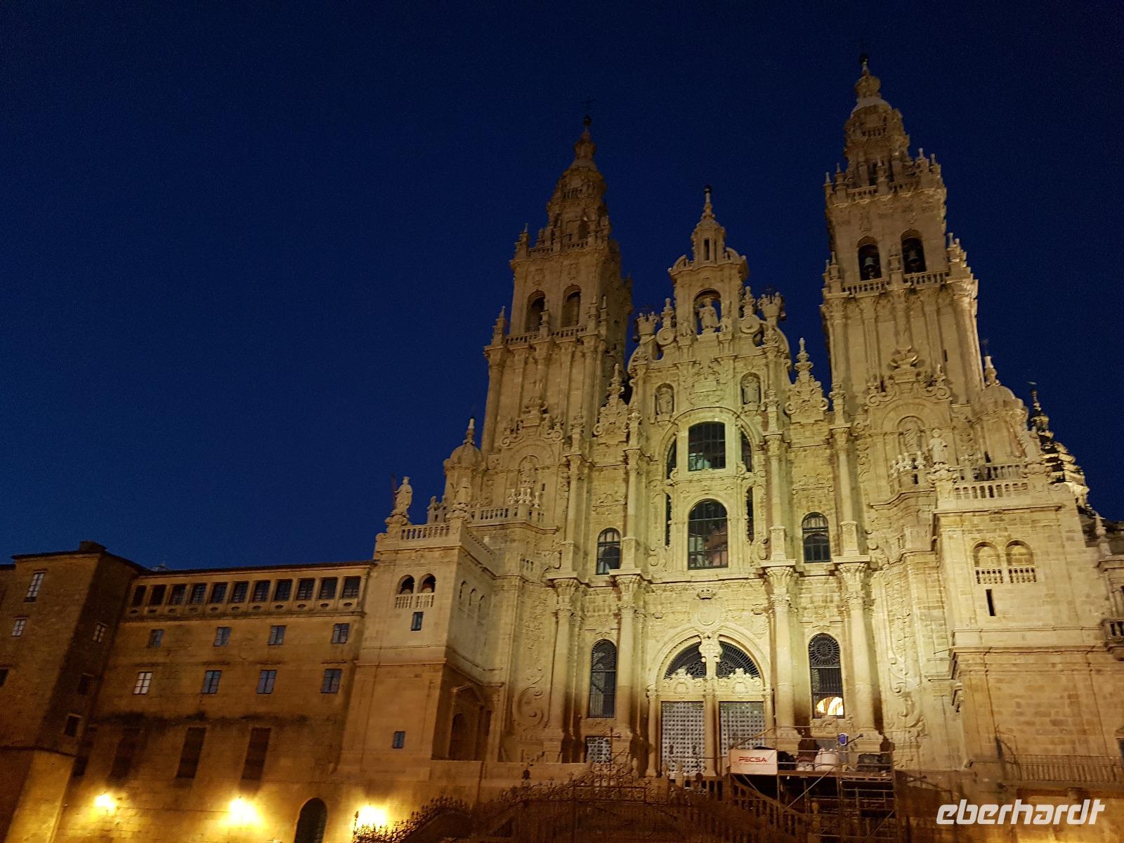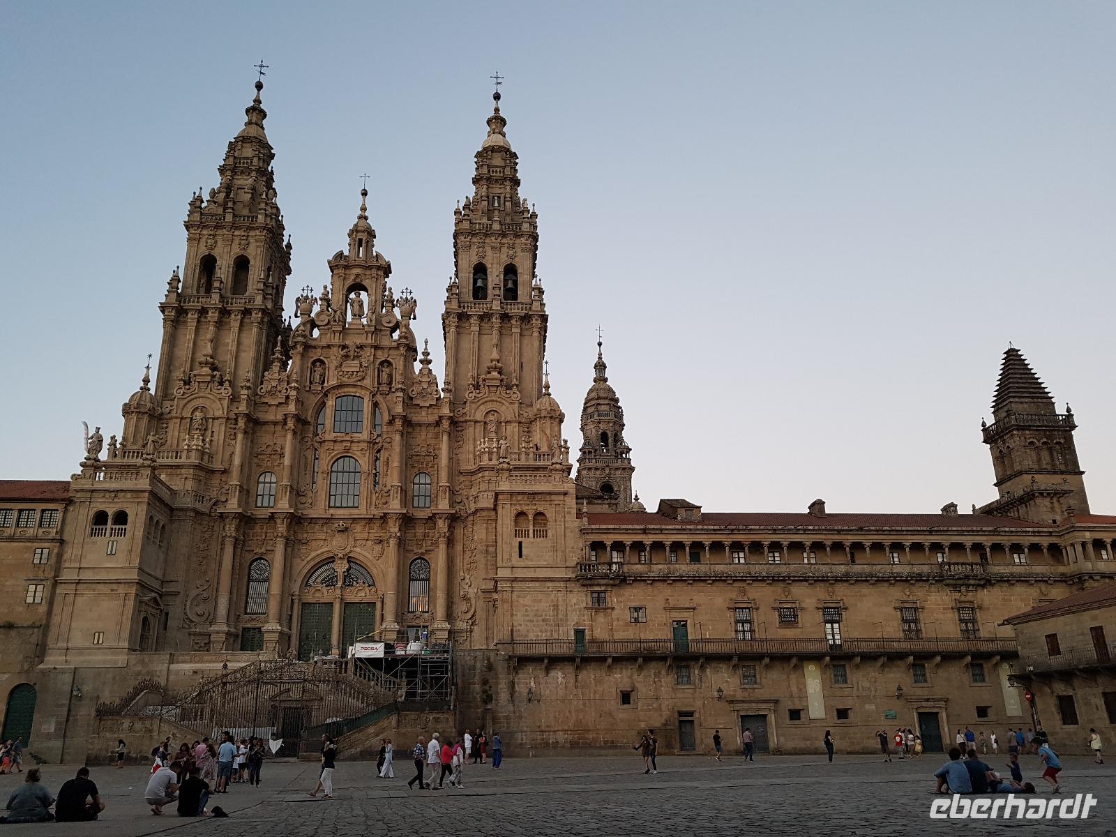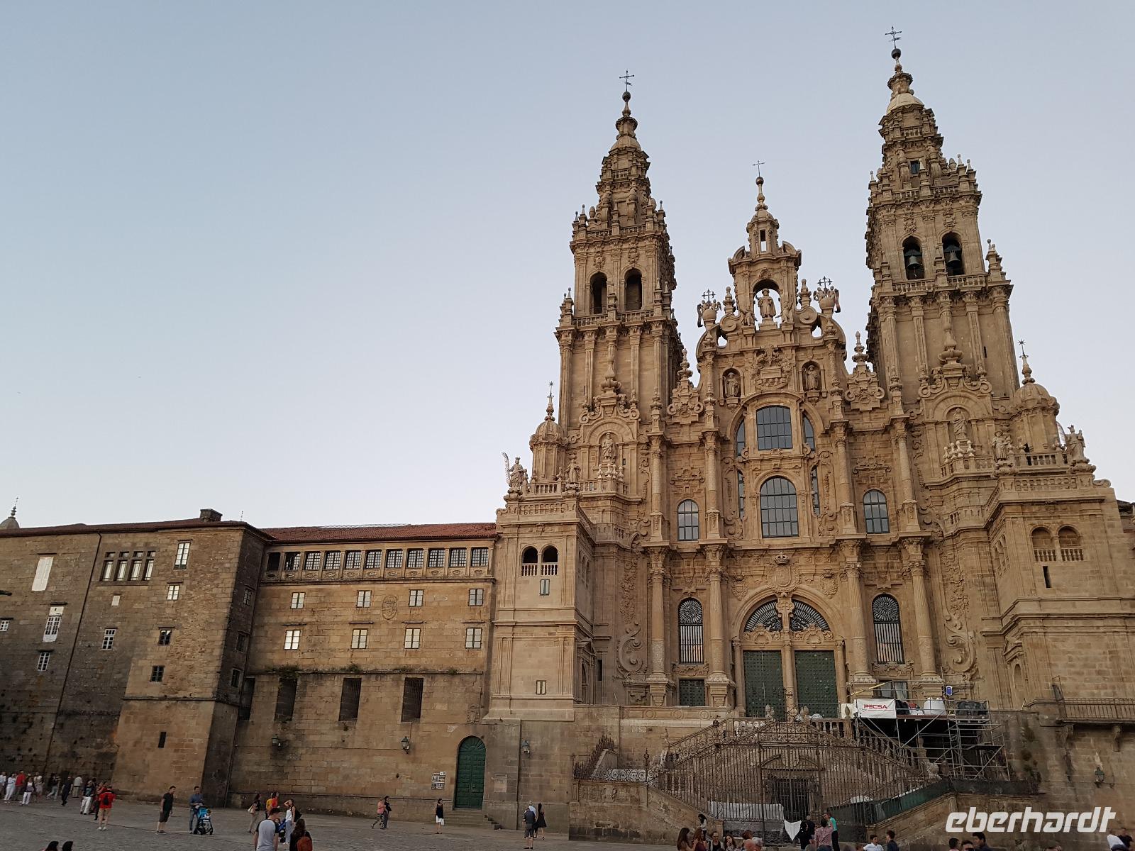 A Coruna hat uns alle begeistert. Diese Reise erfüllt oder überschreitet unsere Vorstellungen und die Sonne begleitet uns dabei. Heute fahren wir bis an das "Ende der Welt", zum Kap Fisterra. Zu römischer Zeit und im Mittelalter war dies das Ende der Welt. Viele Pilger kommen nach Santiago und lassen ihre Sorgen und Lasten hier. Der Leuchtturm gibt uns das Gefühl, an einem besonderen Ort zu sein. Unten das tiefdunkelblaue Meer und oben der klare, nocstrahlendblaue. Wir lassen unsere Seelen baumeln. Eigentlich wollen wir heute zum Wasserfall von Ezaro, doch wegen einem Fahrradrennen ist die Strecke dahin gesperrt. Trotzdem ist die Fahrt entlang der Küste bis Santiago de Compostela wunderschön. Die Strände an dieser Küste ähnlich wie in der Karibik. Weißer, traumhafter Sand und ein blaues Meer. Wir sehen die Berge und die Weinanbaugebiete der Rias Baixas von Galizien. Kurz vor 14 Uhr erreichen wir Santiago de Compostela, das berühmte Ziel des Jakobsweges. Unsere Zimmern beziehen wir im 4 Sterne Hotel Compostela und machen eine Stunde Mittagspause. Um 15 Uhr machen wir uns auf den Weg, um gemeinsam mit Batug, unserm örtlichen Reiseleiter die Kathedrale zu besichtigen. Benjamin geht erstmal mit den Gästen bis zum Puerta do Camino, dem Haupttor wo die Pilger in Santiago ankommen. Im Anschluss daran besuchen wir den Obradoiro-Platz und die Kathedrale, in welcher sich das Grab des Heiligen Jakob befindet. Danach und bis zum Abendessen um 20 Uhr haben wir noch Freizeit und einige holen sich einen Stempel im Pilgerbüro als Beweis, dass sie da waren. Nach dem Abendessen gehen einige von uns noch spazieren um diese tolle Stadt, auch wieder Unesco Weltkulturerbe beleuchtet zu bestaunen.