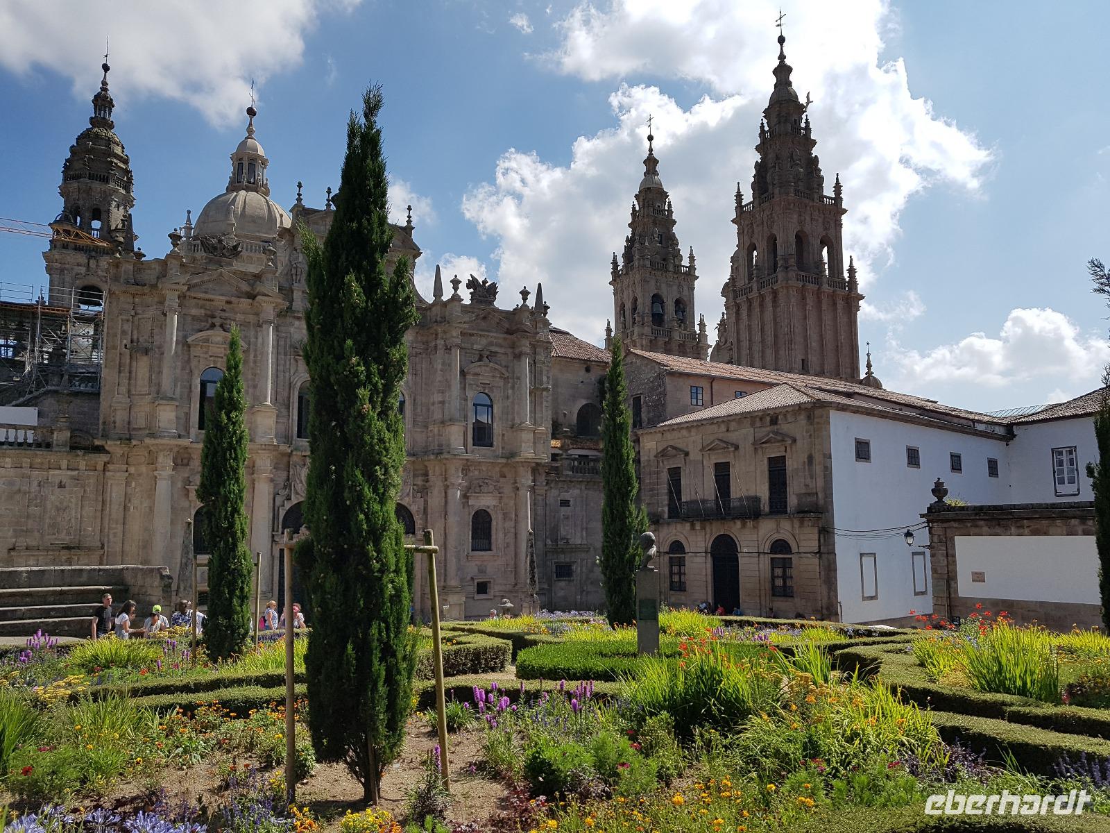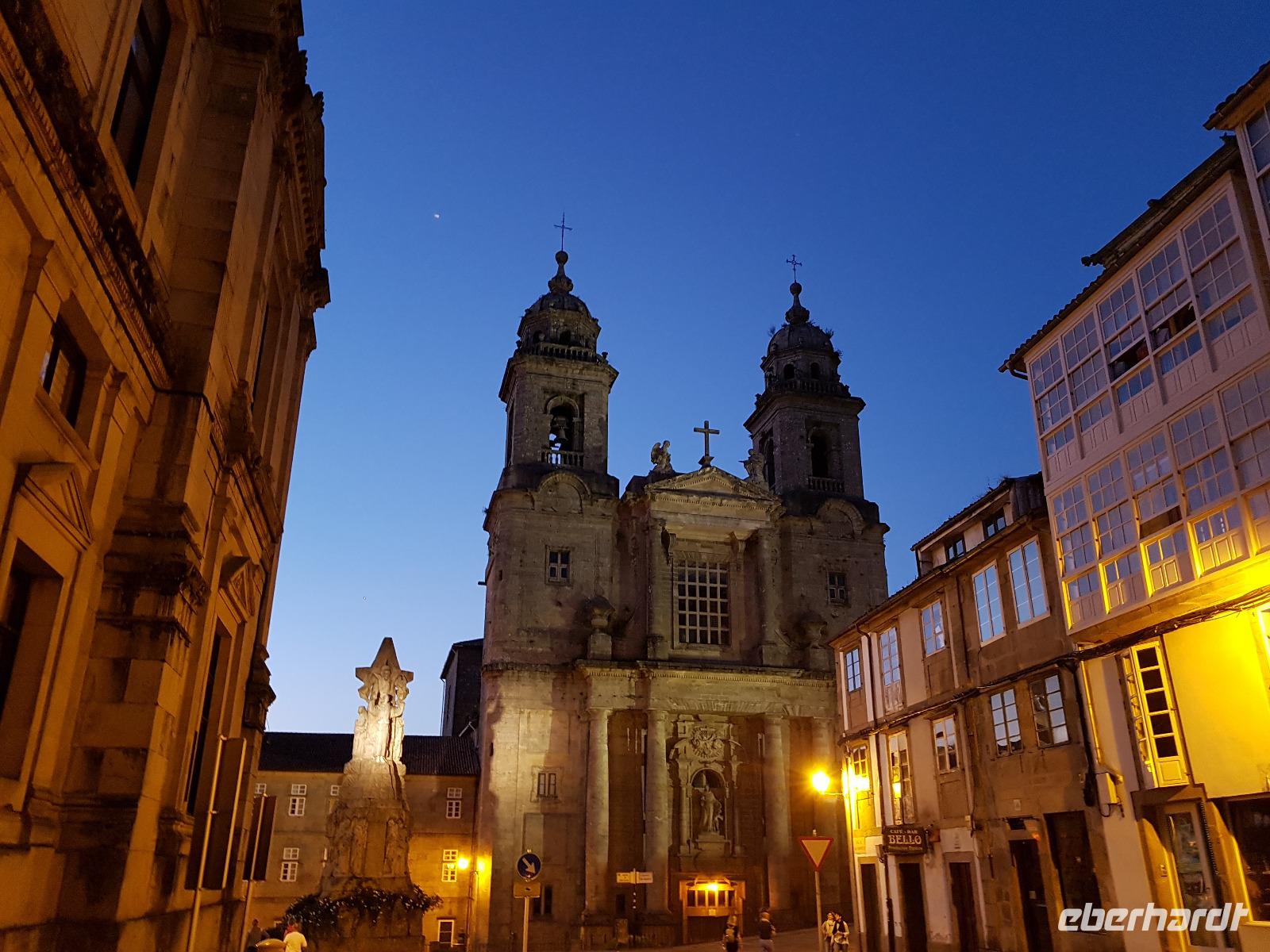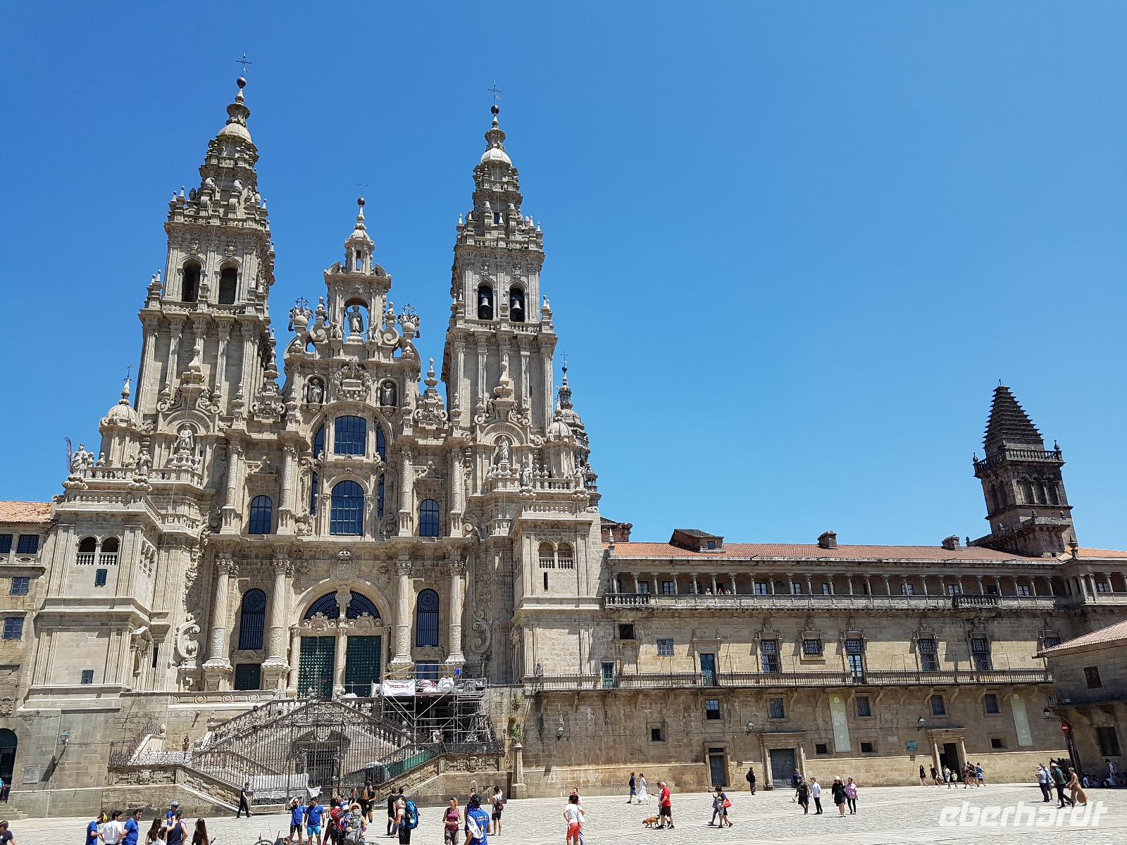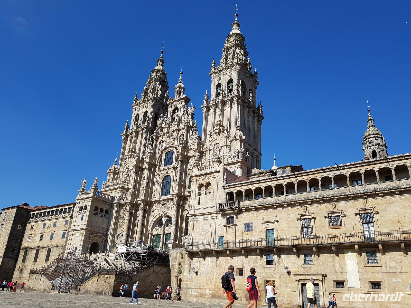 A Coruna hat uns alle begeistert. Diese Reise erfüllt oder überschreitet unsere Vorstellungen und die Sonne begleitet uns dabei. Heute fahren wir bis an das "Ende der Welt", zum Kap Fisterra. Zu römischer Zeit und im Mittelalter war dies das Ende der Welt. Viele Pilger kommen nach Santiago und lassen ihre Sorgen und Lasten hier. Der Leuchtturm gibt uns das Gefühl, an einem besonderen Ort zu sein. Unten das tiefdunkelblaue Meer und oben der klare, nocstrahlendblaue. Wir lassen unsere Seelen baumeln. Eigentlich wollen wir heute zum Wasserfall von Ezaro, doch wegen einem Fahrradrennen ist die Strecke dahin gesperrt. Trotzdem ist die Fahrt entlang der Küste bis Santiago de Compostela wunderschön. Die Strände an dieser Küste ähnlich wie in der Karibik. Weißer, traumhafter Sand und ein blaues Meer. Wir sehen die Berge und die Weinanbaugebiete der Rias Baixas von Galizien. Kurz vor 14 Uhr erreichen wir Santiago de Compostela, das berühmte Ziel des Jakobsweges. Unsere Zimmern beziehen wir im 4 Sterne Hotel Compostela und machen eine Stunde Mittagspause. Um 15 Uhr machen wir uns auf den Weg, um gemeinsam mit Batug, unserm örtlichen Reiseleiter die Kathedrale zu besichtigen. Benjamin geht erstmal mit den Gästen bis zum Puerta do Camino, dem Haupttor wo die Pilger in Santiago ankommen. Im Anschluss daran besuchen wir den Obradoiro-Platz und die Kathedrale, in welcher sich das Grab des Heiligen Jakob befindet. Danach und bis zum Abendessen um 20 Uhr haben wir noch Freizeit und einige holen sich einen Stempel im Pilgerbüro als Beweis, dass sie da waren. Nach dem Abendessen gehen einige von uns noch spazieren um diese tolle Stadt, auch wieder Unesco Weltkulturerbe beleuchtet zu bestaunen.