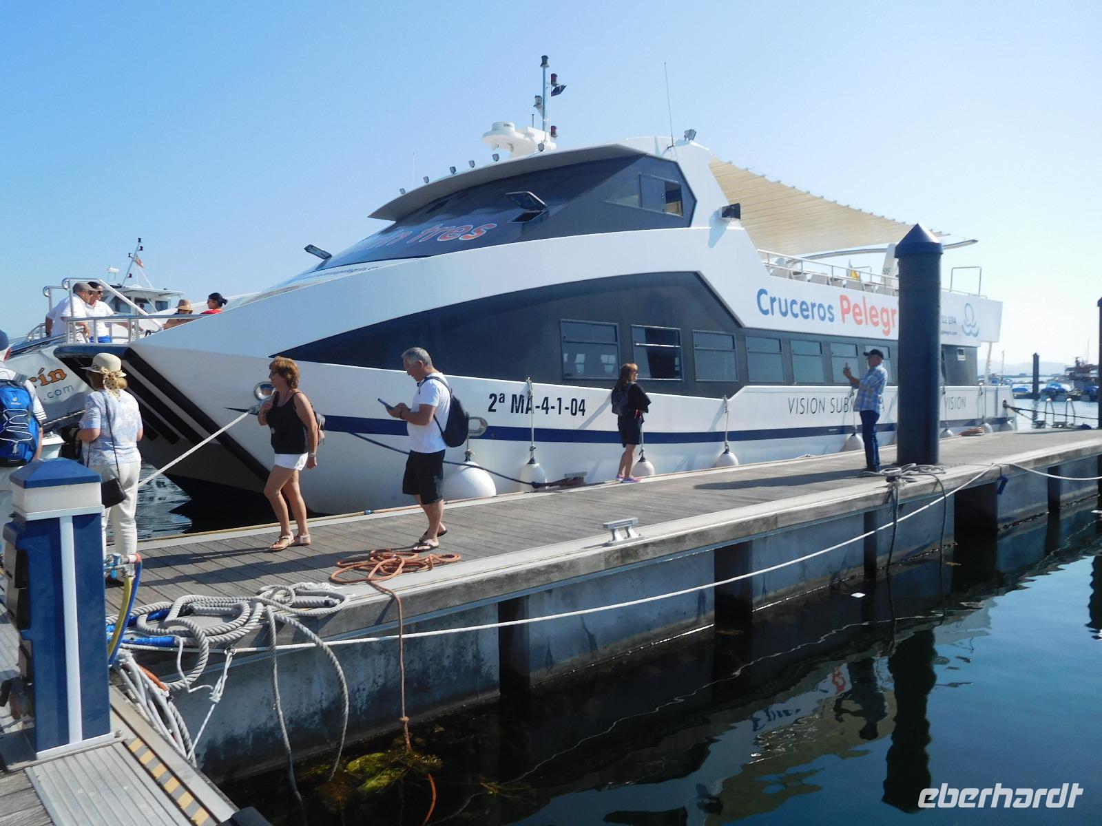 Heute müssen wir keinen Koffer mitnehmen, da wir 2 Nächte in Santiago bleiben. Es erwartet uns ein toller Ausflugstag und so war es auch. Wir fahren ungefähr 1 Stunde direkt zum Hafen der Halbinsel O'Grove. Hier besteigen wir die Pelegrin Fähre, mit welcher wir eine Schifffahrt in die Fjordähnliche Ria machen um aus der Nähe zu sehen, wie Muscheln gezüchtet werden. Die Küstenorte Galiziens sind sehr berühmt für ihre Miesmuschel- und Austernzucht, auch Jakobsmuscheln kann man sehen. Mit dem Ausflugsboot geht es hinaus zu einer Muschelbank, wo uns Benjamin die Arbeitsweise der Fischer erklärt. An Bord verkosten wir die fangfrischen Muscheln, dazu gibt es Wein. Lecker, lecker, lecker. Der Wein (oder die Muscheln?)hatten kleine Nebenwirkungen. Als spanische Musik aufspielt, fangen die Spanier, die mit an Bord waren, an zu tanzen und ein paar von uns Deutschen machte mit. Wir haben gelacht, getanzt und dabei gut gegessen und getrunken.