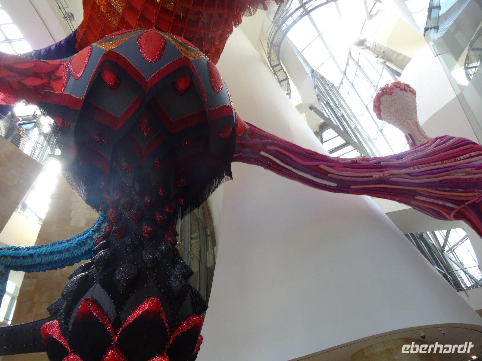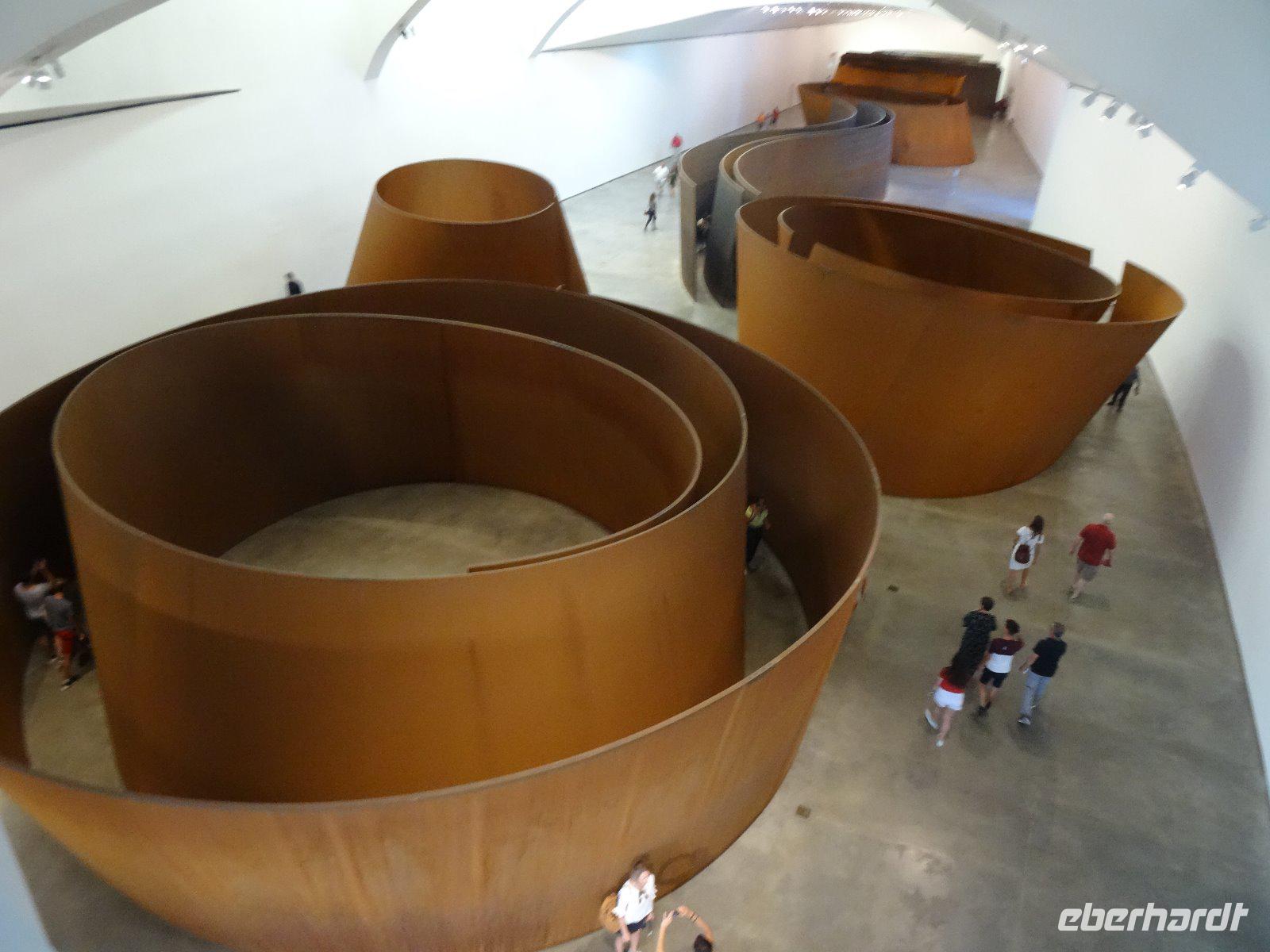 Wir fahren zunächst mit dem Bus mit unserer Stadtführerin Cristina durch die Stadt und machen uns ein Bild vom Wandel einer schmutzigen Industriestadt zu einer modernen, sauberen Großstadt. Nach dem Niedergang der Eisen- und Stahlindustrie hat sich Bilbao neu erfunden, hat die Werten aus der Stadt verbannt und die Industriegelände saniert und neu bebaut. Wir sehen auch das ganz alte Bilbao und spazieren an der Kathedrale vorbei durch die 7 alten Straßen. Am Mittag steht das Guggenheim - Museum auf dem Programm, im Rahmen einer Führung lernen wir das Konzept des Museums und die wichtigsten Bestandteile der Ausstellung kennen, danach gibt es Freizeit und jeder kann nach Belieben das Museum weiter ansehen oder auch einen kleinen Bummel unternehmen, sich etwas stärken und ausruhen. Am Nachmittag fahren wir zu einem weiteren interessanten Denkmal - der Schwebefähre über den Nervion-Fluss. Sie verbindet die Stadtteile Areeta mit Portugalete und ist seit 1893 in Betrieb. Seit 2006 ist sie UNESCO-Weltkulturerbe. Leider war der Fahrstuhl, mit dem man einen Steg über der Fähre erreichen kann, außer Betrieb. Dennoch unternahmen wir zumindest eine Fahrt mit der Schwebefähre und genossen diese einmalige Fahrt.