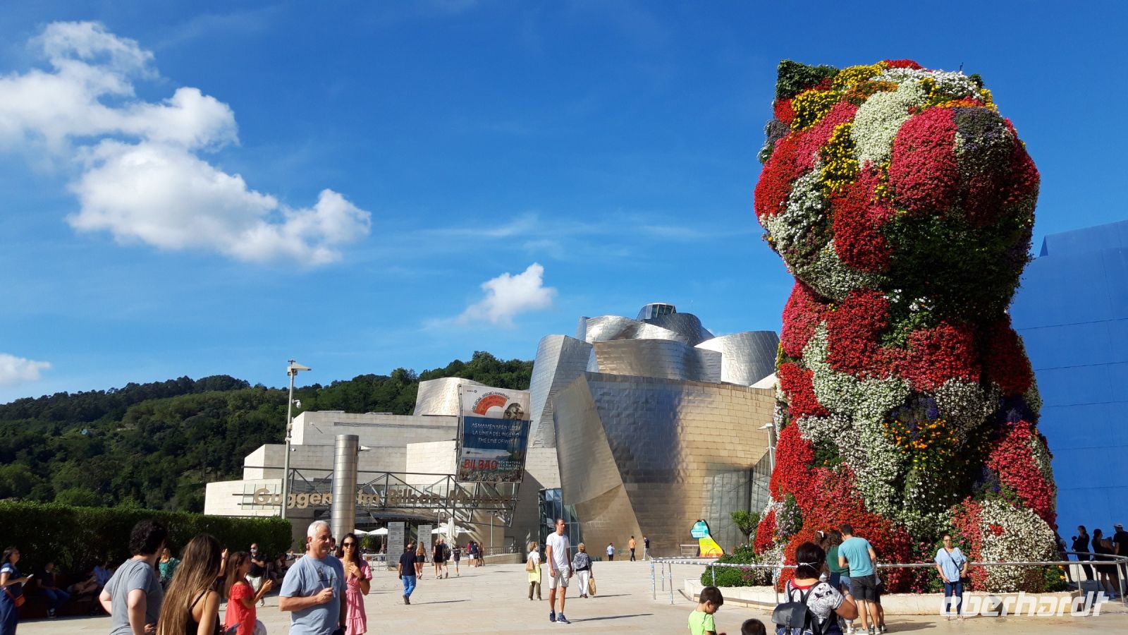 Am Nachmittag geht es dann weiter zum wohl bekanntesten Bauwerk der Stadt, dem Guggenheim Museum. Bilbao setzte 1991 mit der Investition in dieses kulturelle Großprojekt wortwörtlich alles auf eine Karte, denn während Kunst und Unterstützung aus New York kamen, musste die baskische Regierung die knapp 200 Millionen US-Dollar für Baukosten, Vertragsgebühren und Leihverträge selbst aufbringen. Für den Bau wurde von der Guggenheim Stiftung der amerikanische Architekt Frank O. Gehry ausgewählt, der mit seinen dekonstruktivistischen Gebäuden seit Ende der 1980er Jahre weltweit für Aufsehen sorgt. Doch schlussendlich wurde das gigantische Schiff aus Kalkstein und Titan zum neuen Aushängeschild der Stadt und das Museum schaffte es innerhalb der ersten drei Jahre die Investitionen zurück zu erwirtschaften. Dieses Phänomen touristischer Erschließung durch nur ein prägnantes Kulturprojekt war so einzigartig, dass es heute als Bilbao-Effekt bezeichnet wird. Auch wir sind fasziniert, vor allem durch die beeindruckende Architektur, die doch im Gesamten die beherbergte Kunst in den Schatten stellt.
