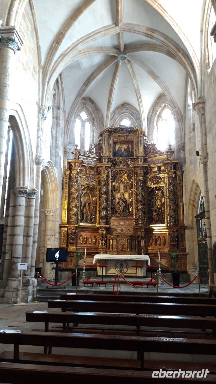 Unser erster Halt ist die Kleinstadt Laredo, die heute vor allem bei Spaniern als Badeort beliebt ist. Uns interessiert jedoch eher der kleine alte Ortskern, wo sich die romanische Kirche Santa María de la Asunción befindet. Diese wurde dem Dorf durch Alfons VIII. im 13. Jahrhundert gestiftet, nachdem viele Männer aus Laredo bei der erfolgreichen Rückeroberung Sevillas von der maurischen Besatzung mitgewirkt hatten. Die kleine Kirche ist ein wichtiger Punkt auf dem Jakobsweg, der entlang der Küste führt – somit eine gute Gelegenheit sich mit den verschiedenen Pilgerwegen in Richtung Santiago de Compostela auseinanderzusetzen, denn der bekannteste, der Camino Francès, ist bei Weitem nicht der einzige richtige Weg. So erkennen wir, dass wir auch in einer gewissen Weise Pilger sind, auch wenn wir nicht zu Fuß, per Rad oder zu Pferde unterwegs sind.