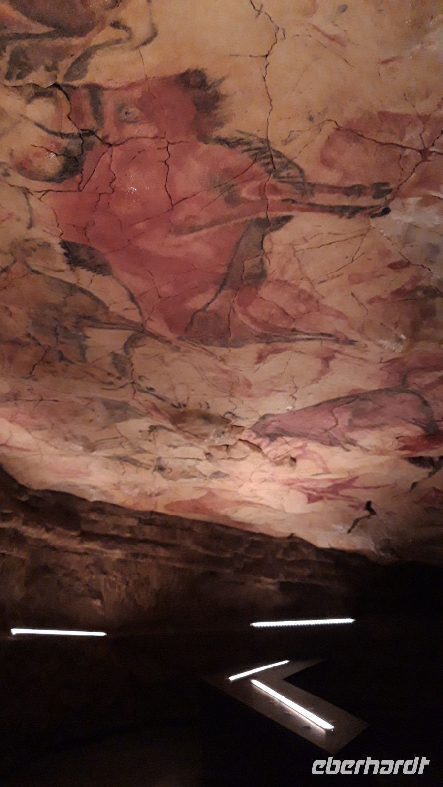 Unser nächstes Ziel ist nur wenige Minuten entfernt, entführt uns jedoch in die Altsteinzeit vor 20.000 Jahren. 1868 entdeckte der Heimatforscher Marcelino Sanz de Sautola in Altamira eine der ersten von mittlerweile 125 entdeckten, ausgemalten altsteinzeitlichen Höhlen in Spanien. Was man zunächst für eine Fälschung hielt, entpuppte sich Anfang des 20. Jahrhunderts als „Sixtinische Kapelle der Felsenmalerei“, denn man fand auf einer Fläche von 5500m² über 930 Darstellungen von Tieren und Menschen, die mit Kohle und Erdfarben auf den Stein gemalt wurden. Nachdem die Höhle zum immer größeren Touristenmagneten wurde, musste man in den 1970er Jahren die Notbremse ziehen und den Zugang drastisch beschränken, damit das Kulturerbe nicht weiterhin unwiederbringlichen Schäden ausgesetzt würde. Man entschloss sich, eine originalgetreue Nachbildung anzufertigen, um der Öffentlichkeit wieder Zugang zu ermöglichen. Bei der Besichtigung sind wir beeindruckt von der 1.500m² großen „Ersatzhöhle“ und sind der Überzeugung, dass wir den Unterschied vermutlich nicht bemerkt hätten, wenn wir nicht Bescheid gewusst hätten.