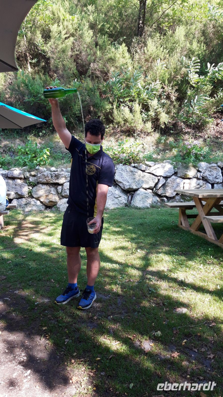 Am Nachmittag geht es für uns dann mit dem Bus weiter hinein ins Kantabrische Gebirge und schon bald haben wir den Nationalpark Picos de Europa erreicht. Die „Spitzen Europas“ waren das, was die Seefahrer einst als erstes sehen konnten, wenn sie von ihren langen Fahrten zurückkamen. Auf engen Serpentinen schlängelt sich unser Bus langsam bergauf, während wir uns von Hape Kerkeling über seine Erfahrungen vom Jakobsweg erzählen lassen. Nach einer guten Stunde erreichen wir den Ort Arenas de Cabrales, der trotz aller Abgeschiedenheit in der Welt der Gourmets einen gewissen Bekanntheitsgrad genießt. Seit Jahrhunderten wird hier in mühevoller Handarbeit der Cabrales Käse Hauptsächlich aus Schaf- und Ziegenmilch hergestellt, der anschließend in den umliegenden Berghöhlen reift. In der Käserei El Cabriteru dürfen wir nicht nur alle Schafe und Ziegen persönlich kennenlernen und eine Menge über sie erfahren, sondern natürlich auch die prämierten Blauschimmelkäse verkosten. Dazu serviert uns Juanjo den typischen Apfelwein, den Sidra, der im höchstmöglichen Bogen in die Gläser eingeschenkt werden soll, um den perfekten Geschmack zu entfalten. Wir sind uns zwar nicht sicher, wie nötig das wirklich ist, aber ein Schauspiel ist es allemal.