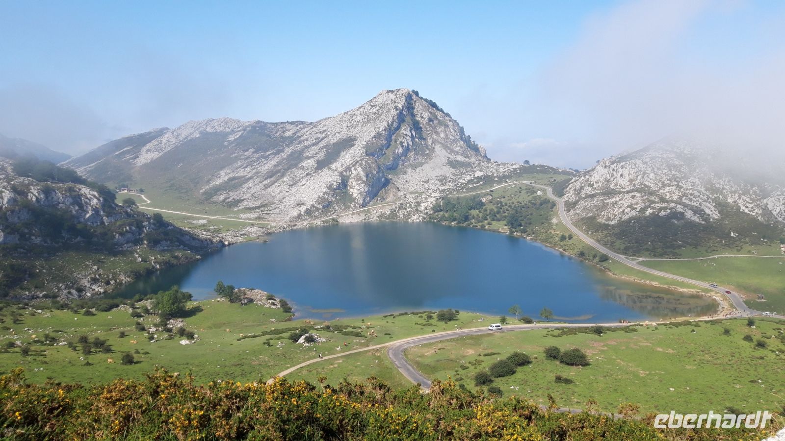Das eigentliche Highlight folgt allerdings noch: im Kleinbus fahren wir die Serpentinenstraßen weiter hinauf bis auf 1.100 Meter. Dort, mitten im Nationalpark, liegen, getrennt durch einen kleinen Berg, pittoresk die beiden Seen Enol und Ercina, die durch Gletscherauswaschungen in der letzten Eiszeit entstanden sind. Bei unserer Ankunft finden wir uns wortwörtlich über den Wolken wieder, doch nach einigen Minuten wird die Sicht immer klarer und die Sonne bricht durch den Nebel. Nach einem kurzen Aufstieg können wir vom Mirador Entre Lagos aus einen herrlichen Panoramablick auf beide Seen und die umliegenden Berge genießen. Nach einer kleinen Stärkung auf der Berghütte geht es dann mit einem kleinen Zwischenstop am Mirador de La Reina wieder bergab. Als zusätzliche Schikane gibt es auch, gleich wie bei der Auffahrt, wieder einen tierischen Stau – die Kühe und Schafe, die hier frei weiden können, sind wenig beeindruckt von dem touristischen Verkehrsaufkommen und verlassen die Fahrbahn nur dann, wenn sie Lust dazu haben.