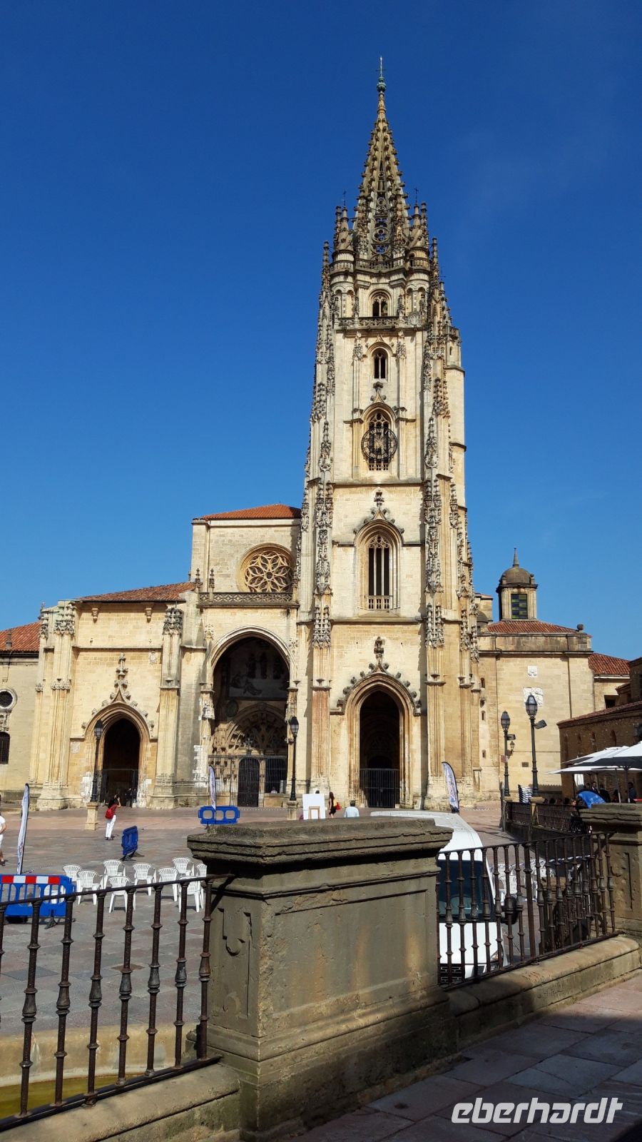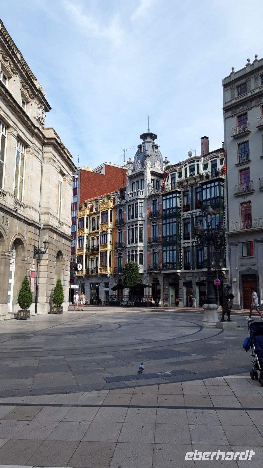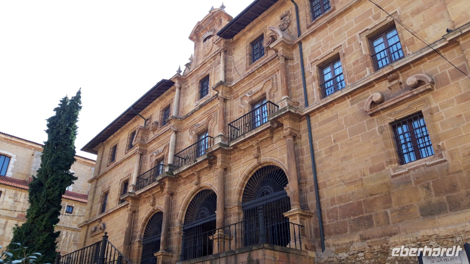 Zurück in Covadonga werden wir abgeholt von Rafa und die Fahrt geht nun weiter in die Hauptstadt Asturiens, Oviedo. Wir treffen Stadtführerin Elena und fahren zusammen weiter auf den Hausberg Naranco. Von dort hat man nicht nur eine fantastische Sicht auf die Stadt, dort befinden sich auch zwei der wichtigsten vorromanischen Bauwerke der spanischen Kunstgeschichte: Santa María del Naranco und San Miguel de Lillo. Ausführlich erklärt uns Elena die architektonischen Besonderheiten, bevor wir in die Stadt hinunter fahren und dort einen gemeinsamen Spaziergang machen. Als Hauptstadt des Königreichs Asturien und Zentrum des Widerstands gegen die maurische Herrschaft auf der iberischen Halbinsel war Oviedo Ausgangsort des ersten und „originalen“ Pilgerwegs nach Santiago de Compostela. Auf 310 anspruchsvollen Kilometern führt der Camino Primitivo mitten durch das Kantabrische Gebirge und ist damit so anspruchsvoll, dass nur 4% der Pilger diesen Weg wählen. Unser Spaziergang durch die schöne Altstadt Oviedos ist weitaus angenehmer und neben der Kathedrale San Salvador sehen wir auch die Plaza de Daoíz y Velarde mit ihren farbenfrohen Häusern sowie die Jugendstilhäuser der Neustadt aus dem 19. Jahrhundert. Wir spazieren dann zusammen durch den Stadtpark und auf dem Rückweg zum Bus führt uns Elena dann noch zur Bäckerei Camilo de Blas: nicht nur deren Mandeltörtchen sind über die Stadtgrenzen hinaus bekannt, sondern auch die von 1914 original erhaltene Inneneinrichtung des Geschäfts einfach unglaublich schön.