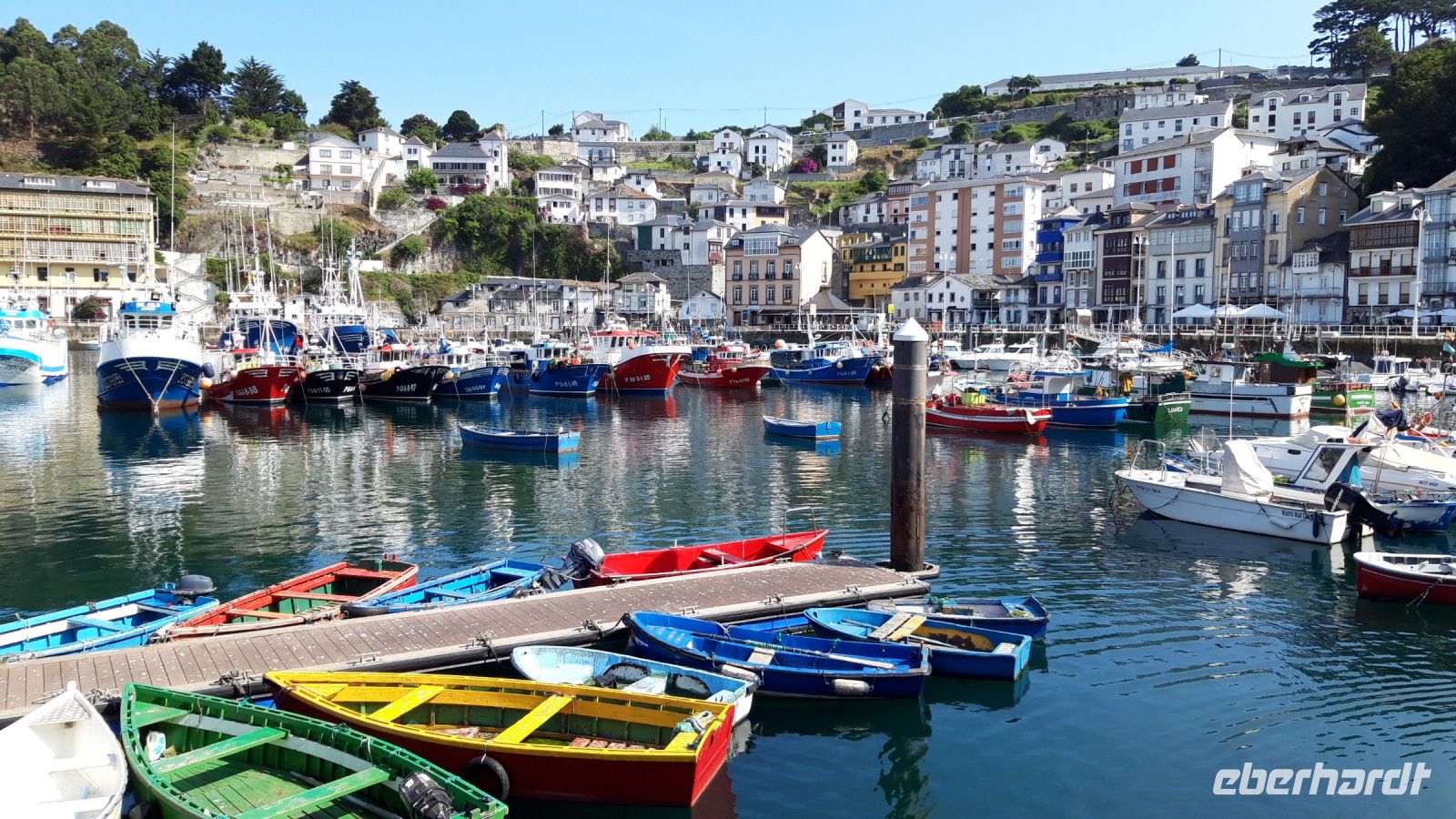 Aus der Not kann man allerdings auch eine Tugend machen und so nehmen wir uns am Vormittag Zeit, außerplanmäßig die asturische Küste ein wenig ausführlicher zu Erkunden. Mithilfe unseres Chauffeurs Rafa sind auch schnell zwei Ziele ausgewählt. Zunächst fahren wir zu dem kleinen Fischerdorf Cudillero, das sich malerisch in die Steilküste hineinschmiegt, und ein wenig aussieht wie ein unbekanntes Partnerörtchen der Cinque Terre in Italien. Über zahlreiche Treppen und Aufgänge steigen wir zu mehreren Aussichtspunkten hinauf und erkunden die Nachbarschaft. Im Anschluss geht es weiter nach Luarca, wo wir am schönen Hafen mit bunten Fischerbooten eine Mittagpause einlegen. Dann geht es schließlich endlich weiter in Richtung Kathedralenstrand.