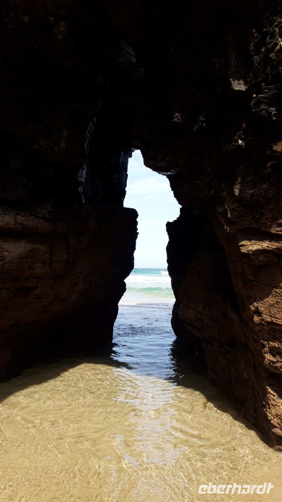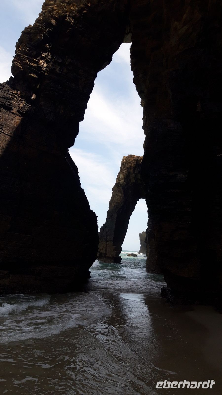 Als wir die Praia as Catedrais (jetzt also galicisch) erreichen, sehen wir zu unserer Erleichterung schnell, dass sich das Warten gelohnt hat. Ein gutes Stück des Strandes, und somit auch viele der aus dem Schiefer gewaschenen Höhlen und Türme, ist jetzt begehbar und wir können uns