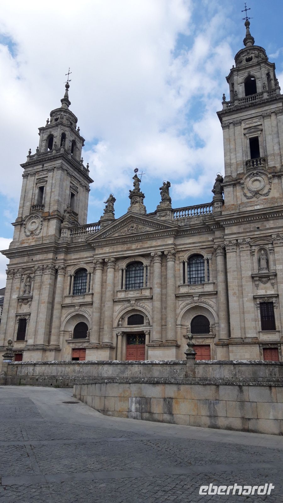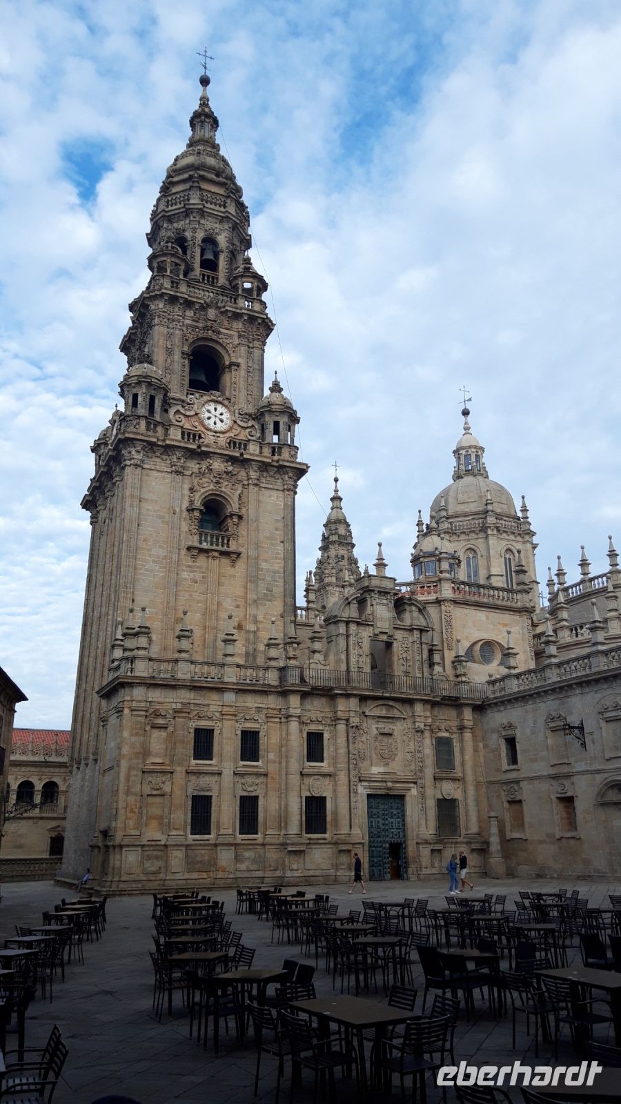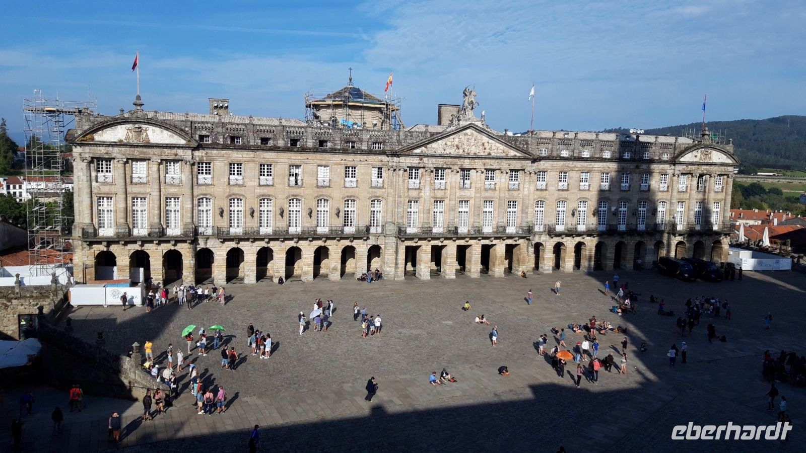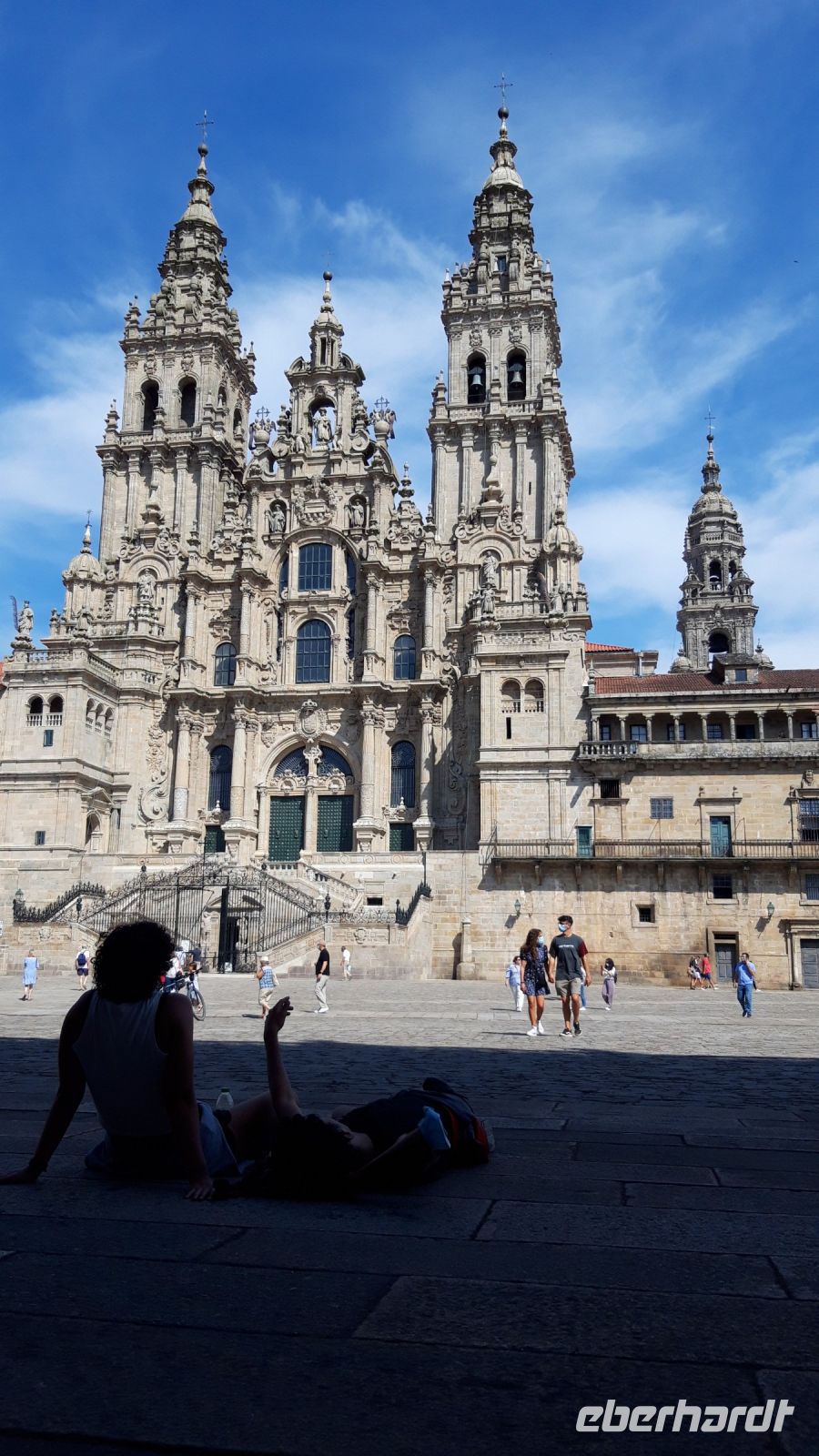 Für die Pilger geht es nun bergab und durch die Randbezirke des modernen Santiagos und dann durch das Viertel San Lazaro in die Altstadt hinein. Nach einer guten Stunde Fußmarsch betreten wir durch die Pilgerpforte und unter Begleitung typisch galicischer Dudelsackmusik die Praza do Obradorio vor der Kathedrale. Im ersten Moment erscheint der Dudelsackspieler sehr befremdlich n Spanien, allerdings beruft sich Galicien sehr stark auf seine keltischen Einflüsse und hat somit, genau wie Schottland, Irland und die Bretagne, das Blasinstrument in den letzten Jahrzehnten immer mehr für sich beansprucht.