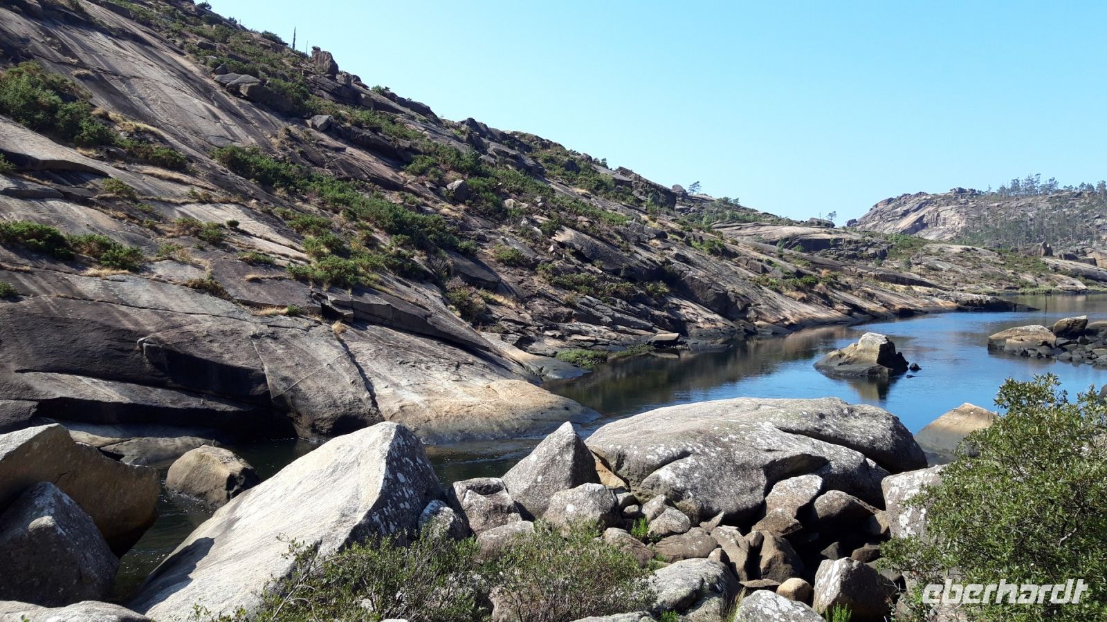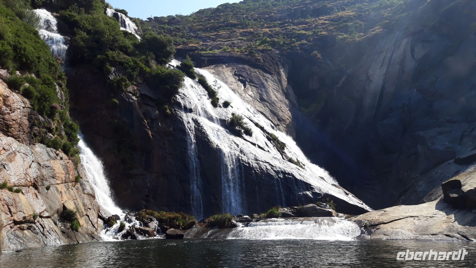 Wir folgen anschließend der Küste Richtung Süden und fahren durch viele kleine Fischerdörfer, die zum Teil relativ verlassen, zum Teil komplett auf Sommertourismus umorientiert erscheinen. In Ézaro gibt es zudem einen sehr imposanten Wasserfall zu sehen, kurz bevor der Fluss Xallas in den Atlantik mündet. Im Hintergrund kann man den Berg Pindo erkennen, der in der galicischen Mythologie etwas Ähnliches darstellt wie der Olymp für die Griechen.