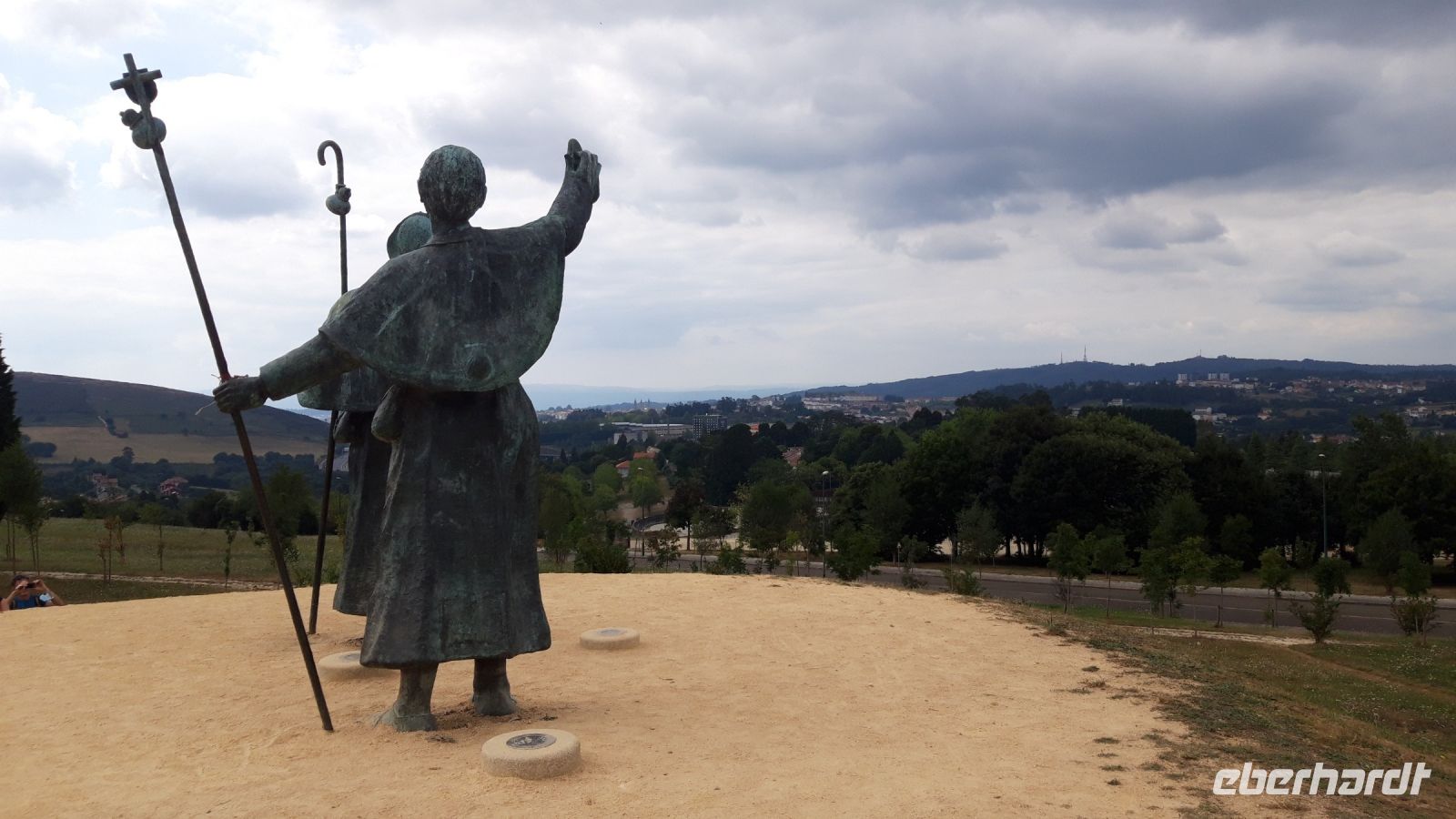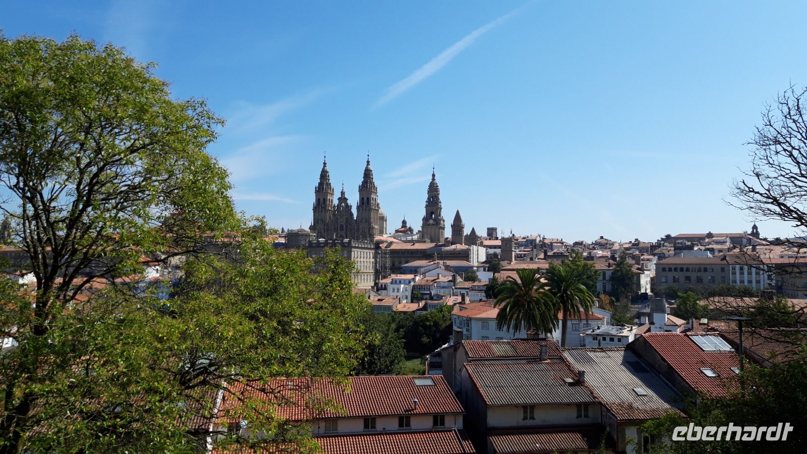Am frühen Nachmittag brechen wir auf zu unserem verbleibenden „Pilger“weg Richtung Santiago. Wie die echten Pilger legen auch wir einen Stopp vor den Toren der Stadt am Monte do Gozo („Berg der Freude“) ein. Von hier aus kann man zum ersten Mal die Türme der Kathedrale von Santiago sehen. Wenn man schon knapp 800 Kilometer zu Fuß zurückgelegt hat, muss es ein überwältigendes Gefühl sein, das Ziel endlich buchstäblich vor Augen zu haben. Angesteckt von der Euphorie entscheidet sich der Großteil der Gruppe, die letzten vier Kilometer des Jakobswegs auch zu Fuß zurückzulegen. Der Rest wird von Rafa direkt zum Hotel chauffiert.
