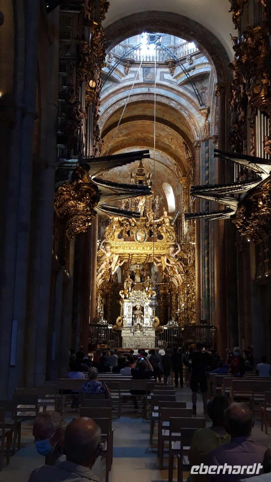 Die Kirche selbst ist schon alleine deswegen beeindruckend, weil sich im Innenraum noch genau die verschiedenen Architekturepochen erkennen lassen. Die imposante Barockfassade wurde um das romanische Kirchenschiff herumgebaut und so die gesamte Originalstruktur erhalten. Im Gegensatz dazu steht der opulente, über und über mit Gold dekorierte, barocke Hochaltar. Im Vierungskreuz können wir auch den 53 kg schweren Weihrauchkessel, den Botafumeiro, sehen, der zu bestimmten Gottesdiensten durch das Querschiff geschwenkt wird. Ursprünglich war das keine Effekthascherei, sondern vor allem dafür da, um den Weihrauchgeruch möglichst effektiv zu verteilen – denn eine Masse mittelalterlicher Pilger verströmte – wie man sich vorstellen kann – nicht gerade die angenehmsten Düfte. Wer möchte, kann nun zur Pilgermesse bleiben, für den Rest der Gruppe geht es hinaus in die Altstadt, wo wir zunächst eine kleine Kaffeepause einlegen und anschließend mit Christian noch ein wenig durch die Stadt schlendern. Er zeigt uns die Markthallen mit allen kulinarischen Besonderheiten, sowie das umliegende Universitätsviertel.