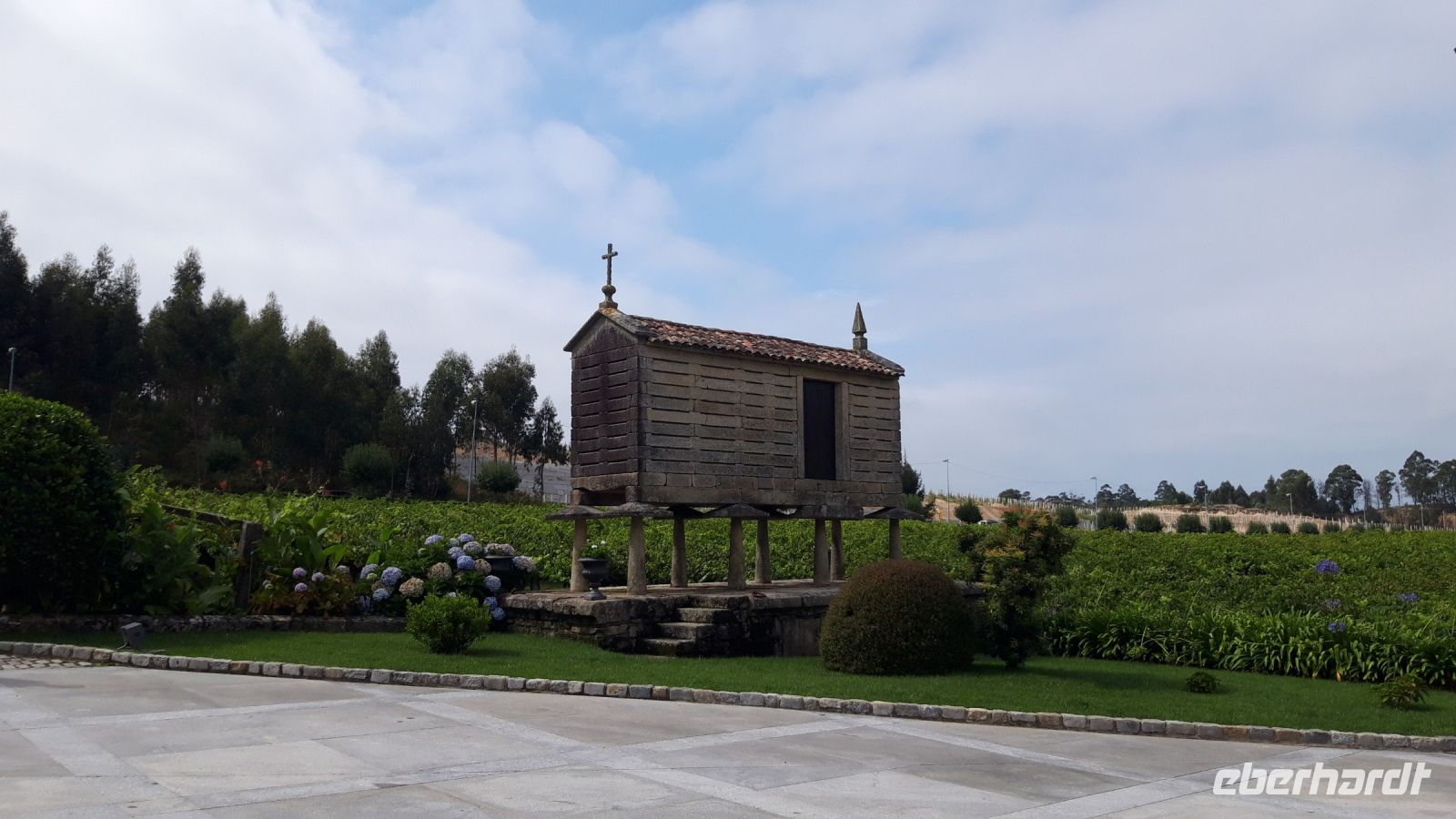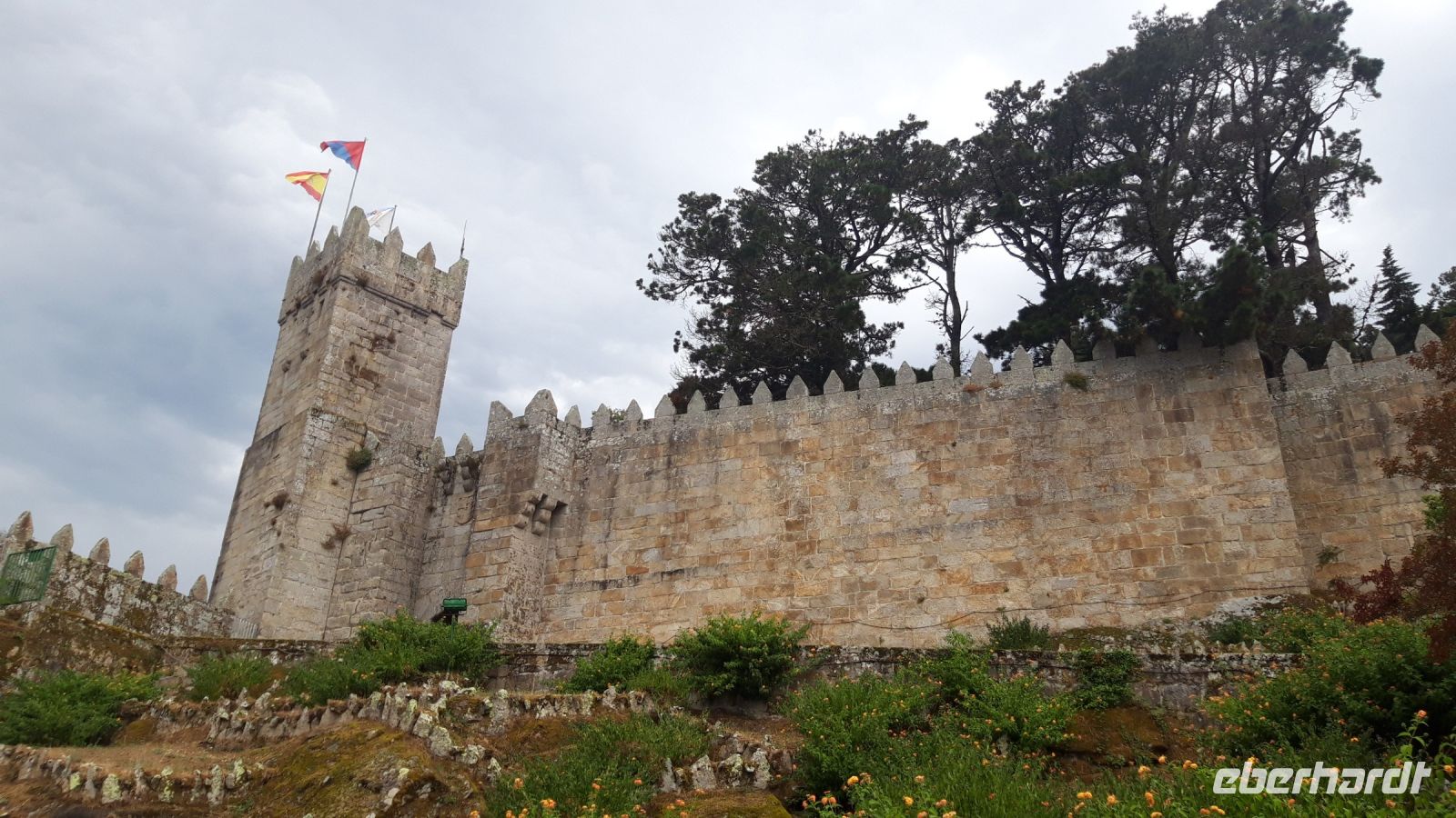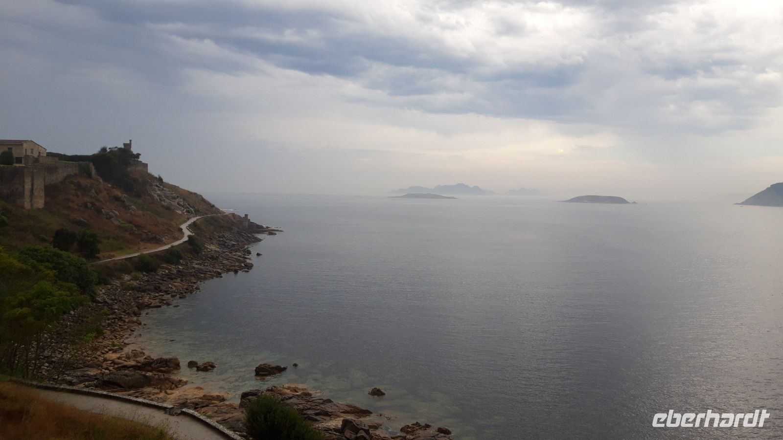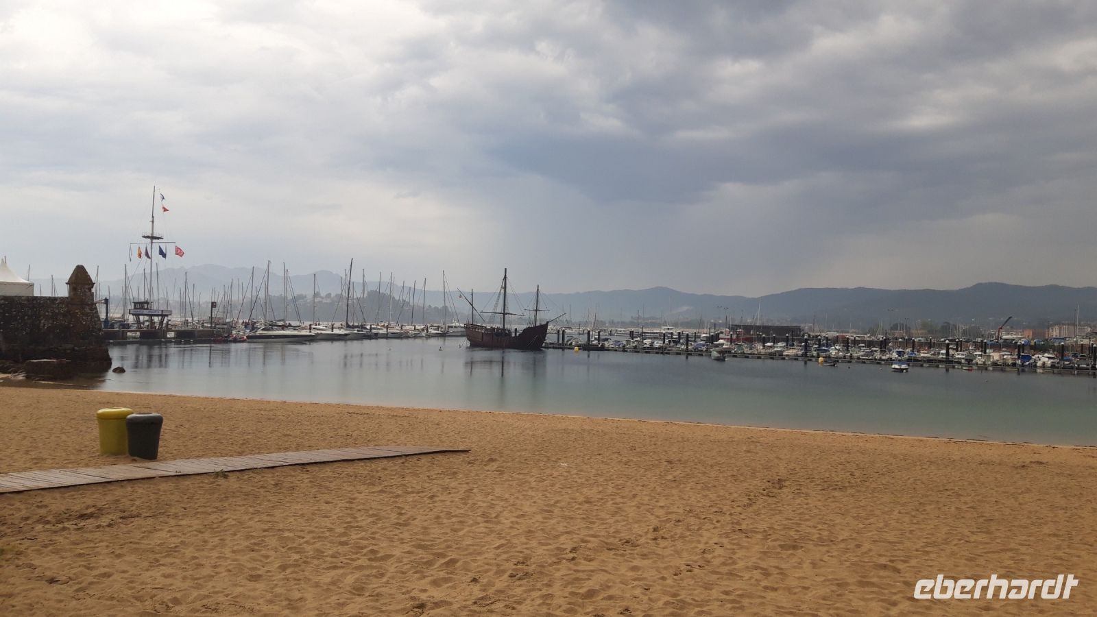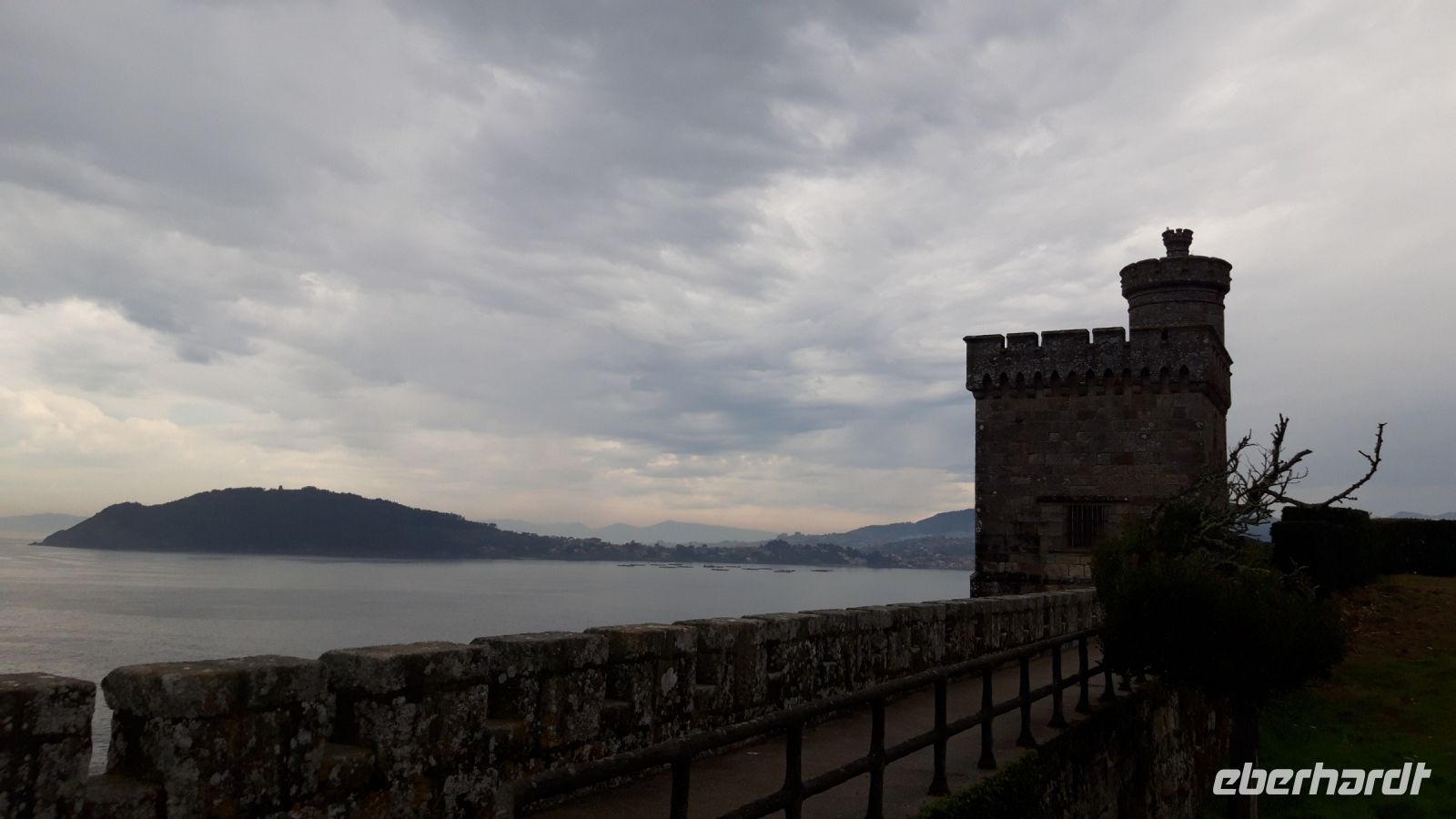 Baiona ist ein Kleinstädtchen, das sich pittoresk an die zerklüftete Küste schmiegt und sich durch seine vorgelagerte grüne Halbinsel auszeichnet, auf der sich einst das Castelo de Monte Real befand. Dieses diente im Mittelalter und in der frühen Neuzeit vor allem zur Abwehr von Seeangriffen, denn die Stadt genoss königliche Privilegien und den damit einhergehenden Wohlstand. Hier soll auch im März 1493, unter dem Kommando Martín Alonso Pinzóns, die Pinta, das letzte Schiff der Flotte Kolumbus, eingelaufen sein und die Kunde über die Entdeckung – vermeintlich – Westindiens verbreitet haben. Das ehemalige Kastell wurde in den 1960er Jahren zu einem Parador, einem staatlich subventionierten Luxushotel, umgewandelt und bietet heute mit dem umliegenden Park eine ideale Gelegenheit für einen schönen Spaziergang. Zu unserer Freude bleibt das Wetter nach ein paar anfänglichen Regentropfen stabil und wir können ein dramatisch-schönes Küstenpanorama genießen.