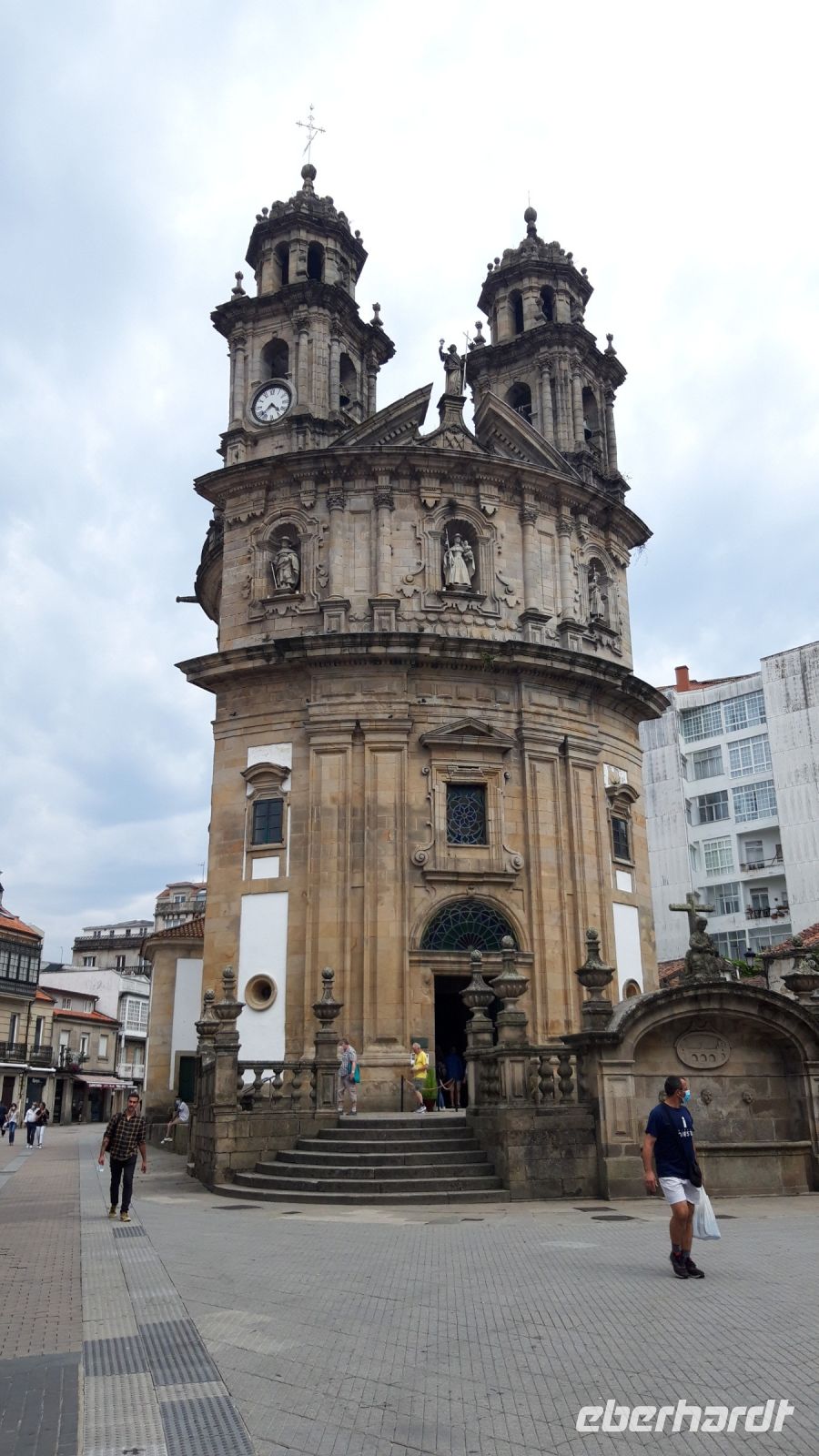Auf dem Weg zu unserem Hotel auf der Ferieninsel La Toja machen wir, so wie es sich für echte Pilger auf dem Camino Portugès gehört, noch Halt in Pontevedra. Die Provinzhauptstadt war schon im Mittelalter eine der wichtigsten Zwischenetappen auf dem Weg nach Santiago de Compostela. Die dort angesiedelten Franziskaner und Dominikaner kümmerten sich um die Pilger, boten ihnen Verpflegung und einen Schlafplatz, lange bevor es überall Herbergen gab. Aus diesem Grund baute man auch im 18. Jahrhundert das eigenwillige Heiligtum der Virgen Peregrina, also der pilgernden Jungfrau. Maria wird hier tatsächlich in Pilgertracht gezeigt, während der barocke Bau auf dem Grundriss einer Jakobsmuschel steht. Auch sonst ist die kleine Altstadt recht einladend und so entspannen wir ein wenig bei einer Tasse Kaffee auf der Plaza.